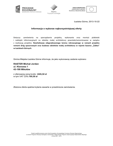 Łaziska Górne, 2013-10-22 Informacja o wyborze najkorzystniejszej oferty Dotyczy: zamówienia na sporządzenie projektu, wykonanie oraz montaż plakietek i naklejek informacyjnych na obiekty małej architektury powstałe/zamontowane w związku z realizacją projektu: Rewitalizacja zdegradowanego terenu rekreacyjnego w ramach projektu remont dróg spacerowych oraz budowa obiektów małej architektury w rejonie basenu „Żabka” w Łaziskach Górnych. Gmina Miejska Łaziska Górne informuje, że jako wykonawcę zadania wybrano: RASTER Michał Jordan ul. Klonowa 1 43-190 Mikołów z oferowaną ceną brutto: 1045,50 zł w tym VAT 23%:195,50 zł Złożona oferta spełnia kryteria zawarte w przedmiocie zamówienia. Projekt współfinansowany przez Unię Europejską z Europejskiego Funduszu Rozwoju Regionalnego w ramach Programu Rozwoju Subregionu Centralnego Regionalnego Programu Operacyjnego Województwa Śląskiego na lata 2007 - 2013