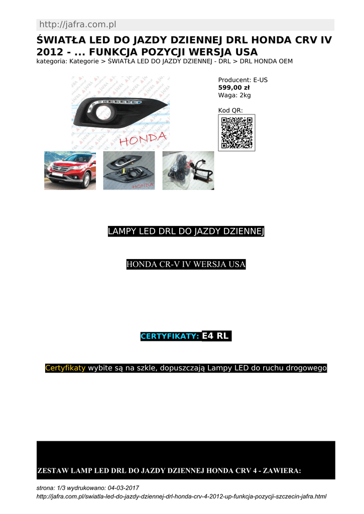 http://jafra.com.pl ŚWIATŁA LED DO JAZDY DZIENNEJ DRL HONDA CRV IV 2012 - ... FUNKCJA POZYCJI WERSJA USA kategoria: Kategorie > ŚWIATŁA LED DO JAZDY DZIENNEJ - DRL > DRL HONDA OEM Producent: E-US 599,00 zł Waga: 2kg Kod QR: LAMPY LED DRL DO JAZDY DZIENNEJ HONDA CR-V IV WERSJA USA CERTYFIKATY: E4 RL Certyfikaty wybite są na szkle, dopuszczają Lampy LED do ruchu drogowego ZESTAW LAMP LED DRL DO JAZDY DZIENNEJ HONDA CRV 4 - ZAWIERA: strona: 1/3 wydrukowano: 04-03-2017 http://jafra.com.pl/swiatla-led-do-jazdy-dziennej-drl-honda-crv-4-2012-up-funkcja-pozycji-szczecin-jafra.html 1. Dwie Lampy Led DRL 6000 - 6700K - barwa bia?a zimna - Brak b??du na komputerze Error Free 2. Wi?zka pod??czeniowa z modu?em zasilaj?cym z funkcj? ( 2 opcje do wyboru ): - DRL ?wiat?a dzienne z funkcj? ?wiate? postojowych ( przygasaj? do postojówki ) - DRL ?wiat?a dzienne - tylko / funkcja g?ówna wg przepisów 3. Pisemna gwarancja wystawiana przez nasz? firm? - 1 rok 4. Oryginalne opakowanie 5. Zastosowanie: HONDA CRV / HONDA CR-V - wersja USA Oferowany Towar jest Nowy, Fabrycznie Zapakowany !!! Asortyment dost?pny od r?ki !!! strona: 2/3 wydrukowano: 04-03-2017 http://jafra.com.pl/swiatla-led-do-jazdy-dziennej-drl-honda-crv-4-2012-up-funkcja-pozycji-szczecin-jafra.html SPECYFIKACJA TECHNICZNA LAMP LED DRL : Marka / Model: HONDA CRV IV / HONDA CR-V 4 WERSJA USA Rok: Zasilanie: Czas pracy / Homologacja: Temp. barwy ?wiat?a: Funkcjonalno??: Technologia ?arówek: GWARANCJA LED DRL: 2012 - ... 12V - MODU? STERUJ?CY Do 50000h / Homologacja RL E4 wybita na Szkle Bia?y CCT 6000 - 6700K / New Samsung Chip 2323 High Power DRL ?wiat?o Dzienne / Pozycja LED 9szt 1 lampa DRL - du?a Jasno?? i Efektywno?? 12 miesi?cy rzetelnej gwarancji licz?c od daty zakupu Gwarancja jest wystawiana i rozpatrywana przez nasz? Firm? z siedzib? w Szczecinie strona: 3/3 wydrukowano: 04-03-2017 http://jafra.com.pl/swiatla-led-do-jazdy-dziennej-drl-honda-crv-4-2012-up-funkcja-pozycji-szczecin-jafra.html