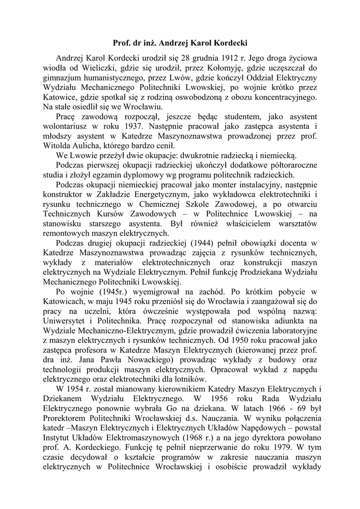 Prof. dr inż. Andrzej Karol Kordecki Andrzej Karol Kordecki urodził się 28 grudnia 1912 r. Jego droga życiowa wiodła od Wieliczki, gdzie się urodził, przez Kołomyję, gdzie uczęszczał do gimnazjum humanistycznego, przez Lwów, gdzie kończył Oddział Elektryczny Wydziału Mechanicznego Politechniki Lwowskiej, po wojnie krótko przez Katowice, gdzie spotkał się z rodziną oswobodzoną z obozu koncentracyjnego. Na stałe osiedlił się we Wrocławiu. Pracę zawodową rozpoczął, jeszcze będąc studentem, jako asystent wolontariusz w roku 1937. Następnie pracował jako zastępca asystenta i młodszy asystent w Katedrze Maszynoznawstwa prowadzonej przez prof. Witolda Aulicha, którego bardzo cenił. We Lwowie przeżył dwie okupacje: dwukrotnie radziecką i niemiecką. Podczas pierwszej okupacji radzieckiej ukończył dodatkowe półtoraroczne studia i złożył egzamin dyplomowy wg programu politechnik radzieckich. Podczas okupacji niemieckiej pracował jako monter instalacyjny, następnie konstruktor w Zakładzie Energetycznym, jako wykładowca elektrotechniki i rysunku technicznego w Chemicznej Szkole Zawodowej, a po otwarciu Technicznych Kursów Zawodowych – w Politechnice Lwowskiej – na stanowisku starszego asystenta. Był również właścicielem warsztatów remontowych maszyn elektrycznych. Podczas drugiej okupacji radzieckiej (1944) pełnił obowiązki docenta w Katedrze Maszynoznawstwa prowadząc zajęcia z rysunków technicznych, wykłady z materiałów elektrotechnicznych oraz konstrukcji maszyn elektrycznych na Wydziale Elektrycznym. Pełnił funkcję Prodziekana Wydziału Mechanicznego Politechniki Lwowskiej. Po wojnie (1945r.) wyemigrował na zachód. Po krótkim pobycie w Katowicach, w maju 1945 roku przeniósł się do Wrocławia i zaangażował się do pracy na uczelni, która ówcześnie występowała pod wspólną nazwą: Uniwersytet i Politechnika. Pracę rozpoczynał od stanowiska adiunkta na Wydziale Mechaniczno-Elektrycznym, gdzie prowadził ćwiczenia laboratoryjne z maszyn elektrycznych i rysunków technicznych. Od 1950 roku pracował jako zastępca profesora w Katedrze Maszyn Elektrycznych (kierowanej przez prof. dra inż. Jana Pawła Nowackiego) prowadząc wykłady z budowy oraz technologii produkcji maszyn elektrycznych. Opracował wykład z napędu elektrycznego oraz elektrotechniki dla lotników. W 1954 r. został mianowany kierownikiem Katedry Maszyn Elektrycznych i Dziekanem Wydziału Elektrycznego. W 1956 roku Rada Wydziału Elektrycznego ponownie wybrała Go na dziekana. W latach 1966 - 69 był Prorektorem Politechniki Wrocławskiej d.s. Nauczania. W wyniku połączenia katedr –Maszyn Elektrycznych i Elektrycznych Układów Napędowych – powstał Instytut Układów Elektromaszynowych (1968 r.) a na jego dyrektora powołano prof. A. Kordeckiego. Funkcję tę pełnił nieprzerwanie do roku 1979. W tym czasie decydował o kształcie programów w zakresie nauczania maszyn elektrycznych w Politechnice Wrocławskiej i osobiście prowadził wykłady najtrudniejsze: związane z ich budową, konstrukcją i technologią. Od jesieni 1979 roku całkowicie poświęcił się pracy naukowej. Pasji, jakiej się oddał, nie zaprzestał mimo przejścia na emeryturę w 1983 r. W 1958 roku na Wydziale Elektrycznym Politechniki Wrocławskiej obronił pracę doktorską z zakresu zastępczych metod nagrzewania maszyn indukcyjnych dużych mocy. Rok później został mianowany profesorem nadzwyczajnym, a w 1960 roku profesorem zwyczajnym. W swojej działalności dydaktycznej wykształcił dwa pokolenia inżynierów z zakresu budowy, konstrukcji i technologii maszyn elektrycznych. Zainteresowania Profesora Kordeckiego zawsze były zorientowane na przemysł elektromaszynowy. Od 1946 roku, równolegle do pracy na uczelni, zaangażował się w przemyśle maszyn elektrycznych: początkowo jako dyrektor zakładu remontowego transformatorów, następnie szef biura konstrukcyjnego Fabryki Wielkich Maszyn Elektrycznych (późniejszego DOLMELU), a dalej jako szef Wrocławskiego Oddziału Centralnego Biura Konstrukcyjnego Maszyn Elektrycznych. Zainteresowania naukowe Profesora wynikały z działalności inżynierskiej w przemyśle. Dotyczyły one przede wszystkim zagadnień konstrukcyjnych, technologicznych i materiałowych maszyn elektrycznych, przy czym początkowo koncentrowały się one na największych maszynach prądu stałego i maszynach asynchronicznych; później Profesor zajął się maszynami małymi o niekonwencjonalnych magnetowodach, wykonywanymi z kompozytów proszkowych magnetycznie miękkich i twardych. Problematyka ta była nie tylko przedmiotem intensywnych badań teoretycznych i doświadczalnych, ale stanowiła prawdziwe hobby Profesora. Do ważniejszych osiągnięć naukowych Profesora można zaliczyć m. in. doskonalenie konstrukcji i metod projektowania maszyn prądu stałego oraz maszyn specjalnych, nagrzewania silników asynchronicznych metodą obciążeń zastępczych, poszukiwanie nowych struktur materiałowych i badanie miękkich kompozytów proszkowych oraz ich zastosowania w budowie przetworników elektromechanicznych. Wyniki swoich prac Profesor opublikował w 6 książkach i skryptach, 110 publikacjach dużej rangi światowej i krajowej, 14 patentach oraz wielu opracowaniach dla przemysłu. Swoją pasję naukową przekazał wielu uczniom. Wypromował 17 doktorów, z których wielu jest doktorami habilitowanymi i profesorami. Był autorem wielu recenzji wydawniczych książek i monografii, opinii wielu rozpraw doktorskich i habilitacyjnych oraz tytułów profesorskich. Aktywnie uczestniczył w działalności w wielu organizacji społecznych i naukowych: Sekcji Maszyn Elektrycznych i Transformatorów Komitetu Elektrotechniki PAN, Wrocławskim Towarzystwie Naukowym, Stowarzyszeniu Elektryków Polskich, Polskim Towarzystwie Elektrotechniki Teoretycznej i Stosowanej (był współorganizatorem Oddziału Wrocławskiego tego Stowarzyszenia). Wiel
