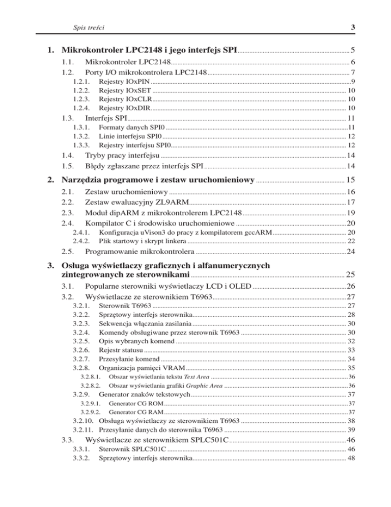 Spis treści 3 1. Mikrokontroler LPC2148 i jego interfejs SPI ................................................................... 5 1.1. 1.2. Mikrokontroler LPC2148........................................................................................................... 6 Porty I/O mikrokontrolera LPC2148 ..................................................................................... 7 1.2.1. 1.2.2. 1.2.3. 1.2.4. 1.3. Interfejs SPI................................................................................................................................... 11 1.3.1. 1.3.2. 1.3.3. 1.4. 1.5. Rejestry IOxPIN ........................................................................................................................9 Rejestry IOxSET .................................................................................................................... 10 Rejestry IOxCLR .................................................................................................................... 10 Rejestry IOxDIR ..................................................................................................................... 10 Formaty danych SPI0 .............................................................................................................11 Linie interfejsu SPI0 .............................................................................................................. 12 Rejestry interfejsu SPI0......................................................................................................... 12 Tryby pracy interfejsu ............................................................................................................... 14 Błędy zgłaszane przez interfejs SPI ..................................................................................... 14 2. Narzędzia programowe i zestaw uruchomieniowy ..................................................... 15 2.1. 2.2. 2.3. 2.4. Zestaw uruchomieniowy .......................................................................................................... 16 Zestaw ewaluacyjny ZL9ARM.............................................................................................. 17 Moduł dipARM z mikrokontrolerem LPC2148 .............................................................. 19 Kompilator C i środowisko uruchomieniowe .................................................................. 20 2.4.1. 2.4.2. 2.5. Konfiguracja uVison3 do pracy z kompilatorem gccARM ............................................ 20 Plik startowy i skrypt linkera ............................................................................................... 22 Programowanie mikrokontrolera .......................................................................................... 24 3. Osługa wyświetlaczy graficznych i alfanumerycznych zintegrowanych ze sterownikami ............................................................................................ 25 3.1. 3.2. Popularne sterowniki wyświetlaczy LCD i OLED ........................................................ 26 Wyświetlacze ze sterownikiem T6963................................................................................ 27 3.2.1. 3.2.2. 3.2.3. 3.2.4. 3.2.5. 3.2.6. 3.2.7. 3.2.8. Sterownik T6963 .................................................................................................................... 27 Sprzętowy interfejs sterownika............................................................................................ 28 Sekwencja włączania zasilania ............................................................................................ 30 Komendy obsługiwane przez sterownik T6963 ............................................................... 30 Opis wybranych komend ...................................................................................................... 32 Rejestr statusu ......................................................................................................................... 33 Przesyłanie komend ............................................................................................................... 34 Organizacja pamięci VRAM ................................................................................................ 35 3.2.8.1. 3.2.8.2. Obszar wyświetlania tekstu Text Area ..................................................................................36 Obszar wyświetlania grafiki Graphic Area ..........................................................................36 3.2.9. Generator znaków tekstowych ............................................................................................. 37 3.2.9.1. Generator CG ROM ..............................................................................................................37 3.2.9.2. Generator CG RAM ..............................................................................................................37 3.2.10. Obsługa wyświetlaczy ze sterownikiem T6963 ............................................................... 38 3.2.11. Przesyłanie danych do sterownika T6963 ......................................................................... 39 3.3. Wyświetlacze ze sterownikiem SPLC501C ...................................................................... 46 3.3.1. 3.3.2. Sterownik SPLC501C ........................................................................................................... 46 Sprzętowy interfejs sterownika............................................................................................ 48 4 Spis treści 3.3.3. Pamięć RAM ........................................................................................................................... 48 3.3.3.1. 3.3.4. 3.3.5. 3.3.6. 3.3.7. 3.4. Wyświetlacze ze sterownikiem ST7036 ............................................................................. 61 3.4.1. 3.4.2. 3.4.3. 3.4.4. 3.4.5. 3.4.6. 3.4.7. 3.5. Sterownik NJU6450..