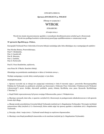 CZWARTA SEKCJA Sprawa RYCHLICCY p. POLSCE (Skarga nr 51599/99 ) WYROK STRASBURG 18 maja 2004 r. Wyrok ten stanie się prawomocny zgodnie z warunkami określonymi przez artykuł 44 § 2 Konwencji. Wyrok ten podlega korekcie wydawniczej przed jego opublikowaniem w ostatecznej wersji W sprawie Rychliccy p. Polsce, Europejski Trybunał Praw Człowieka (Czwarta Sekcja) zasiadając jako Izba składająca się z następujących sędziów: Pan Nicolas Bratza, Przewodniczący, Pani V. Strážnická, Pan J. Casadevall, Pan R. Maruste, Pan L. Garlicki, Pan S. Pavlovschi Pani E. Fura-Sandström, sędziowie, oraz Pana M. O’Boyle, Kanclerz Sekcji, Obradując na posiedzeniu zamkniętym w dniu 27 kwietnia 2004 r., Wydaje następujący wyrok, który został przyjęty w tym dniu: POSTĘPOWANIE 1. Sprawa wywodzi się ze skargi (nr 51599/99) wniesionej w dniu 8 stycznia 1999 r. przeciwko Rzeczypospolitej Polskiej do Trybunału na podstawie artykułu 34 Konwencji o Ochronie Praw Człowieka i Podstawowych Wolności („Konwencja”) przez dwójkę obywateli polskich, panią Jolantę Rychlicką oraz pana Ryszarda Rychlickiego (“skarżący”). 2. Rząd Polski reprezentowany był przez swojego Pełnomocnika, pana J. Wołąsiewicza. 3. Skarżący zarzucali, inter alia, w oparciu o artykuł 6 § 1 Konwencji, że postępowanie odszkodowawcze w ich sprawie trwało zbyt długo. 4. Skargi zostały przydzielona Czwartej Sekcji Trybunału (artykuł 52 § 1 Regulaminu Trybunału). Wewnątrz tej Sekcji ustanowiono Izbę (artykuł 27 § 1 Konwencji), która miała zająć się sprawą zgodnie z artykułem 26 § 1 Regulaminu Trybunału. 5. Decyzją z dnia 7 maja 2002 r. Trybunał uznał skargi za częściowo dopuszczalne. 6. Skarżący oraz Rząd przedłożyli stanowiska co do meritum (artykuł 59 § 1 Regulaminu Trybunału). 7. Dnia 1 listopada 2001 r. Trybunał zmienił skład Sekcji (artykuł 25 § 1 Regulaminu). Niniejsza sprawa została przydzielona do nowo utworzonej Czwartej Sekcji (artykuł 52 § 1 Regulaminu Trybunału). FAKTY I. OKOLICZNOŚCI SPRAWY 8. Skarżący są małżeństwem mieszkającym w Goleniowie. 9. Dnia 2 października 1988 r. skarżący został poważnie ranny w wypadku samochodowym w czasie pełnienia zawodowej służby wojskowej w jednostce w G. Dnia 3 listopada 1988 r. śledztwo w sprawie wypadku zostało umorzone z powodu śmierci kierowcy, który spowodował wypadek. 10. W wyniku wypadku, skarżący stał się niepełnosprawny. Dnia 14 grudnia 1989 r. wojskowa komisja zdrowotna oceniła, że skarżący doznał 100 % uszczerbku na zdrowiu. Utracił mowę, stał się tetraplegikiem (osoba z porażeniem czterokończynowym) i cierpi na depresję. Dnia 10 kwietnia 1990 r. skarżący przestał pracować w wojsku. 11. Dnia 23 listopada 1992 r. jednostka wojskowa G. poinformowała Państwowy Zakład Ubezpieczeń (dalej jako PZU) o wypadku oraz zwróciła się o informację co do możliwych świadczeń ubezpieczeniowych, jakie mogły należeć się skarżącemu. 12. Dnia 2 lutego 1993 r. skarżąca, działając także w imieniu męża, złożyła do Sądu Wojewódzkiego w Szczecinie pozew o odszkodowanie przeciwko jednostce G. oraz przeciwko oddziałowi ZUS w Stargardzie Szczecińskim. Domagała się także przyznania jej comiesięcznego zasiłku, ponieważ musiała zrezygnować z pracy w celu sprawowania pełnej opieki nad mężem. Przedłożyła pełnomocnictwo sporządzone przez jej męża. Dnia 12 maja 1993 r. sąd wezwał skarżącego do sprecyzowania strony pozwanej. 13. Dnia 11 czerwca 1993 r. Sąd Wojewódzki w Szczecinie zwolnił skarżących z opłat sądowych. 14. Dnia 23 lutego 1994 r. skarżący zwrócili się do sądu o wyznaczenie w sprawie terminu rozprawy. 15. Dnia 8 grudnia 1994 r. sąd zarządził doręczenie pozwanym odpisów pozwu. 16. Dnia 29 grudnia 1994 r. drugi pozwany, oddział ZUS w Stargardzie Szczecińskim, złożył do sądu odpowiedź na pozew. Dnia 5 stycznia 1995 r. jednostka wojskowa G. przedłożyła do sądu swoją odpowiedź na pozew skarżących, a dnia 10 stycznia 1995 r. dalsze pismo procesowe. Dnia 21 stycznia 1995 r. sąd zwrócił się do skarżącego o zajęcie stanowiska wobec odpowiedzi na pozew. 17. Dnia 15 marca 1995 r. oddział ZUS w Stargardzie Szczecińskim zwrócił się do sądu o wezwanie do udziału w sprawie w charakterze pozwanego oddziału ZUS w Goleniowie. 18. Dnia 10 kwietnia 1995 r. skarżący zawarli ugodę z oddziałem ZUS w Goleniowie, zgodnie z którą mieli otrzymać kwotę 20.000 zł oraz comiesięczną rentę. 19. Dnia 15 listopada 1995 r. sąd wezwał oddział ZUS w Goleniowie do wzięcia udziału w postępowaniu w charakterze pozwanego. Dnia 16 stycznia 1996 r. pozew został doręczony trzeciemu pozwanemu. Dnia 19 lutego 1996 r. oddział ZUS w Goleniowie przedłożył pismo procesowe, w którym domagał się umorzenia postępowania przeciwko niemu, mając na uwadze ugodę z dnia 10 kwietnia 1995 r. 20. Dnia 12 kwietnia 1996 r. sąd postanowił, że skarżącemu zostanie doręczona odpowiedź na pozew i wyznaczył termin rozpraw na dzień 4 lipca 1996 r. 21. Dnia 13 maja 996 r. skarżący zwrócili się do Sądu Wojewódzkiego w Szczecinie o przekazanie sprawy do prowadzenia, z uwagi na inwalidztwo skarżącego, Sądowi Rejonowemu w Goleniowie, który znajdował się w ich sąsiedztwie. Dnia 17 lipca 1995 r. Sąd Wojewódzki w Szczecinie poinformował skarżących, że zgodnie z obowiązującymi przepisami prawa sprawa musi być prowadzona przed Sądem Wojewódzkim w Szczecinie. Sąd ten był kompetentny do rozpatrzenia sprawy z uwagi na wysokość kwoty roszczenia. 22. Dnia 25 lipca 1996 r. przeprowadzona została pierwsza rozprawa. Sąd umorzył postępowanie w stosunku do oddziału ZUS w Goleniowie i zwrócił się do skarżących o sprecyzowanie ich roszczenia w stosunku do oddziału ZUS w Stargardzie. Sąd uwzględnił także wniosek skarżących o ustanowienie im adwokata z urzędu. Dnia 20 sierpnia 1996 r. miejscowa rada ad