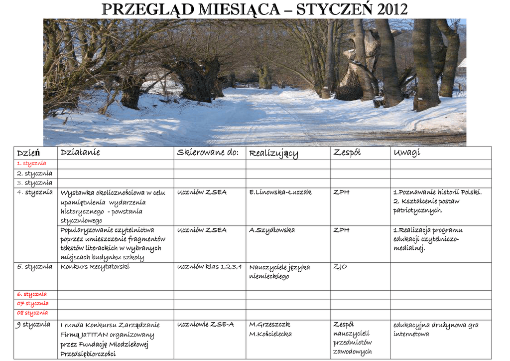 PRZEGLĄD PRZEGL D MIESIĄCA MIESI CA – STYCZEŃ STYCZE 2012 Dzień Dzie Działanie Skierowane do: Realizujący Realizuj cy Zespół Uwagi Wystawka okolicznościowa okoliczno ciowa w celu upamiętnienia upami tnienia wydarzenia historycznego - powstania styczniowego styczniowego Popularyzowa Popularyzowanie czytelnictwa poprzez umieszczenie fragmentów tekstów literackich literackich w wybranych miejscach budynku szkoły Konkurs Recytatorski Uczniów ZSEA E.LinowskaE.Linowska-Łuczak ZPH 1.Poznawanie historii Polski. 2. Kształcenie postaw patriotycznych. Uczniów ZSEA A.Szydłowska ZPH 1.Realizacja 1.Realizacja programu edukacji czytelniczoczytelniczomedialnej. Uczniów klas 1,2, 1,2,3,4 Nauczyciele języka j zyka niemieckiego ZJO I runda Konkursu Zarządzanie Zarz dzanie Firmą Firm JaTITAN JaTITAN organizowany przez Fundację Fundacj Młodzieżowej Młodzie owej Przedsiębiorczo Przedsi biorczości biorczo ci Uczniowie ZSEZSE-A Zespół nauczycieli przedmiotów zawodowych 1. stycznia 2. stycznia 3. stycznia 4. stycznia 5. stycznia 6. stycznia 07 stycznia 08 stycznia 9 stycznia M.Grzeszczk M.Kościelecka M.Ko cielecka edukacyjna drużynowa dru ynowa gra internetowa Ogólnopolski Konkurs Wiedzy o Bankach VI edycja Etap szkolny Olimpiady Ekologicznej Uczniowie ZSEZSE-A Uczniowie biorący bior cy udział w KE i chętni ch tni M. Kościelecka Ko cielecka K.Śpica K. pica M. Lemańska Lema ska Zespół nauczycieli przedmiotów zawodowych ZPP etap szkolny ZPŚ ZP Biorą Bior udział 55-cio osobowe zespoły klasowe z każdej ka dej klasy drugiej razem 25 osób (bez 1a) Konkurs Recytatorski zyka Recytatorski Języka Niemieckiego Poszerzanie wiedzy, rozwój zainteresowań zainteresowa 10. stycznia 11. Konkurs matematyczny matematyczny dla klas 1 Uczniów klas 1 Dorota Bartkowska stycznia 12. stycznia Konkurs Recytatorski Języka zyka Niemieckiego Rada klasyfikacyjna ogłoszenie konkursu miejskiego "System finansowania ochrony środowiska rodowiska w Polsce, a sytuacja gospodarcza w krajach UE" Banks in Action ChallengeChallengekonkurs europejski. I etap Wojewódzkiego Konkursu Wiedzy o Zdrowiu Zebrania Zebrania z rodzicami wywiadówki Uczniów klas 1,2, 1,2,3,4 Nauczyciele języka j zyka niemieckiego S Seroczyńska Seroczy ska Uczniowie ZSEZSE-A Klasy 1,2,3 M. Kościelecka Ko cielecka K.Śpica K. pica U. Feit ZJO Zespół nauczycieli przedmiotów zawodowych Zespół nauczycieli przedmiotów zawodowych ZPP gra symulacyjna internetowa Rozwijanie zainteresowań zainteresowa 13. stycznia 14 stycznia 15. stycznia 16. stycznia I runda konkursu JAJA-YE Europe Virtual Business Challenge Uczniowie ZSEZSE-A M.Grzeszczk Konkurs Counter Strike uczniów ZSEA Beata Checinska – Kopec Aleksandra Szydłowska Zespół nauczycieli przedmiotów zawodowych ZPŚ ZP gra symulacyjna internetowa internetowa 20 uczniow z róznych klas 17. stycznia 18. stycznia 19 stycznia. 20 stycznia. Konkurs matematyczny dla klas II Uczniów klas 2 Anna Jankowiak ZPŚ ZP Biorą Bior udział 55-cio osobowe zespoły klasowe z każdej ka dej klasy pierwszej razem 25 osób (bez 2a i 2b) Szkolny konkurs fotograficzny finał uczniów ZSEA Beata Checinska – Kopec Sylwia Seroczynska ZPŚ ZP Ok. 10 uczniów z różnych ró nych klas Próbny egzamin zawodowy Część teoretyczna Cz Uczniowie klas IV ZSEZSE-A Zespół nauczycieli przedmiotów zawodowych sprawdzenie poziomu przygotowania uczniów do egzaminu potwierdzającego potwierdzaj cego kwalifikacje zawodowe STUDNIÓWKA UCZNIOWIE KLAS CZWARTYCH 21 ,22 stycznia 23 stycznia stycznia 24 stycznia 25 stycznia 26 stycznia 27 stycznia RODZICE KLAS CZWARTYCH, WSPOMAGAJACY WYCHOWAWCY KLAS CZWARTYCH 28 stycznia stycznia 29 stycznia 30 stycznia 31 stycznia Inne działania długofalowe. 1 Graficzne przygotowanie kilku plansz plansz nt. Ekonomika 2 Akcja „Mam haka na raka” - V edycja ogólnopolskiego programu profilaktyki zdrowotnej Osób z zewnątrz zewn trz zainteresowanych naszą nasz szkołą szkoł Klasy 3 Beata Chęci Ch cińska ci ska - Kopeć Kope ZPŚ ZP Realizacja przez cały miesiąc miesi c 6 uczniów z klas 1 i 3 U. Feit ZPP Promocja rodowisku Promocja szkoły w środowisku lokalnym