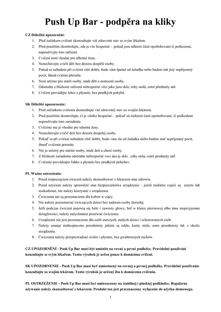 Push Up Bar - podpěra na kliky CZ Důležitá upozornění: 1. Před začátkem cvičení zkonzultujte váš zdravotní stav se svým lékařem. 2. Před použitím zkontrolujte, zda je vše bezpečné - pokud jsou některé části opotřebované či poškozené, 3. Cvičení není vhodné pro těhotné ženy. 4. Nenechávejte cvičit děti bez dozoru dospělé osoby. 5. Pokud se nebudete při cvičení cítit dobře, bude vám špatně od žaludku nebo budete mít jiný nepříjemný nepoužívejte toto zařízení. pocit, ihned cvičení přerušte. 6. Není určeno pro starší osoby, malé děti a nemocné osoby. 7. Odstraňte z blízkosti zařízení nebezpečné věci jako jsou sklo, rohy stolů, ostré předměty atd. 8. Cvičení provádějte lehce a plynule, bez prudkých pohybů. SK Dôležité upozornenie: 1. Pred začiatkom cvičenia skonzultujte váš zdravotný stav so svojím lekárom. 2. Pred použitím skontrolujte, či je všetko bezpečné - pokiaľ sú niektoré časti opotrebované, či poškodené nepoužívajte toto zariadenie. 3. Cvičenie nie je vhodné pre tehotné ženy. 4. Nenechávajte cvičiť deti bez dozoru dospelej osoby. 5. Pokiaľ sa při cvičení nebudete cítiť dobře, bude vám zle od žalúdka alebo budete mať nepríjemný pocit, ihneď cvičenie prerušte. 6. Nie je určený pre staršie osoby, malé deti a choré osoby. 7. Z blízkosti zariadenia odstráňte nebezpečné veci ako je sklo , rohy stola, ostré predmety atď. 8. Cvičenie prevádzajte ľahko a plynulo bez prudkých pohybov. PL Ważne ostrzeżenia: 1. Przed rozpoczęciem ćwiczeń należy skonsultować z lekarzem stan zdrowia. 2. Przed użyciem należy sprawdzić stan bezpieczeństwa urządzenia – jeżeli niektóre części są zużyte lub uszkodzone, nie należy korzystać z urządzenia. 3. Ćwiczenia nie są przeznaczone dla kobiet w ciąży. 4. Nie należy pozostawiać ćwiczących dzieci bez nadzoru osoby dorosłej. 5. Jeśli podczas ćwiczeń pojawią się bóle i zawroty głowy, ból w klatce piersiowej albo inne nieprzyjemne dolegliwości, należy natychmiast przerwać ćwiczenia. 6. Urządzenie nie jest przeznaczone dla osób starszych, małych dzieci i schorowanych osób. 7. Należy usunąć niebezpieczne przedmioty jakimi są szkło, kanty stołu, ostre przedmioty itd. z okolic urządzenia. 8. Ćwiczenia należy przeprowadzać wolno i płynnie, bez gwałtownych ruchów. CZ UPOZORNĚNÍ - Push Up Bar musí být umístěn na rovné a pevné podložce. Pravidelné používání konzultujte se svým lékařem. Tento výrobek je určen pouze k domácímu cvičení. SK UPOZORNENIE - Push Up Bar musí byť umiestnený na rovnej a pevnej podložke. Pravidelné používanie konzultujte so svojím lekárom. Tento výrobok je určený iba k domácemu cvičeniu. PL OSTRZEŻENIE - Push Up Bar musi być umieszczony na stabilnej i płaskiej podkładce. Regularne używanie należy skonsultować z lekarzem. Produkt ten jest przeznaczony wyłącznie do użytku domowego. 1 CZ – Copyright - autorská práva Společnost MASTER SPORT s.r.o. si vyhrazuje veškerá autorská práva k obsahu tohoto návodu k použití. Autorské právo zakazuje reprodukci částí tohoto návodu nebo jako celku třetí stranou bez výslovného souhlasu společnosti MASTER SPORT s.r.o.. Společnost MASTER SPORT s.r.o. pro použití informací, obsažených v tomto návodu k použití nepřebírá žádnou odpovědnost za jakýkoli patent. SK - Copyright - autorské práva Spoločnosť MASTER SPORT s.r.o. si vyhradzuje všetky autorské práva k obsahu tohoto návodu na použitie. Autorské právo zakazuje reprodukciu častí tohto návodu alebo ako celku treťou stranou bez výslovného súhlasu spoločnosti MASTER SPORT s.r.o.. Spoločnosť MASTER SPORT s.r.o. pre použitie informácií obsiahnutých v tomto návode na použitie nepreberá žiadnu zodpovednosť za akýkoľvek patent. PL - Copyright - prawo autorskie Firma MASTER SPORT s.r.o. zastrzega sobie wszelkie prawa autorskie do treści niniejszej instrukcji obsługi. Prawo autorskie zabrania kopiowania treści instrukcji w części lub też w całości przez osoby trzecie bez wyraźnej zgody MASTER SPORT s.r.o.. Firma MASTER SPORT s.r.o. za korzystanie z informacji zawartych w niniejszej instrukcji obsługi nie ponosi odpowiedzialności za jakiekolwiek patenty. CZ Záruční podmínky: na ab roller se poskytuje kupujícímu záruční lhůta 24 měsíců ode dne koupě v době záruky budou odstraněny veškeré poruchy výrobku způsobené výrobní závadou nebo vadným materiálem výrobku tak, aby věc mohla být řádně užívána práva ze záruky se nevztahují na vady způsobené: - mechanickým poškozením - neodvratnou událostí, živelnou pohromou - neodbornými zásahy - nesprávným zacházením, či nevhodným umístěním, vlivem nízké nebo vysoké teploty, působením vody, neúměrným tlakem a nárazy, úmyslně pozměněným designem, tvarem nebo rozměry reklamace se uplatňuje zásadně písemně s údajem o závadě a kopií daňového dokladu záruku lze uplatňovat pouze u organizace ve které byl výrobek zakoupen SK Záručné podmienky: na ab roller sa poskytuje kupujúcemu záručná doba 24 mesiacov odo dňa nákupu v dobe záruky budú odstránené všetky poruchy výrobku spôsobené výrobnou závadou alebo vadným materiálom výrobku tak, aby vec mohla byť riadne užívaná práva zo záruky sa nevzťahujú na vady spôsobené: - mechanickým poškodením - neodvratnou udalosťou, živelnou pohromou - neodbornými zásahmi - nesprávnym zaobchádzaním, či nevhodným umiestnením, vplyvom nízkej alebo vysokej teploty, pôsobením vody, neúmerným tlakom a nárazmi, úmyselne pozmeneným designom, tvarom alebo rozmermi reklamácia sa uplatňuje zásadne písomne s údajom o závade a kopií daňového dokladu záruku je možné uplatňovať iba u organizácie, v ktorej bol výrobok zakúpený PL Zasady gwaran