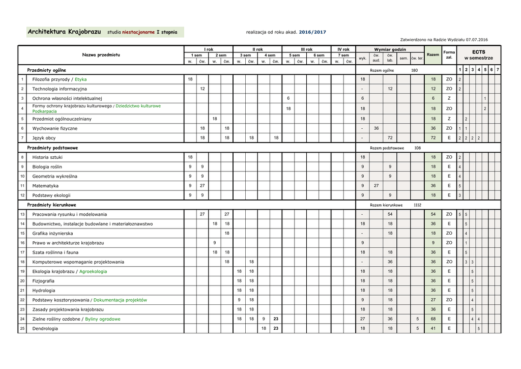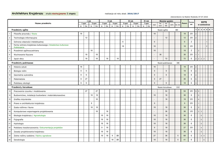 Architektura Krajobrazu studia niestacjonarne I stopnia realizacja od roku akad. 2016/2017 Zatwierdzono na Radzie Wydziału 07.07.2016 Nazwa przedmiotu I rok 1 sem w. ćw. II rok 2 sem w. ćw. 3 sem w. ćw. III rok 4 sem w. ćw. 5 sem w. ćw. IV rok 6 sem w. ćw. 7 sem w. ćw. wyk. Przedmioty ogólne Wymiar godzin Razem ćw. ćw. sem. ćw. ter. aud. lab. Razem ogólne 1 Filozofia przyrody / Etyka 2 Technologia informacyjna 3 Ochrona własności intelektualnej 6 4 Formy ochrony krajobrazu kulturowego / Dziedzictwo kulturowe Podkarpacia 18 5 Przedmiot ogólnouczelniany 6 Wychowanie fizyczne 18 18 7 Język obcy 18 18 18 ZO 2 12 ZO 2 6 6 Z 1 18 18 ZO 2 18 18 Z 36 ZO 1 1 72 E 2 2 - 12 18 18 18 1 2 3 4 5 6 7 180 18 18 ECTS w semestrze Forma zal. 12 36 - Przedmioty podstawowe 72 Razem podstawowe 2 Historia sztuki 18 18 ZO 2 9 Biologia roślin 9 9 9 9 18 E 4 10 Geometria wykreślna 9 9 9 9 18 E 4 11 Matematyka 9 27 9 36 E 5 12 Podstawy ekologii 9 9 9 18 E 3 5 18 27 9 Razem kierunkowe 13 Pracowania rysunku i modelowania 14 Budownictwo, instalacje budowlane i materiałoznawstwo 15 Grafika inżynierska 16 Prawo w architekturze krajobrazu 9 17 Szata roślinna i fauna 18 18 Komputerowe wspomaganie projektowania 19 Ekologia krajobrazu / Agroekologia 20 21 27 18 1112 5 27 - 54 54 ZO 18 18 18 36 E 5 18 - 18 18 ZO 4 9 ZO 1 9 18 18 36 E 5 18 - 36 36 ZO 3 18 18 18 18 36 E 5 Fizjografia 18 18 18 18 36 E 5 Hydrologia 18 18 18 18 36 E 5 22 Podstawy kosztorysowania / Dokumentacja projektów 9 18 9 18 27 ZO 4 23 Zasady projektowania krajobrazu 18 18 18 18 36 E 5 24 Zielne rośliny ozdobne / Byliny ogrodowe 18 18 4 25 Dendrologia 18 18 2 108 8 Przedmioty kierunkowe 2 9 23 27 36 5 68 E 18 23 18 18 5 41 E 3 4 5 26 Fitosocjologia 9 23 9 18 27 Geodezja 18 18 18 18 28 Gleboznawstwo 9 23 9 18 5 29 Podstawy ogrodnictwa 9 14 5 30 5 32 ZO 4 36 E 4 32 E 5 41 E 2 27 E 5 36 ZO 5 3 9 9 18 18 Mechanizacja prac w terenach zieleni / Technika w terenach zieleni 9 18 9 18 31 Ochrona przyrody / Parki krajobrazowe 18 18 18 32 Ogrody tematyczne / Ogrody w krajobrazie wiejskim 9 18 9 18 27 ZO 4 33 Podstawy diagnostyki chorób i szkodników roślin / Ochrona roślin 9 18 9 18 18 36 54 E 4 4 34 Projektowanie obiektów architektury krajobrazu 18 9 18 18 36 54 4 35 Przedmiot do wyboru I 36 Przedmiot do wyboru II 37 Budowa obiektów architektury krajobrazu 38 18 E 4 - 18 18 ZO 2 18 - 18 18 ZO 2 18 18 18 18 36 E 5 Historia sztuki ogrodowej 9 14 9 9 23 E 3 39 Ekonomika i zarządzanie 9 9 ZO 1 40 Pielęgnacja i ochrona terenów zieleni 9 41 Projektowanie zintegrowane 42 Rośliny uprawne w krajobrazie / Rośliny alternatywne w krajobrazie 43 Seminarium inżynierskie 44 Praktyka zawodowa * 9 18 5 9 18 9 36 18 18 18 18 36 54 E 3 3 36 - 72 72 ZO 5 5 18 18 18 36 ZO 4 20 - 38 ZO 4 19 - ZO 38 - 2 7 Liczba godzin 72 129 201 63 135 198 99 144 243 72 142 87 214 117 204 63 158 221 27 92 119 *praktyka trwa 8 tygodni (250 godzin) i jest realizowana po zakończeniu zajęć dydaktycznych: - w 2. semestrze z zakresu rysunku i malarstwa: 2 tyg. (40 godz.) - 2 ECTS - w 4. semestrze z zakresu inwentaryzacji krajobrazu: 2 tyg. (50 godz.) - 2 ECTS i z zakresu zdobywania umiejętności zawodowych: 4 tyg. (160 godz.) - 5 ECTS Nazwy przedmiotów w zielonym kolorze oznaczają przedmioty do wyboru Przedmiot do wyboru I: Przedmiot do wyboru II: 1. Zagospodarowanie przestrzeni sepulkralnej 1. Gleby miejskie 2. Urządzanie zielni towarzyszącej ciągom komunikacyjnym 2. Rośliny zabytkowych parków i ogrodów 3. Współczesne rozwiązania budowlane architektury krajobrazu 3. Rośliny dziko rosnące i ich zastosowanie 483 483 117 732 38 917 30 1400 30 30 33 33 30 31 31 218