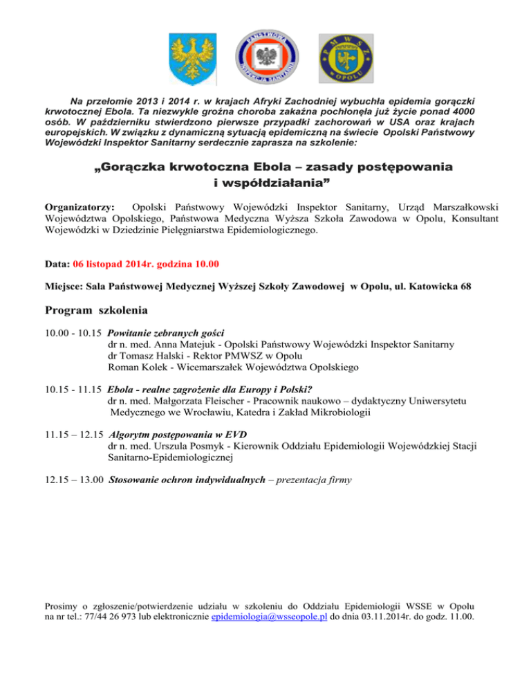 Na przełomie 2013 i 2014 r. w krajach Afryki Zachodniej wybuchła epidemia gorączki krwotocznej Ebola. Ta niezwykle groźna choroba zakaźna pochłonęła już życie ponad 4000 osób. W październiku stwierdzono pierwsze przypadki zachorowań w USA oraz krajach europejskich. W związku z dynamiczną sytuacją epidemiczną na świecie Opolski Państwowy Wojewódzki Inspektor Sanitarny serdecznie zaprasza na szkolenie: „Gorączka krwotoczna Ebola – zasady postępowania i współdziałania” Organizatorzy: Opolski Państwowy Wojewódzki Inspektor Sanitarny, Urząd Marszałkowski Województwa Opolskiego, Państwowa Medyczna Wyższa Szkoła Zawodowa w Opolu, Konsultant Wojewódzki w Dziedzinie Pielęgniarstwa Epidemiologicznego. Data: 06 listopad 2014r. godzina 10.00 Miejsce: Sala Państwowej Medycznej Wyższej Szkoły Zawodowej w Opolu, ul. Katowicka 68 Program szkolenia 10.00 - 10.15 Powitanie zebranych gości dr n. med. Anna Matejuk - Opolski Państwowy Wojewódzki Inspektor Sanitarny dr Tomasz Halski - Rektor PMWSZ w Opolu Roman Kolek - Wicemarszałek Województwa Opolskiego 10.15 - 11.15 Ebola - realne zagrożenie dla Europy i Polski? dr n. med. Małgorzata Fleischer - Pracownik naukowo – dydaktyczny Uniwersytetu Medycznego we Wrocławiu, Katedra i Zakład Mikrobiologii 11.15 – 12.15 Algorytm postępowania w EVD dr n. med. Urszula Posmyk - Kierownik Oddziału Epidemiologii Wojewódzkiej Stacji Sanitarno-Epidemiologicznej 12.15 – 13.00 Stosowanie ochron indywidualnych – prezentacja firmy Prosimy o zgłoszenie/potwierdzenie udziału w szkoleniu do Oddziału Epidemiologii WSSE w Opolu na nr tel.: 77/44 26 973 lub elektronicznie [email protected] do dnia 03.11.2014r. do godz. 11.00.