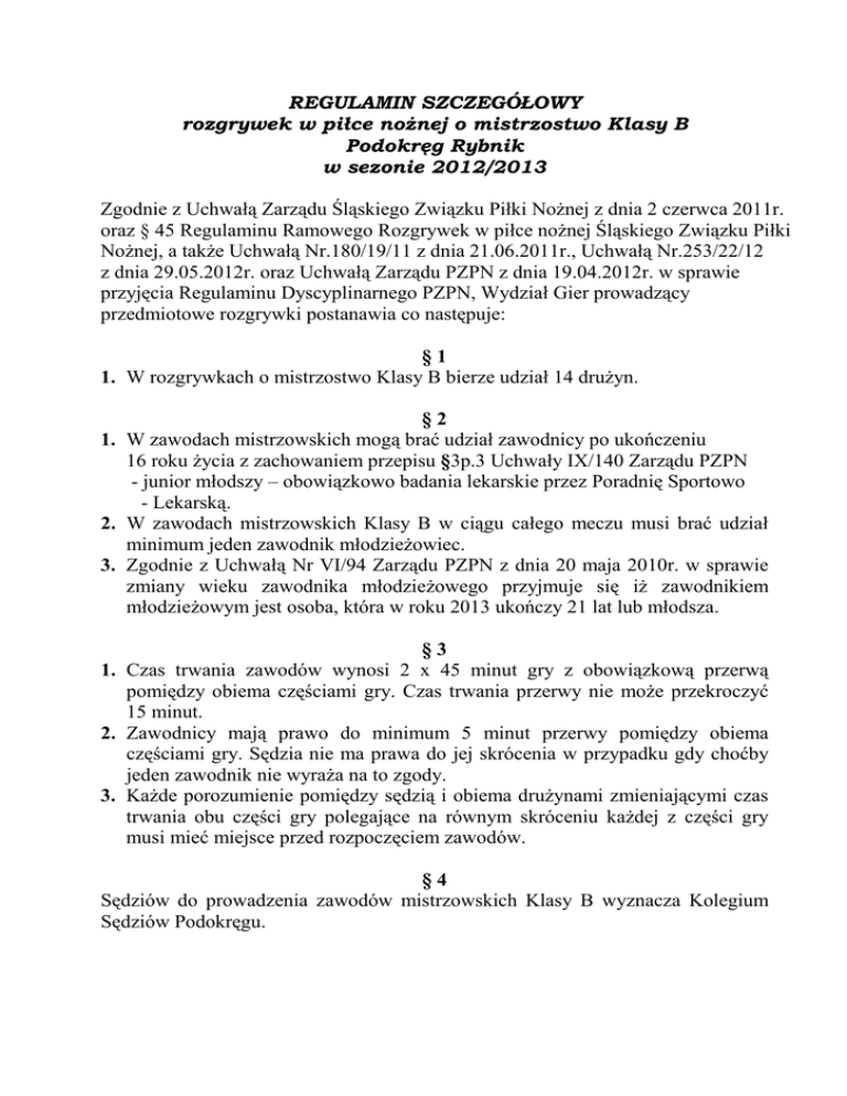 REGULAMIN SZCZEGÓŁOWY rozgrywek w piłce noŜnej o mistrzostwo Klasy B Podokręg Rybnik w sezonie 2012/2013 Zgodnie z Uchwałą Zarządu Śląskiego Związku Piłki NoŜnej z dnia 2 czerwca 2011r. oraz § 45 Regulaminu Ramowego Rozgrywek w piłce noŜnej Śląskiego Związku Piłki NoŜnej, a takŜe Uchwałą Nr.180/19/11 z dnia 21.06.2011r., Uchwałą Nr.253/22/12 z dnia 29.05.2012r. oraz Uchwałą Zarządu PZPN z dnia 19.04.2012r. w sprawie przyjęcia Regulaminu Dyscyplinarnego PZPN, Wydział Gier prowadzący przedmiotowe rozgrywki postanawia co następuje: §1 1. W rozgrywkach o mistrzostwo Klasy B bierze udział 14 druŜyn. §2 1. W zawodach mistrzowskich mogą brać udział zawodnicy po ukończeniu 16 roku Ŝycia z zachowaniem przepisu §3p.3 Uchwały IX/140 Zarządu PZPN - junior młodszy – obowiązkowo badania lekarskie przez Poradnię Sportowo - Lekarską. 2. W zawodach mistrzowskich Klasy B w ciągu całego meczu musi brać udział minimum jeden zawodnik młodzieŜowiec. 3. Zgodnie z Uchwałą Nr VI/94 Zarządu PZPN z dnia 20 maja 2010r. w sprawie zmiany wieku zawodnika młodzieŜowego przyjmuje się iŜ zawodnikiem młodzieŜowym jest osoba, która w roku 2013 ukończy 21 lat lub młodsza. §3 1. Czas trwania zawodów wynosi 2 x 45 minut gry z obowiązkową przerwą pomiędzy obiema częściami gry. Czas trwania przerwy nie moŜe przekroczyć 15 minut. 2. Zawodnicy mają prawo do minimum 5 minut przerwy pomiędzy obiema częściami gry. Sędzia nie ma prawa do jej skrócenia w przypadku gdy choćby jeden zawodnik nie wyraŜa na to zgody. 3. KaŜde porozumienie pomiędzy sędzią i obiema druŜynami zmieniającymi czas trwania obu części gry polegające na równym skróceniu kaŜdej z części gry musi mieć miejsce przed rozpoczęciem zawodów. §4 Sędziów do prowadzenia zawodów mistrzowskich Klasy B wyznacza Kolegium Sędziów Podokręgu. 1. 2. 3. 4. 5. §5 Zawody rozgrywane są w terminach i czasie rozpoczęcia wyznaczonym przez Wydział Gier i podanym w oficjalnym terminarzu rozgrywek. W wyznaczonych terminach „sobota-niedziela” gospodarz ma prawo do zmiany dnia rozgrywania zawodów (sobota na niedziele i odwrotnie) oraz wyznaczenia godziny ich rozpoczęcia w przedziale czasowym pomiędzy godziną 11,00 a: a) – 18,00 gdy zawody rozgrywane będą przy świetle dziennym b) – 20,00 gdy zawody rozgrywane będą przy świetle elektrycznym c) – na rozegranie zawodów w soboty w godzinach do południowych wymagana jest zgoda druŜyny przeciwnej. W wyznaczonych terminach w dni świąteczne (wolne od pracy) gospodarz ma prawo zmiany godziny rozpoczęcia zawodów w przedziale określonym w punkcie 2. W przypadku wystąpienia o zmianę innych terminów rozgrywek podanych w oficjalnym terminarzu rozgrywek zainteresowany klub musi uzyskać pisemną zgodę przeciwnej druŜyny na proponowane zmiany. zapisy § 5 pkt. 2, 3, 4 nie mają zastosowania do dwóch ostatnich terminów rozgrywek podanych w oficjalnym terminarzu. §6 1. Zasady spadków i awansów określa odrębny regulamin spadków i awansów obowiązujący w Podokręgu. §7 W sezonie rozgrywkowym 2012/2013 obowiązują następujące opłaty na rzecz Śląskiego ZPN wiąŜące się z uczestnictwem klubu w rozgrywkach Klasy B: 1. Opłata startowa – płatna przy uprawnieniach 800 zł 2. Opłata za uprawnienie zawodnika do gry 15 zł 3. Sankcje za Ŝółte kartki (ostrzeŜenia) zawodnika: a) przy trzecim ostrzeŜeniu kara pienięŜna 40 zł b) przy czwartym ostrzeŜeniu kara dyskwalifikacji 1 mecz c) przy szóstym ostrzeŜeniu kara pienięŜna 60 zł d) przy ósmym ostrzeŜeniu kara dyskwalifikacji 1 mecz e) przy dziewiątym ostrzeŜeniu kara pienięŜna 90 zł f) przy dwunastym ostrzeŜeniu kara dyskwalifikacji - 2 mecze g) przy kaŜdym kolejnym ostrzeŜeniu kara dyskwalifikacji 1 mecz oraz kara pienięŜna 150 zł 4.Kaucja przy składaniu protestu do I instancji 200 zł 5.Kaucja za odwołanie od decyzji I instancji 300 zł 6.Opłata za wycofanie druŜyny w trakcie sezonu - 500-700zł 7.Opłata za nieusprawiedliwione niestawienie się druŜyny na zawody - 200-500zł 8.Opłata za samowolne zejście druŜyny z boiska w czasie zawodów - 600-1200 zł 9.Wystąpienie z wnioskiem o zmianę terminu zawodów bez 14-dniowego wyprzedzenia 90 zł 10.Wpisanie na listę zawodników uprawnionych do gry w danych zawodach osoby bez waŜnego badania lekarskiego 150 zł 11.Wystawienie do zawodów zawodnika nieuprawnionego do gry ( dyskwalifikacja, gra pod obcym nazwiskiem, sfałszowana data urodzenia itp.) - do 1500 zł 12.Brak na zawodach słuŜby medycznej, środków doraźnej pomocy - 100-250 zł 13.Brak na zawodach słuŜby porządkowej w ilości określonej Regulaminem Dyscyplinarnym - 100-250 zł 14.Nieczytelne lub błędne wypełnienie właściwych części sprawozdania sędziego z zawodów 90 zł 15. Niedopełnienie obowiązku właściwego przygotowania boiska z winy którego zawody się nie odbyły 100 zł Zatwierdzono na posiedzeniu Zarządu w dniu 1 sierpnia 2012r.