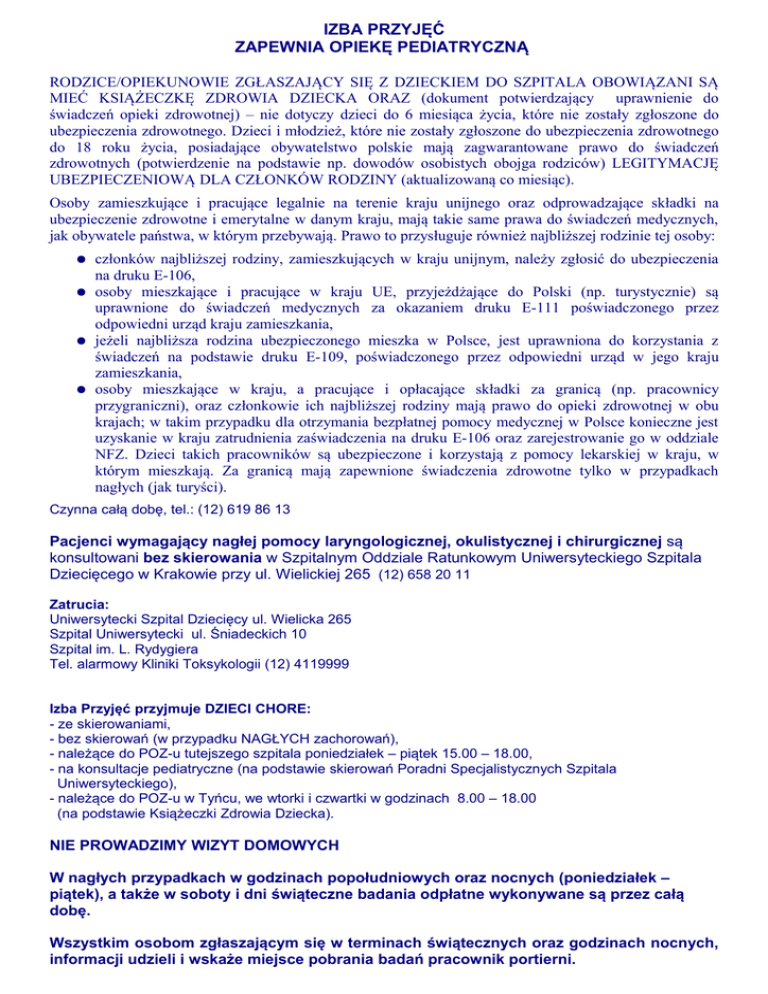 IZBA PRZYJĘĆ ZAPEWNIA OPIEKĘ PEDIATRYCZNĄ RODZICE/OPIEKUNOWIE ZGŁASZAJĄCY SIĘ Z DZIECKIEM DO SZPITALA OBOWIĄZANI SĄ MIEĆ KSIĄŻECZKĘ ZDROWIA DZIECKA ORAZ (dokument potwierdzający uprawnienie do świadczeń opieki zdrowotnej) – nie dotyczy dzieci do 6 miesiąca życia, które nie zostały zgłoszone do ubezpieczenia zdrowotnego. Dzieci i młodzież, które nie zostały zgłoszone do ubezpieczenia zdrowotnego do 18 roku życia, posiadające obywatelstwo polskie mają zagwarantowane prawo do świadczeń zdrowotnych (potwierdzenie na podstawie np. dowodów osobistych obojga rodziców) LEGITYMACJĘ UBEZPIECZENIOWĄ DLA CZŁONKÓW RODZINY (aktualizowaną co miesiąc). Osoby zamieszkujące i pracujące legalnie na terenie kraju unijnego oraz odprowadzające składki na ubezpieczenie zdrowotne i emerytalne w danym kraju, mają takie same prawa do świadczeń medycznych, jak obywatele państwa, w którym przebywają. Prawo to przysługuje również najbliższej rodzinie tej osoby: członków najbliższej rodziny, zamieszkujących w kraju unijnym, należy zgłosić do ubezpieczenia na druku E-106, osoby mieszkające i pracujące w kraju UE, przyjeżdżające do Polski (np. turystycznie) są uprawnione do świadczeń medycznych za okazaniem druku E-111 poświadczonego przez odpowiedni urząd kraju zamieszkania, jeżeli najbliższa rodzina ubezpieczonego mieszka w Polsce, jest uprawniona do korzystania z świadczeń na podstawie druku E-109, poświadczonego przez odpowiedni urząd w jego kraju zamieszkania, osoby mieszkające w kraju, a pracujące i opłacające składki za granicą (np. pracownicy przygraniczni), oraz członkowie ich najbliższej rodziny mają prawo do opieki zdrowotnej w obu krajach; w takim przypadku dla otrzymania bezpłatnej pomocy medycznej w Polsce konieczne jest uzyskanie w kraju zatrudnienia zaświadczenia na druku E-106 oraz zarejestrowanie go w oddziale NFZ. Dzieci takich pracowników są ubezpieczone i korzystają z pomocy lekarskiej w kraju, w którym mieszkają. Za granicą mają zapewnione świadczenia zdrowotne tylko w przypadkach nagłych (jak turyści). Czynna całą dobę, tel.: (12) 619 86 13 Pacjenci wymagający nagłej pomocy laryngologicznej, okulistycznej i chirurgicznej są konsultowani bez skierowania w Szpitalnym Oddziale Ratunkowym Uniwersyteckiego Szpitala Dziecięcego w Krakowie przy ul. Wielickiej 265 (12) 658 20 11 Zatrucia: Uniwersytecki Szpital Dziecięcy ul. Wielicka 265 Szpital Uniwersytecki ul. Śniadeckich 10 Szpital im. L. Rydygiera Tel. alarmowy Kliniki Toksykologii (12) 4119999 Izba Przyjęć przyjmuje DZIECI CHORE: - ze skierowaniami, - bez skierowań (w przypadku NAGŁYCH zachorowań), - należące do POZ-u tutejszego szpitala poniedziałek – piątek 15.00 – 18.00, - na konsultacje pediatryczne (na podstawie skierowań Poradni Specjalistycznych Szpitala Uniwersyteckiego), - należące do POZ-u w Tyńcu, we wtorki i czwartki w godzinach 8.00 – 18.00 (na podstawie Książeczki Zdrowia Dziecka). NIE PROWADZIMY WIZYT DOMOWYCH W nagłych przypadkach w godzinach popołudniowych oraz nocnych (poniedziałek – piątek), a także w soboty i dni świąteczne badania odpłatne wykonywane są przez całą dobę. Wszystkim osobom zgłaszającym się w terminach świątecznych oraz godzinach nocnych, informacji udzieli i wskaże miejsce pobrania badań pracownik portierni. REJESTRACJA DO PORADNI ZDROWIA PSYCHICZNEGO Czynna: poniedziałek – piątek 8.00 – 15.00 tel. (12) 619 86 93 REJESTRACJA DO POZ i PORADNI SPECJALISTYCZNYCH Czynna: poniedziałek – piątek 8.00 – 17.00 tel.: (12) 619 86 15 (12) 619 86 53 REJESTRACJA DO POZ ODBYWA SIĘ NA PODSTAWIE: ● ● Książeczki Zdrowia Dziecka, dokumentu potwierdzającego prawo do uzyskania świadczeń opieki zdrowotnej: ➢ RMUA – zgłoszeniowe ➢ KRUS – ostatnia wpłata ➢ działalność gospodarcza – ostatnia wplata Legitymacji Ubezpieczeniowej dla członków rodziny (aktualizowanej co miesiąc), skierowań (skierowanie nie jest wymagane do IZBY PRZYJĘĆ w przypadku nagłego zachorowania). ➢ ● POZ (PODSTAWOWA OPIEKA ZDROWOTNA) Udziela świadczeń zdrowotnych dzieciom do lat 18 w Poradni Dziecka Chorego oraz w Poradni Dziecka Zdrowego i Punkcie Szczepień. Poradnia Dziecka Zdrowego Gabinet Lekarski tel. 12 619 86 80 Punkt Szczepień Pielęgniarka tel. 12 619 86 88 Poradnia Dziecka Chorego Gabinet Lekarski tel. 12 619 86 85 Do PORADNI DZIECKA ZDROWEGO I PUNKTU SZCZEPIEŃ należy zgłaszać się po wcześniejszym telefonicznym ustaleniu terminu wizyty tel. 12 619 86 88 Poradnia czynna jest: wtorek w godz. 11.30 – 18.00 środa 8.00 – 10.00 czwartek 8.00 – 9.30 i 12.30 – 14.30 piątek 8.00 – 11.00 w poniedziałki PDZ jest nieczynna Dzieci chore należące do POZ przyjmowane są (po rejestracji telefonicznej) w: REJESTRACJA tel.12 619 86 15 12 619 86 53 poniedziałki 8.00 – 18.00 wtorki 8.00 – 11.30 środa 10.00 – 15.00 czwartek 9.30 – 12.30 piątek 11.00 – 14.30 wtorki – piątki 15.00 – 18.00 dzieci przyjmowane są w IZBIE PRZYJĘĆ SZPITALA. Po godz. 18.00 poniedziałek – piątek oraz w soboty, niedziele i święta przez całą dobę, opiekę zapewniają lekarze jak w wykazie obok (zmiana nastąpiła 1 marca 2011 r.). USŁUGI PIELĘGNIARSKIE dla pacjentów POZ świadczą pielęgniarki środowiskowe Szpitala Uniwersyteckiego na podstawie zleceń lekarskich. ZGŁOSZENIA przyjmowane są: poniedziałek – piątek 7.00 – 18.00 tel. (12) 424 89 55 POZ NIE PROWADZI WIZYT DOMOWYCH Pomoc ambulatoryjną, w ramach opieki całodobowej, w dni powszednie od 18.00 – 8.00 oraz dni wolne od pracy, niedzielę i święta od godziny 8.00 – 18.00 – 8.00 można uzyskać, dzwoniąc pod numer telefonu (12) 424 42 59, jest to numer lekarza dyżurującego POZ. GABINET ZABIEGOWY Czynny: poniedziałek – piątek 7.30 – 15.00 tel.: (12) 619 86 87 ŚWIADCZENIA PIELĘGNIARSKIE wykonywane są na podstawie skierowań z Poradni Specjalistycznych tutejszego szpitala w
