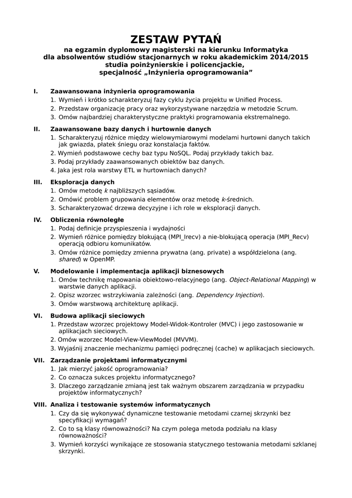 ZESTAW PYTAŃ na egzamin dyplomowy magisterski na kierunku Informatyka dla absolwentów studiów stacjonarnych w roku akademickim 2014/2015 studia poinżynierskie i policencjackie, specjalność „Inżynieria oprogramowania” I. Zaawansowana inżynieria oprogramowania 1. Wymień i krótko scharakteryzuj fazy cyklu życia projektu w Unified Process. 2. Przedstaw organizację pracy oraz wykorzystywane narzędzia w metodzie Scrum. 3. Omów najbardziej charakterystyczne praktyki programowania ekstremalnego. II. Zaawansowane bazy danych i hurtownie danych 1. Scharakteryzuj różnice między wielowymiarowymi modelami hurtowni danych takich jak gwiazda, płatek śniegu oraz konstalacja faktów. 2. Wymień podstawowe cechy baz typu NoSQL. Podaj przykłady takich baz. 3. Podaj przykłady zaawansowanych obiektów baz danych. 4. Jaka jest rola warstwy ETL w hurtowniach danych? III. Eksploracja danych 1. Omów metodę k najbliższych sąsiadów. 2. Omówić problem grupowania elementów oraz metodę k-średnich. 3. Scharakteryzować drzewa decyzyjne i ich role w eksploracji danych. IV. Obliczenia równoległe 1. Podaj definicje przyspieszenia i wydajności 2. Wymień różnice pomiędzy blokującą (MPI_Irecv) a nie-blokującą operacja (MPI_Recv) operacją odbioru komunikatów. 3. Omów różnice pomiędzy zmienna prywatna (ang. private) a współdzielona (ang. shared) w OpenMP. V. Modelowanie i implementacja aplikacji biznesowych 1. Omów technikę mapowania obiektowo-relacyjnego (ang. Object-Relational Mapping) w warstwie danych aplikacji. 2. Opisz wzorzec wstrzykiwania zależności (ang. Dependency Injection). 3. Omów warstwową architekturę aplikacji. VI. Budowa aplikacji sieciowych 1. Przedstaw wzorzec projektowy Model-Widok-Kontroler (MVC) i jego zastosowanie w aplikacjach sieciowych. 2. Omów wzorzec Model-View-ViewModel (MVVM). 3. Wyjaśnij znaczenie mechanizmu pamięci podręcznej (cache) w aplikacjach sieciowych. VII. Zarządzanie projektami informatycznymi 1. Jak mierzyć jakość oprogramowania? 2. Co oznacza sukces projektu informatycznego? 3. Dlaczego zarządzanie zmianą jest tak ważnym obszarem zarządzania w przypadku projektów informatycznych? VIII. Analiza i testowanie systemów informatycznych 1. Czy da się wykonywać dynamiczne testowanie metodami czarnej skrzynki bez specyfikacji wymagań? 2. Co to są klasy równoważności? Na czym polega metoda podziału na klasy równoważności? 3. Wymień korzyści wynikające ze stosowania statycznego testowania metodami szklanej skrzynki. IX. Systemy wspomagania decyzji (przedmiot realizowany tylko przez studentów studiów poinżynierskich) 1 Podstawy bayesowskiej teorii decyzji. 2. Parametryczne i nieparametryczne reguły decyzyjne oraz metody ich oceny. 3. Liniowe reguły klasyfikacyjne. X. Tworzenie aplikacji gridowych 1. Opisz mechanizm przydzielania zlecanych zadań w systemie Condor. 2. Omów główne koncepcje modelu obliczeń w chmurach (cloud computing): SaaS, PaaS, IaaS. 3. Jakie podstawowe usługi gridowe specyfikuje OGSA (Open Grid Service Architecture)? XI. Zaawansowane systemy operacyjne 1. Scharakteryzuj stany procesu w systemie Linux 2.0. 2. Jaka jest różnica pomiędzy urządzeniem blokowym a znakowym? 3. Omów dostępne alokatory pamięci dla jądra w systemie Linux 2.0.