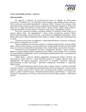 Uczeń z przewlekłą chorobą – cukrzyca Opis przypadku Po zebraniu z rodzicami do wychowawczyni klasy VI zgłosiła się mama jednej z uczennic. Powiedziała, że u jej córki Beaty kilka miesięcy temu zdiagnozowano cukrzycę. Dziewczynka jest pod opieką specjalistów z Instytutu Matki i Dziecka. Dwa miesiące temu otrzymała pompę insulinową, którą obecnie próbuje już samodzielnie obsługiwać. Beata musi kilka razy w ciągu dnia zmierzyć poziom cukru i dobrze byłoby, gdyby mogła zrobić to w jakimś spokojnym i cichym miejscu. Czasem nie radzi sobie z interpretacją wyników. Poza tym, ponieważ uczennica przyjmuje insulinę od niedawna, nadal mogą jej się zdarzyć objawy hipo- lub hiperglikemii i może wtedy potrzebować pomocy. Mama dziewczynki uprzedziła wychowawczynię, że potrzebne jest pogłębienie diagnostyki, zatem Beatę czeka jeszcze kilka hospitalizacji, które będą się wiązały z dłuższymi nieobecnościami w szkole. Wychowawczyni klasy po spotkaniu z mamą poprosiła Beatę o rozmowę na temat jej stanu zdrowia i samopoczucia w szkole. Podczas spotkania uczennica powiedziała, że od kiedy przyjmuje leki, czuje się bardzo dobrze. Była wyraźnie dumna z powodu opanowania obsługi pompy insulinowej. Opowiadała także, że w klasie ma kilka dobrych koleżanek. Dwie z nich wiedzą o jej chorobie i leczeniu. Wychowawczyni porozumiała się także z pielęgniarką szkolną w sprawie pomocy Beacie w przeprowadzaniu badań i interpretowaniu wyników. Nauczycielka wraz z uczennicą odwiedziła gabinet pielęgniarski. Dziewczynka bardzo polubiła panią Zofię i z przyjemnością odwiedzała ją codziennie. Mama Beaty z pomocą szkolnej pielęgniarki przygotowała krótkie szkolenie dla nauczycieli na temat cukrzycy i zasad udzielania pomocy w wypadku objawów hipo- lub hiperglikemii. Od lekarza specjalisty nauczyciele wf otrzymali wskazówki dotyczące dopuszczalnego wysiłku fizycznego i sposobów uzupełnienia powstałych w organizmie braków cukru. W okresach hospitalizacji Beata uczęszczała na zajęcia szkolne w szpitalu. Koleżanki z pomocą rodziców za pośrednictwem internetu przekazywały jej informacje o realizowanym materiale. Zasady pomocy (kto?, kiedy?, jak?) wychowawczyni ustaliła z uczennicami na jednej z godzin wychowawczych. Warunki przeprowadzania sprawdzianów w ciągu roku szkolnego i sprawdzianu po VI klasie dostosowano do potrzeb Beaty zgodnie z zaleceniami lekarza. © Copyright by Nowa Era Spółka z o.o. 2012 Karta Indywidualnych Potrzeb Ucznia Imię i nazwisko ucznia Beata **** Klasa, do której uczęszcza uczeń VI Placówka zakładająca kartę Szkoła Podstawowa w **** Podstawa założenia karty Placówka wystawiająca dokument Data wystawienia dokumentu/nr Zaświadczenie lekarskie. Centrum Zdrowia Dziecka **** Data założenia karty **** Specjalne potrzeby rozwojowe i edukacyjne, ze względu na które została założona karta Choroba przewlekła – cukrzyca. Mocne strony ucznia Dobre wyniki w nauce, dobre relacje z rówieśnikami, samodzielność, dobre radzenie sobie z chorobą, łatwość nawiązywania kontaktu z dorosłymi. Zakres, w którym uczeń wymaga pomocy psychologiczno-pedagogicznej z uwagi na indywidualne potrzeby rozwojowe i edukacyjne oraz możliwości psychofizyczne Ze względu na problemy zdrowotne uczennica wymaga dostosowania warunków udziału w zajęciach i sprawdzianach do indywidualnych potrzeb oraz pomocy w uzupełnianiu zaległości w nauce wynikających z nieobecności w szkole podczas hospitalizacji. Wymiar godzin Osoby odpowiedzialne za udzielanie pomocy uczniowi Okresy udzielania pomocy W miarę potrzeb. Wychowawca, szkolna pielęgniarka. Bieżący rok szkolny. Sposoby pomocy Dostosowane warunków uczestniczenia w zajęciach edukacyjnych do indywidualnych potrzeb uczennicy. Stworzenie uczennicy warunków do wykonywania badań na terenie szkoły. Zwiększenie wiedzy nauczycieli na temat choroby, objawów, problemów i zasad interwencji. Dostosowanie zakresu dopuszczalnego wysiłku na zajęciach wf do możliwości i stanu zdrowia uczennicy. Dostosowanie warunków pracy na sprawdzianach i egzaminach do potrzeb uczennicy. Kto odpowiada za opracowanie PWD? Wychowawca klasy. © Copyright by Nowa Era Spółka z o.o. 2012 Plan Działań Wspierających Imię i nazwisko ucznia Klasa Szkoła Beata **** VI Szkoła Podstawowa w **** Cele do osiągnięcia w zakresie, w którym uczeń wymaga pomocy psychologiczno-pedagogicznej Cele ogólne Cele szczegółowe Zminimalizowanie wpływu choroby na wyniki edukacyjne Beaty i jej funkcjonowanie w szkole. Stworzenie uczennicy warunków w szkole, które pozwolą jej na komfortowe podawanie leków i dbanie o stan zdrowia. Stworzenie warunków do bezpiecznej aktywności fizycznej uczennicy na zajęciach wf. Zwiększenie świadomości i wiedzy środowiska szkolnego na temat cukrzycy. Poszerzenie wiedzy nauczycieli na temat objawów hipo- i hiperglikemii oraz zapoznanie ich z zasadami reagowania w takich sytuacjach. Poszerzenie wiedzy uczniów na temat przyczyn powstawania cukrzycy i zasad zdrowej diety. Działania realizowane z uczniem w ramach poszczególnych form i sposobów udzielania pomocy psychologiczno-pedagogicznej Formy i sposoby Działania Dostosowanie warunków uczestniczenia w zajęciach edukacyjnych do indywidualnych potrzeb uczennicy. Umożliwienie wykonywania badań diagnostycznych w gabinecie pielęgniarki szkolnej. Pomoc pielęgniarki w interpretowaniu wyników glukometru. Wydłużenie czasu wykonywania zadań na sprawdzianach i egzaminach o niezbędną przerwę. Możliwość spożywania posiłków i napojów podczas zajęć oraz sprawdzianów. Poszerzenie wiedzy nauczycieli wf na temat objawów choroby, ustalenie zakresu dopuszczalnego wysiłku fizycznego na zajęciach. © Copyright by Nowa Era Spółka z o.o. 2012 Działania wspierające rodziców ucznia Wymiana informacji na temat samopoczucia dziecka między rodzicami i nauczycielami, wspólne anali