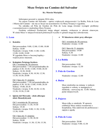 Msze Święte na Camino del Salvador Ks. Marcin Maciążka Informator powstał w sierpniu 2016 roku. Na całym Camino del Salvador - oprócz większych miejscowości: La Robla, Pola de Lena i Mieres del Camino - nie ma co liczyć na uczestnictwo we Mszy Świętej w tygodniu. Na odcinku od Pola de Gordon do Pola de Lena mogą również wystąpić problemy z uczestnictwem w niedzielnej Mszy Świętej. Godziny celebracji Eucharystii mogą ulegać zmianie, zwłaszcza w okresie zimowym. W zimie Msze w miejscowościach położonych wysoko w górach mogą być odwoływane. 1. Leon W klasztorze sióstr przy albergue Katedra Od 1 września do 30 czerwca: Niedziele i święta: 12.00 Dni powszednie: 9.00; 12.00; 13.00; 18.00 Soboty: 18.00 Niedziele i święta: 9.00; 11.00; 12.00; 13.00; 14.00; 18.00 W tygodniu Msze w bocznej kaplicy wejście przez muzeum. Od 1 lipca do 31 sierpnia: Dni powszednie: 19.00 Soboty: 8.30 Niedziele i święta: 12.00 2. La Robla Kolegiata Świętego Izydora Od 1 września do 30 czerwca: Dni powszednie: 7.30 (od poniedziałku do piątku); 8.30; 10.30; 13.00; 19.00; 20.30 Soboty: 18.30; 20.00 Niedziele i święta: 8.30; 10.30; 12.30; 13.30; 18.30; 20.00 Dni powszednie: 8.00 Niedziele i święta: 12.30 3. Pola de Gordon Niedziele i święta: 12.00 Od 1 lipca do 31 sierpnia: Dni powszednie: 7.30 (od poniedziałku do piątku); 8.30; 10.30; 13.00; 19.00; 20.30 Soboty: 19.00; 20.30 Niedziele i święta: 8.30; 10.30; 12.30; 13.30; 19.30; 21.00 4. Buiza Msze niedzielne na zmianę: w jednym tygodniu w sobotę, w następnym w niedzielę - zazwyczaj ok. 12.00. Należy pytać miejscowych. Iglesia del Mercado - obok albergue sióstr Benedyktynek 5. Pajares Od 1 września do 30 czerwca: Dni powszednie: 11.30; 19.30 Soboty: 19.30 Niedziele i święta: 9.00; 11.30; 12.30; 13.30; 18.00 Msza tylko w niedziele. W sprawie celebracji Mszy należy rozmawiać z hospitalerą. Ona zadzwoni do proboszcza i zapyta o zgodę. Od 1 lipca do 31 sierpnia: Dni powszednie: 11.30; 20.30 Soboty: 20.00 Niedziele i święta: 11.30; 12.30; 13.30; 6. Pola de Lena Dni powszednie: 20.00 Niedziele i święta: 9.00; 12.30 1 7. Mieres del Camino Dni powszednie: 19.30 Niedziele i święta: 9.00; 11.00; 13.00 8. Oviedo Katedra San Salvador Dni powszednie: 9.15 (Kaplica św. Barbary), 12.00 (Kaplica del Rey Casto) Soboty: 18.30 Niedziele i święta: 10.00; 11.00; 12.00; 13.00; 18.30 Kościół San Isidorio (m centrum miasta przy trasie camino) Od 1 września do 30 czerwca: Dni powszednie: 11.00; 20.00 Soboty: 20.00 Niedziele i święta: 11.00; 12.00; 13.00; 20.00 Od 1 lipca do 31 sierpnia: Dni powszednie: 11.00; 20.00 Soboty: 20.00 Niedziele i święta: 11.00; 12.00; 13.00 Kościół San Tirso (obok katedry - z prawej strony) Dni powszednie: 19.00 Soboty: 19.00 Niedziele i święta: 12.30; 19.00 2