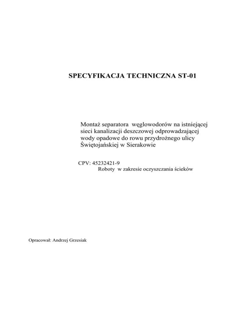 SPECYFIKACJA TECHNICZNA ST-01 Montaż separatora węglowodorów na istniejącej sieci kanalizacji deszczowej odprowadzającej wody opadowe do rowu przydrożnego ulicy Świętojańskiej w Sierakowie CPV: 45232421-9 Roboty w zakresie oczyszczania ścieków Opracował: Andrzej Grzesiak SPECYFIKACJA TECHNICZNA ST-01 1. WSTĘP 1.1. Przedmiot SST Przedmiotem niniejszej specyfikacji technicznej (ST) są wymagania dotyczące wykonania i odbioru robót związanych z montażem separatora substancji ropopochodnych na istniejącym kanale deszczowym odprowadzającym wody opadowe do rowu przydrożnego ulicy. Świętojańskiej Sierakowie. 1.2. Zakres stosowania SST Szczegółowa Specyfikacja Techniczna jest stosowana jako dokument w postępowaniu przetargowym i przy realizacji umowy na wykonanie robót związanych z realizacją przedsięwzięcia wymienionego w punkcie 1.1. 1.3. Zakres robót objętych SST Ustalenia zawarte w niniejszej specyfikacji dotyczą zasad prowadzenia robót związanych z montażem separatora substancji ropopochodnych na istniejącym kanale deszczowym Ø 800mm. Projektowany montaż obejmuje budowę: − separatora substancji ropopochodnych Zakres robót przy wykonywaniu kanalizacji deszczowej obejmuje: − oznakowanie robót, − dostawę materiałów, − wykonanie prac przygotowawczych, − roboty rozbiórkowe (rozebranie rurociągu oraz drogi z płyt), − przekopy próbne oraz podwieszenie instalacji obcych, − wykonanie wykopu w gruncie kat. I-II wraz z umocnieniem ścian wykopu i jego odwodnieniem, − przygotowanie podłoża pod separator, − odwodnienie wykopu, − montaż z separatora substancji ropopochodnych − zasypanie z zagęszczeniem wykopów pod separator − przeprowadzenie pomiarów i badań wymaganych w specyfikacji technicznej. 1.4. Określenia podstawowe 1.4.1. Kanalizacja deszczowa - sieć kanalizacyjna zewnętrzna przeznaczona do odprowadzania wód opadowych. 1.4.2. Kanały 1.4.2.1. Kanał - liniowa budowla przeznaczona do grawitacyjnego odprowadzania ścieków. 1.4.2.2. Kanał deszczowy - kanał przeznaczony do odprowadzania wód opadowych. 1.4.3. Urządzenia (elementy) uzbrojenia sieci 1.4.4. Właz kanałowy - element żeliwny przeznaczony do przykrycia podziemnych studzienek rewizyjnych lub komór kanalizacyjnych, umożliwiający dostęp do urządzeń kanalizacyjnych. 1.4.5 Separator – urządzenie do oddzielania cieczy lekkich(oleje, benzyny). 1.4.6. Elementy odwodnienia wykopu 1.4.6.1 Zestaw igłofiltrów - agregat pompowy, zespół kolektora ssącego, igłofiltry elastyczne dn 32, rura wpłukująca, zespół odprowadzający wodę. SPECYFIKACJA TECHNICZNA ST-01 2. MATERIAŁY 2.1. Ogólne wymagania dotyczące materiałów Wszystkie zakupione przez Wykonawcę materiały zastosowane do montażu separatora winny odpowiadać normom krajowym zastąpionym, jeśli to możliwe, przez normy europejskie lub technicznym aprobatom europejskim. W przypadku braku norm krajowych lub technicznych aprobat europejskich elementy i materiały powinny odpowiadać wymaganiom odpowiednich specyfikacji. 2.2. Separator Separator jest to kompletne wyposażone zbiornikowe urządzenie dostarczane przez producenta. Zbiornik kołowy żelbetowy posadowiony na wypoziomowanej i zagęszczonej podsypce z pospółki. Średnica zbiornika separatora oraz jego podłączenie wg dokumentacji projektowej. 2.3. Kruszywo na podsypkę Podsypka może być wykonana z gruntu piaszczystego lub żwiru. Użyty materiał na podsypkę powinien odpowiadać wymaganiom stosownych norm, np. PN-B-06712, PN-B-11111. 2.4. Beton Beton hydrotechnicznyC35/45 powinien odpowiadać wymaganiom BN-62/6738-03. 2.5. Zaprawa cementowa Zaprawa cementowa powinna odpowiadać wymaganiom PN-B-14501. 2.6. Składowanie materiałów 2.6.1 Zbiornik separatora Zbiornik separatora winien być składowany w pozycji stojącej i zabezpieczony przed uszkodzeniem. Zaleca się bezpośrednia dostawę urządzenia po przygotowaniu wykopu oraz podsypki żwirowej. 2.6.2. Kruszywo Kruszywo należy składować na utwardzonym i odwodnionym podłożu w sposób zabezpieczający je przed zanieczyszczeniem i zmieszaniem z innymi rodzajami i frakcjami kruszyw. 3. SPRZĘT 3.1. Sprzęt do wykonania montażu separatora Wykonawca przystępujący do wykonania montażu separatora substancji ropopochodnej powinien wykazać się możliwością korzystania z następującego sprzętu: − żurawi budowlanych samochodowych, − dźwig o udźwigu niezbędnym do montażu separatora − koparek podsiębiernych, − spycharek kołowych lub gąsienicowych, SPECYFIKACJA TECHNICZNA ST-01 − sprzętu do zagęszczania gruntu, − wciągarek mechanicznych, − igłofiltrów i pomp spalinowych do odwadniania wykopów 4. TRANSPORT 4.1. Transport separatora Transport zbiornika separatora wraz z jego wyposażeniem winien odbywać się zgodnie z wytycznymi jego producenta. 4.2. Transport mieszanki betonowej Do przewozu mieszanki betonowej Wykonawca zapewni takie środki transportowe, które nie spowodują segregacji składników, zmiany składu mieszanki, zanieczyszczenia mieszanki i obniżenia temperatury przekraczającej granicę określoną w wymaganiach technologicznych. 4.3. Transport kruszyw Kruszywa mogą być przewożone dowolnymi środkami transportu, w sposób zabezpieczający je przed zanieczyszczeniem i nadmiernym zawilgoceniem. 4.4. Transport cementu i jego przechowywanie Transport cementu i przechowywanie powinny być zgodne z BN-88/6731-08. 5. WYKONANIE ROBÓT 5.1. Roboty przygotowawcze Przed przystąpieniem do robót Wykonawca dokona wytyczenia osi separatora i trwale oznaczy ją w terenie za pomocą kołków osiowych, kołków świadków i kołków krawędziowych. W przypadku niedostatecznej ilości reperów stałych, Wykonawca wbuduje repery tymczasowe (z rzędnymi sprawdzonymi przez służby geodezyjne), a szkice sytuacyjne reperów i ich rzędne przekaże Inspektorowi Nadzoru. 5.2 Roboty rozbiórkowe Rozbiórce podlegać będzie odcinek kanału Ø800 n