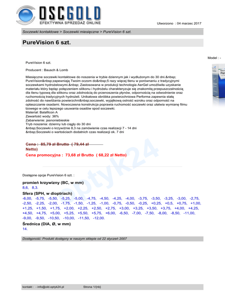 Utworzono : 04 marzec 2017 Soczewki kontaktowe > Soczewki miesięczne > PureVision 6 szt. PureVision 6 szt. Model : PureVision 6 szt. Producent : Bausch & Lomb Miesięczne soczewki kontaktowe do noszenia w trybie dziennym jak i wydłużonym do 30 dni. PureVision zapewniają Twoim oczom do 5 razy więcej tlenu w porównaniu z tradycyjnymi soczewkami hydrożelowymi. Zastosowana w produkcji technologia AerGel umożliwiła uzyskanie materiału który będąc połączeniem silikonu i hydrożelu charakteryzuje się znakomitą przepuszczalnością dla tlenu typową dla silikonu oraz zdolnością do przenoszenia płynów, odpornością na odwodnienie oraz ruchomością tradycyjnych hydrożeli. Unikatowa obróbka powierzchniowa Performa zapewnia stałą zdolność do nawilżania powierzchni soczewki, wyjątkową ostrość wzroku oraz odporność na opłaszczanie osadami. Nowoczesna konstrukcja poprawia ruchomość soczewki oraz ułatwia wymianę filmu łzowego w celu lepszego usuwania osadów spod soczewki. Materiał: Balafilcon A Zawartość wody: 36% Zabarwienie: jasnoniebieskie Tryb noszenia: dzienny lub ciągły do 30 dni Soczewki o krzywiźnie 8,3 na zamówienie czas realizacji 7 - 14 dni Soczewki o wartościach dodatnich czas realizacji ok. 7 dni 4 2 Cena : 85,79 zł Brutto ( 79,44 zł Netto) k y t p o Cena promocyjna : 73,68 zł Brutto ( 68,22 zł Netto) Dostępne opcje PureVision 6 szt. : promień krzywizny (BC, w mm) 8,6, 8,3. Sfera (SPH, w dioptriach) -6,00, -2,50, +1,25, +4,50, -9,00, -5,75, -2,25, +1,50, +4,75, -9,50, -5,50, -5,25, -5,00, -4,75, -4,50, -4,25, -4,00, -3,75, -3,50, -3,25, -3,00, -2,75, -2,00, -1,75, -1,50, -1,25, -1,00, -0,75, -0,50, -0,25, +0,25, +0,5, +0,75, +1,00, +1,75, +2,00, +2,25, +2,50, +2,75, +3,00, +3,25, +3,50, +3,75, +4,00, +4,25, +5,00, +5,25, +5,50, +5,75, +6,00, -6,50, -7,00, -7,50, -8,00, -8,50, -11,00, -10,50, -10,00, -11,50, -12,00. Średnica (DIA, Ø, w mm) 14. Dostępność: Produkt dostępny w naszym sklepie od 22 styczeń 2007 kontakt : - [email protected] Strona 1/{nb}