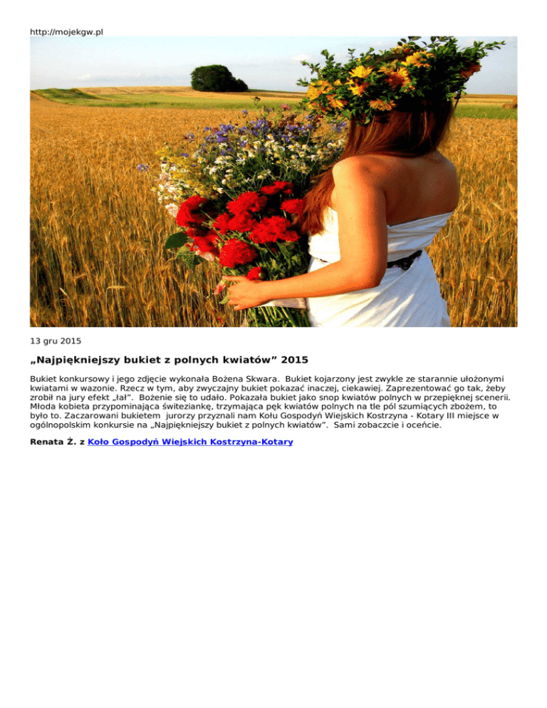 http://mojekgw.pl 13 gru 2015 „Najpiękniejszy bukiet z polnych kwiatów” 2015 Bukiet konkursowy i jego zdjęcie wykonała Bożena Skwara. Bukiet kojarzony jest zwykle ze starannie ułożonymi kwiatami w wazonie. Rzecz w tym, aby zwyczajny bukiet pokazać inaczej, ciekawiej. Zaprezentować go tak, żeby zrobił na jury efekt „łał”. Bożenie się to udało. Pokazała bukiet jako snop kwiatów polnych w przepięknej scenerii. Młoda kobieta przypominająca świteziankę, trzymająca pęk kwiatów polnych na tle pól szumiących zbożem, to było to. Zaczarowani bukietem jurorzy przyznali nam Kołu Gospodyń Wiejskich Kostrzyna - Kotary III miejsce w ogólnopolskim konkursie na „Najpiękniejszy bukiet z polnych kwiatów”. Sami zobaczcie i oceńcie. Renata Ż. z Koło Gospodyń Wiejskich Kostrzyna-Kotary
