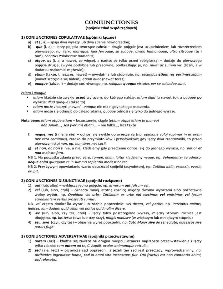 CONIUNCTIONES (spójniki zdań współrzędnych) 1) CONIUNCTIONES COPULATIVAE (spójniki łączne) a) et (i, a) – spaja dwa wyrazy lub dwa zdania równorzędne; b) -que (i, a) – łączy pojęcia tworzące całość – drugie pojęcie jest uzupełnieniem lub rozszerzeniem pierwszego, np. terra marrique, igni ferroque, se suaque, divina humanaque, ultro citroque (tu i tam), Senatus Polulusque Romanus; c) atque, ac (i, a, a nawet, co więcej, a nadto; ac tylko przed spółgłoską) – dodaje do pierwszego pojęcia drugie, zwykle podobne lub przeciwne, podkreślając je, np. multi ac summi viri (liczni, a w dodatku znakomici mężowie); d) etiam (także, i, jeszcze, nawet) – uwydatnia lub stopniuje, np. secundas etiam res pertimescebam (nawet szczęścia się bałem), etiam nunc (nawet teraz); e) quoque (także, i) – dodaje coś równego, np. reliquae quoque virtutes per se colendae sunt. etiam i quoque etiam kładzie się zwykle przed wyrazem, do którego należy: etiam illud (a nawet to), a quoque po wyrazie: illud quoque (także to). etiam może znaczyć „nawet”, quoque nie ma nigdy takiego znaczenia. etiam może się odnosić do całego zdania, quoque odnosi się tylko do jednego wyrazu. Nota bene: etiam atque etiam – bezustannie, ciągle (etiam atque etiam te moneo) non solum..., sed (verum) etiam... – nie tylko…, lecz także f) neque, nec (i nie, a nie) – odnosi się zwykle do orzeczenia (np. opinione vulgi rapimur in errorem nec vera cernimus), rzadko do przymiotników i przysłówków; gdy łączy dwa rzeczowniki, to przed pierwszym stoi non, np. non cives nec socii. g) et non, ac non (i nie, a nie) kładziemy gdy przeczenie odnosi się do jednego wyrazu, np. patior et non moleste fero. NB 1. Na początku zdania przed vero, tamen, enim, igitur kładziemy neque, np. Vehementer te admiro: neque enim quisquam te in summa sapientia modestior est. NB 2. Przy żywym opowiadaniu warto opuszczać spójniki (asyndeton), np. Catilina abiit, excessit, evasit, erupit. 2) CONIUNCTIONES DISIUNCTIVAE (spójniki rozłączne) 1) aut (lub, albo) – wyklucza jedno pojęcie, np. id verum aut falsum est. 2) vel (lub, albo, czyli) – oznacza mniej istotną różnicę między dwoma wyrazami albo pozostawia wolny wybór, np. Oppidum vel urbs; Catilinam ex urbe vel eiecimus vel emisimus vel ipsum egredientem verbis prosecuti sumus. NB. vel często dookreśla wyraz lub zdanie poprzednie: vel dicam, vel potius, np. Percipitis animis, iudices, iam dudum quid velim vel potius quid nolim dicere. 3) -ve (lub, albo, czy też, czyli) – łączy tylko poszczególne wyrazy, między którymi różnica jest obojętna, np. bis terve (dwa lub trzy razy), magis minusve (w większym lub mniejszym stopniu) 4) seu, sive (czyli, czy też) – objaśnia wyraz poprzedni, np. Cato Maior sive de senectute; discessus sive potius fuga. 3) CONIUNCTIONES ADVERSATIVAE (spójniki przeciwstawne) 1) autem (zaś) – kładzie się zawsze na drugim miejscu; oznacza najsłabsze przeciwstawienie i łączy tylko zdania: cum autem ad te, C. Aquili, oculos animumque rettuli... 2) sed (ale, lecz) – ogranicza sąd poprzedni, a jeżeli ten sąd jest przeczący, wprowadza inny, np. Alcibiades ingeniosus homo, sed in omni vita inconstans fuit. Otii fructus est non contentio animi, sed relaxatio. NB. Sed stoi często na początku zdania, jeśli się przerywa tok mowy i przechodzi do czegoś innego, np. Ego a Quinto nostro dissentio. Sed ea, quae restant, audiamus. 3) vero (zaś, lecz) – kładzie się zawsze na drugim miejscu; przeciwstawia poprzedniej myśli myśl drugą, ważniejszą, np. haec sunt leviora, illa vero gravia et magna. 4) at (ale, a tymczasem, natomiast) – występuje po zdaniach twierdzących i przeciwstawia z naciskiem jedną rzecz drugiej, np.: Brevis nobis vita data est, at memoria bene redditae vitae sempiterna. NB. At często wprowadza zarzut lub zbijanie zarzutu, np. At memoria minuitur. credo, nisi eam exerceas, aut etiam si sis natura tardior. 5) atqui (jednak, ale jednak) – stoi na pierwszym miejscu w zarzutach (np. o rem, inquis, difficilem et inexplicabilem; atqui explicanda est) i sylogizmach (np. omnes quadrupedes bestiae rapaces carne vescuntur; atqui nulla bestia ruminans carne vescitur: ergo nulla bestia ruminans rapax est). 6) tamen (jednak, przecież, wszelako) – przeciwstawienie do zdania przyzwalającego, np. Ut desint vires, tamen est laudanda voluntas. Spójnikom przeciwstawnym odpowiada często w zdaniu poprzedzającym quidem (wprawdzie, właśnie, przynajmniej), np. Plurima quidem proferre possumus, sed modus adhibendus est. 4) CONIUNCTIONES CONCLUSIVAE (spójniki wynikowe) 1) itaque (zatem, przeto, i tak) – przytacza skutek rzeczywisty, np. itaque a servis sepultus est. 2) ergo, igitur (a więc) – w sylogizmach, np. Omnes homines mortales sunt. Gaius autem homo est. Ergo (igitur) Gaius mortalis est. 3) proinde (a więc, tedy) – tylko w napomnieniach i rozkazach, np. Proinde aut exeant aut quiescant. 5) CONIUNCTIONES CAUSALES (spójniki przyczynowe) 1) nam (albowiem) – stoi na początku zdania, np. Nam quid ego de consulatu loquar? 2) enim (bowiem) - stoi na drugim miejscu, np. Quid enim nunc agam? Ćwiczenia. Wskaż i nazwij spójniki. 1) Frustra meae vitae subvenire conamini proinde abite. 2) Si mecum adesses, Brundisium navigarem, sine te autem hic manere malo. 3) Negasne quod antea dixisti? Si enim id negabis, improbe mentiri videbere. 4) Vi victa vis est vel potius virtute opressa audacia. 5) Nonne optimus et gravissimus quisque confitetur multa se ignorare et multa sibi etiam atque etiam esse discenda? 6) Neque audent neque id se facere sine summo periculo posse arbitrantur. Vident enim et sentiunt hoc idem quod vos: unum esse qui hoc facere possit. 7) Ter quaterve patrem tuum vidi, sed dubito an eum in platea recognoscere possim. 8) Divitiae et robur mox te relinquere possunt, immortalia autem sunt tua gesta. 9) Etiam tum, cum oculi omnium in te unum coniecti sun