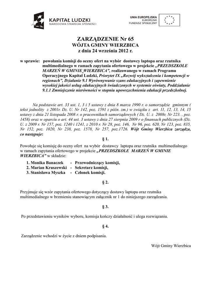 ZARZĄDZENIE Nr 65 WÓJTA GMINY WIERZBICA z dnia 24 września 2012 r. w sprawie: powołania komisji do oceny ofert na wybór dostawcy laptopa oraz rzutnika multimedialnego w ramach zapytania ofertowego w projekcie „PRZEDSZKOLE MARZEŃ W GMINIE WIERZBICA”, realizowanego w ramach Programu Operacyjnego Kapitał Ludzki, Priorytet IX „Rozwój wykształcenia i kompetencji w regionach”, Działanie 9.1 Wyrównywanie szans edukacyjnych i zapewnienie wysokiej jakości usług edukacyjnych świadczonych w systemie oświaty, Poddziałanie 9.1.1 Zmniejszenie nierówności w stopniu upowszechnienia edukacji przedszkolnej. Na podstawie art. 33 ust. 1, 3 i 5 ustawy z dnia 8 marca 1990 r. o samorządzie gminnym ( tekst jednolity z 2001r. Dz. U. Nr 142, poz. 1591 z późn. zm.) w związku z art. 11, 12, 13, 14, 15 ustawy z dnia 21 listopada 2008 r. o pracownikach samorządowych ( Dz. U. z 2008r, Nr 223. , poz. 1458) oraz w oparciu o art. 44 ust. 3 ustawy z dnia 27 sierpnia 2009 r o finansach publicznych (Dz. U. z 2009 r. Nr 157, poz. 1240 i 1241, z 2010 r. Nr 28, poz. 146, Nr 96, poz. 620, Nr 123, poz. 835, Nr 152, poz. 1020, Nr 238, poz. 1578, Nr 257, poz.1726. Wójt Gminy Wierzbica zarządza, co następuje: § 1. Powołuje się komisję do oceny ofert na wybór dostawcy laptopa oraz rzutnika multimedialnego w ramach zapytania ofertowego w projekcie „PRZEDSZKOLE MARZEŃ W GMINIE WIERZBICA” w składzie: 1. Monika Banaczek - Przewodniczący komisji, 2. Marian Kruszewski - Sekretarz komisji, 3. Stanisława Myszka - Członek komisji. § 2. Przyjmuje się wzór zapytania ofertowego dotyczący dostawy laptopa oraz rzutnika multimedialnego w brzmieniu stanowiącym załącznik nr 1 do niniejszego zarządzania. § 3. Po przedstawieniu wyników wyboru, komisja kończy działalność i ulega rozwiązaniu. § 4. Zarządzenie wchodzi w Ŝycie z dniem podpisania. Wójt Gminy Wierzbica Załącznik nr 1 do Zarządzenia Nr 65/2012 Wójta Gminy Wierzbica z dnia 24-09-2012 r. PROJEKT współfinansowany przez Unię Europejską ze środków Europejskiego Funduszu Społecznego w ramach Poddziałania 9.1.1 Zmniejszenie nierówności w stopniu upowszechnienia edukacji przedszkolnej tytuł projektu: „Przedszkole marzeń w gminie Wierzbica” GMINA WIERZBICA ul. Kościuszki 73, 26-680 Wierzbica NIP: 948-238-24-81 tel. (0-48) 618-36-10 ............................................................... ............................................................... ............................................................... ZAPYTAN I E O F E R T O W E W związku z realizacją przez Zamawiającego – Gminą Wierzbica - projektu pt.: „Przedszkole marzeń w gminie Wierzbica” w ramach Programu Operacyjnego Kapitał Ludzki, Priorytet IX „Rozwój wykształcenia i kompetencji w regionach”, Działanie 9.1 Wyrównywanie szans edukacyjnych i zapewnienie wysokiej jakości usług edukacyjnych świadczonych w systemie oświaty, Poddziałanie 9.1.1 Zmniejszenie nierówności w stopniu upowszechnienia edukacji przedszkolnej. Zamawiający zaprasza do złoŜenia oferty – na zakup pomocy dydaktycznych do realizacji zajęć programowych: laptop, rzutnik multimedialny. I. PRZEDMIOT ZAMÓWIENIA: Projektor multimedialny parametry przynajmniej: jasność. 2200 ANSI, kontrast 3000:1, rozdzielczość 800x600, Ŝywotność lampy 3000h, technologia DLP, zoom, złącze HDMI, na wyposaŜeniu ekran przenośny na statywie 150x150 i kabel HDMI 10 metrów. Laptop do zajęć dydaktycznych parametry przynajmniej: procesor dwurdzeniowy Intel, pamięć operacyjna 4GB, dysk twardy 320GB, matryca 15,6”, karta bezprzewodowa WIFI, system operacyjny Windows7 64bit, złącza HDMI i 2xUSB 2.0. a/ Do zadań wykonawcy będzie naleŜało zakup pomocy dydaktycznych do realizacji zajęć programowych: laptop, rzutnik multimedialny– według wytycznych Zamawiającego b/ Zamawiający nie dopuszcza moŜliwości składania ofert częściowych, ani wariantowych. KRYTERIA OCENY OFERT: Nazwa kryterium Waga Cena 100 % Cena - maksymalną liczbę 100 punktów dla tego kryterium otrzyma Wykonawca, który zaproponuje najniŜszą całkowitą cenę brutto za realizację przedmiotu zamówienia („Cena”), natomiast pozostali Wykonawcy otrzymają odpowiednio mniejszą liczbę punktów zgodnie z poniŜszym wzorem: C - liczba punktów przyznanych Wykonawcy w kryterium Cena : C = CN × 100 C OB gdzie: CN - najniŜsza zaoferowana Cena za wykonanie przedmiotu zamówienia COB – Cena zaoferowana w ofercie badanej. Zamawiający dopuszcza moŜliwość zaproszenia wykonawcy, który złoŜył najkorzystniejszą ofertę w celu przeprowadzenia ostatecznych negocjacji. OSOBY WYZNACZONE PRZEZ ZAMAWIAJĄCEGO DO KONTAKTU Z WYKONAWCAMI : Wszelkie informacje udzielane będą przez : Paweł Koch – kierownik projektu tel. 661933873 TERMIN ZŁOśENIA OFERTY (WRAZ Z WYPEŁNIONYM ZAŁĄCZNIKIEM) : do dnia ..............................do godziny ...................... . Oferty (zawierające Załącznik nr 1 – Formularz cenowy i Załącznik nr 2 – Oświadczenie Wykonawcy), które wpłyną po ww. terminie nie będą podlegały rozpatrzeniu. Oferty moŜna składać : osobiście na adres Gmina Wierzbica ul. Kościuszki 73; 26-680 Wierzbica lub przesłać pocztą na niŜej wskazany adres. Zamawiający dopuszcza złoŜenie oferty w formie e-mailowej na adres e-mail [email protected] ewentualnie fax-em na nr telefonu : 048/618-36-11 Z powaŜaniem : .................................................. - Projekt współfinansowany przez Unię Europejską w ramach Europejskiego Funduszu Społecznego.