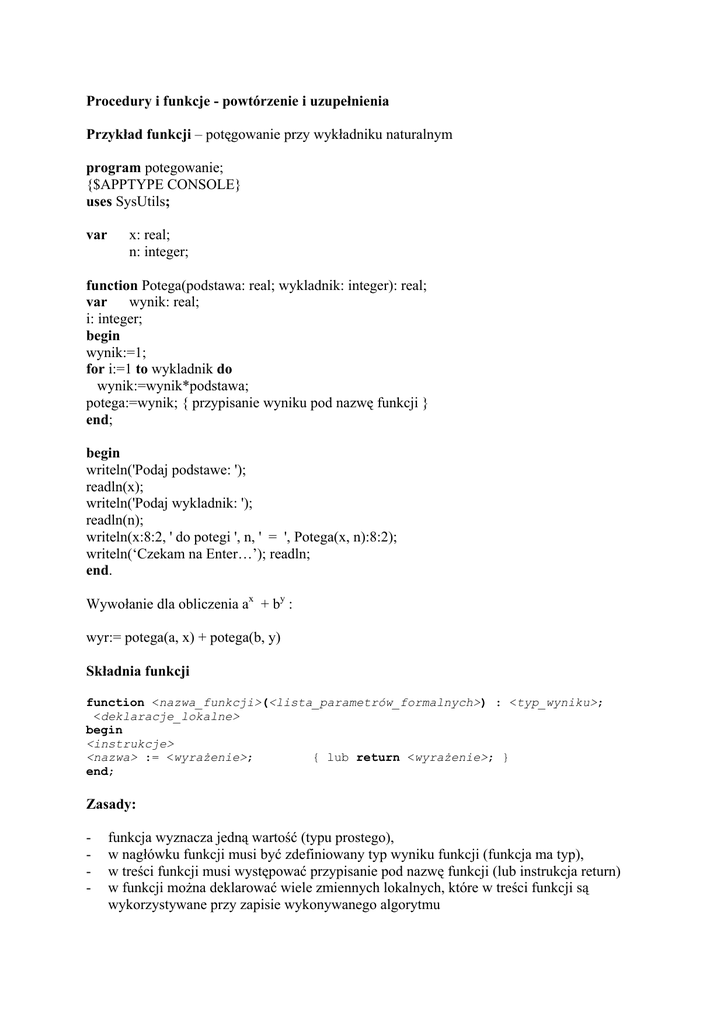 Procedury i funkcje - powtórzenie i uzupełnienia