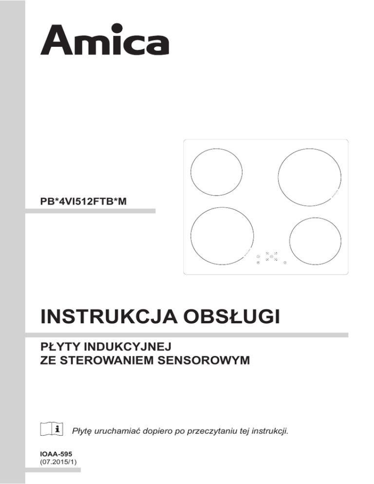 PB*4VI512FTB*M INSTRUKCJA OBSŁUGI PŁYTY INDUKCYJNEJ ZE STEROWANIEM SENSOROWYM Płytę uruchamiać dopiero po przeczytaniu tej instrukcji. IOAA-595 (07.2015/1) SZANOWNY KLIENCIE, Płyta Amica to połączenie wyjątkowej łatwości obsługi i doskonałej efektywności. Po przeczytaniu instrukcji, obsługa płyty nie będzie problemem. Płyta, która opuściła fabrykę była dokładnie sprawdzona przed zapakowaniem pod względem bezpieczeństwa i funkcjonalności na stanowiskach kontrolnych. Prosimy Państwa o uważną lekturę instrukcji obsługi przed uruchomieniem urządzenia. Przestrzeganie zawartych w niej wskazówek uchroni Państwa przed niewłaściwym użytkowaniem. Instrukcję należy zachować i przechowywać tak, aby mieć ją zawsze pod ręką. Należy dokładnie przestrzegać instrukcji obsługi w celu uniknięcia nieszczęśliwych wypadków. Uwaga! Urządzenie obsługiwać tylko po przeczytaniu niniejszej instrukcji. Urządzenie zostało zaprojektowane wyłącznie jako urządzenie do gotowania.Każde inne jego zastosowanie (np. do ogrzewania pomieszczeń) jest niezgodne z jego przeznaczeniem i może być niebezpieczne. Producent zastrzega sobie możliwość dokonywania zmian nie wpływających na działanie urządzenia. Oświadczenie producenta Producent deklaruje niniejszym, że wyrób ten spełnia zasadnicze wymagania wymienionych poniżej dyrektyw europejskich: ● dyrektywy niskonapięciowej 2006/95/WE, ● dyrektywy kompatybilności elektromagnetycznej 2004/108/WE, ● dyrektywy ekoprojektowania 2009/125/WE, i dlatego wyrób został oznakowany oraz została wystawiona dla niego deklaracja zgodności udostępniana organom nadzorującym rynek. Masz wątpliwości? Nie wszystko, co przeczytałeś w instrukcji jest zrozumiałe zadzwoń do Centrum Serwisowego, gdzie uzyskasz wszechstronną pomoc. tel. 801 801 800 2 SPIS TREŚCI Podstawowe informacje.........................................................................................2 Wskazówki dotyczące bezpieczeństwa użytkowania..............................................4 Opis wyrobu............................................................................................................8 Instalacja..................................................................................................................9 Obsługa..................................................................................................................14 Czyszczenie i konserwacja...................................................................................26 Postępowanie w sytuacjach awaryjnych............................................................28 Dane techniczne....................................................................................................30 Gwarancja, obsługa posprzedażna.....................................................................31 3 WSKAZÓWKI DOTYCZĄCE BEZPIECZEŃSTWA UŻYTKOWANIA Uwaga.Urządzenie i jego dostępne części stają się gorące podczas użycia. Możliwość dotknięcia elementów grzejnych powinno być objęte szczególną troską. Dzieci poniżej 8 roku życia powinny trzymać się z daleka, chyba że są pod stałą opieką. Niniejszy sprzęt może być używany przez dzieci w wieku od 8 lat i wyżej i osoby z ograniczeniami fizycznymi, czuciowymi albo umysłowymi albo brakiem doświadczenia i wiedzy, jeśli odbywa się pod nadzorem lub zgodnie z instrukcją użytkowania sprzętu, przekazanej przez osoby odpowiadające za ich bezpieczeństwo. Należy zwracać uwagę na dzieci, aby nie bawiły się sprzętem. Sprzątanie i czynności obsługowe nie powinny być robione przez dzieci bez nadzoru. Uwaga. Gotowanie bez nadzoru tłuszczu lub oleju na płycie kuchennej może być niebezpieczne i doprowadzić do pożaru. NIGDY nie próbuj gasić ognia wodą, ale wyłącz urządzenie i wtedy przykryj płomień np. pokrywką lub niepalnym kocem. Uwaga. Niebezpieczeństwo pożaru: nie gromadź rzeczy na powierzchni do gotowania. 4 WSKAZÓWKI DOTYCZĄCE BEZPIECZEŃSTWA UŻYTKOWANIA Uwaga. Jeżeli powierzchnia płyty jest pęknięta, wyłączyć prąd, aby uniknąć porażenia prądem elektrycznym. Przedmiotów metalowych, takich jak noże, widelce, łyżki i pokrywki oraz folii aluminiowej nie zaleca się kłaść na powierzchni płyty kuchennej, gdyż mogą się one stać gorące. Po użyciu wyłącz element grzejny płyty wyłącznikiem i nie polegaj na wskazaniach detektora naczyń. Urządzeniem nie należy sterować zewnętrznym zegarem lub niezależnym układem zdalnego sterowania. Do czyszczenia płyty nie wolno używać sprzętu do czyszczenia parą. ● Przed pierwszym użyciem płyty indukcyjnej należy przeczytać instrukcję użytkowania. W ten sposób zapewniamy sobie bezpieczeństwo oraz unikamy uszkodzenia płyty. ● Jeżeli płyta indukcyjna użytkowana jest w bezpośredniej bliskości radia, telewizora lub innego urządzenia emitującego, należy sprawdzić, czy zapewniona jest prawidłowość działania panelu sterującego płytą. ● Płytę winien podłączyć uprawniony instalator – elektryk. ● Nie wolno instalować płyty w pobliżu urządzeń chłodniczych. ● Meble w których zabudowywana jest płyta, muszą być odporne na temperatury ok 100oC. Dotyczy to oklein,krawędzi,powierzchni wykonanych z tworzyw sztucznych, klejów oraz lakierów. ● Płytę należy użytkować tylko po jej zabudowaniu. W ten sposób zabezpieczamy się przed dotknięciem części pozostających pod napięciem. 5 WSKAZÓWKI DOTYCZĄCE BEZPIECZEŃSTWA UŻYTKOWANIA ● Naprawy urządzeń elektrycznych mogą przeprowadzać tylko specjaliści. Niefachowe naprawy powodują poważne niebezpieczeństwo dla użytkownika. ● Urządzenie zostaje tylko wówczas odłączone od sieci elektrycznej, gdy zostanie wyłączony bezpiecznik lub wtyczka zostanie wyciągnięta z gniazdka. ● Wtyczka przewodu przyłączeniowego powinna być dostępna po zainstalowaniu płyty. ● Należy 