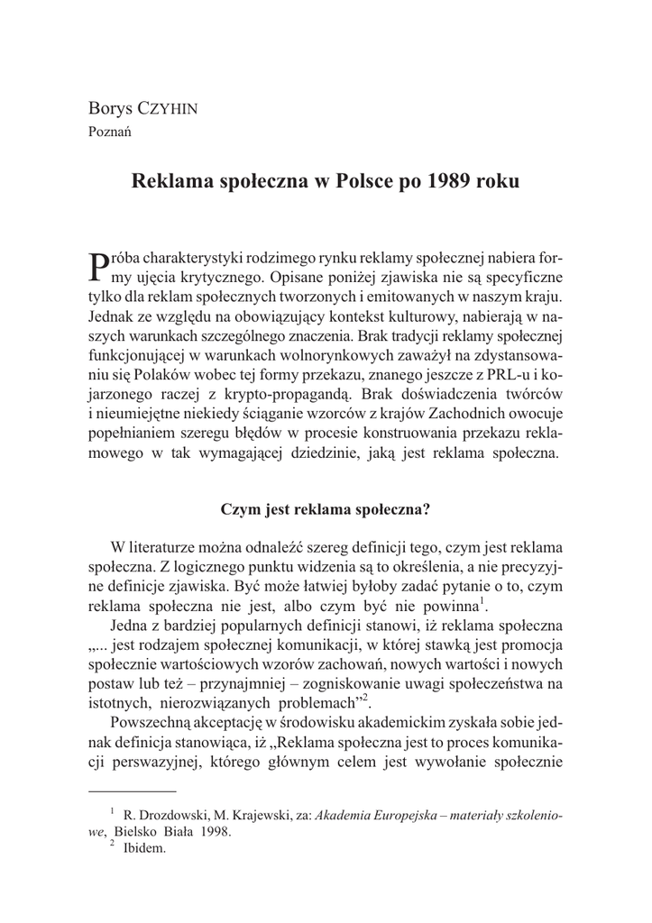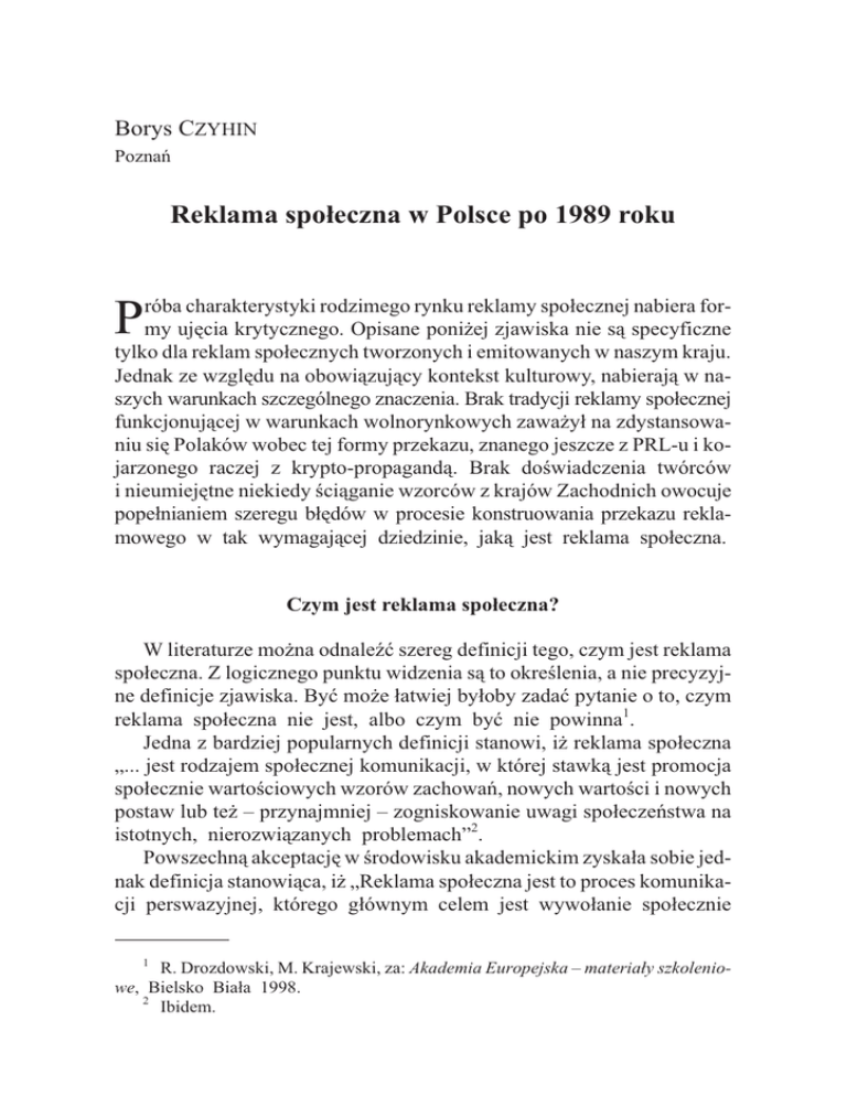 Borys CZYHIN Poznañ Reklama spo³eczna w Polsce po 1989 roku P róba charakterystyki rodzimego rynku reklamy spo³ecznej nabiera formy ujêcia krytycznego. Opisane poni¿ej zjawiska nie s¹ specyficzne tylko dla reklam spo³ecznych tworzonych i emitowanych w naszym kraju. Jednak ze wzglêdu na obowi¹zuj¹cy kontekst kulturowy, nabieraj¹ w naszych warunkach szczególnego znaczenia. Brak tradycji reklamy spo³ecznej funkcjonuj¹cej w warunkach wolnorynkowych zawa¿y³ na zdystansowaniu siê Polaków wobec tej formy przekazu, znanego jeszcze z PRL-u i kojarzonego raczej z krypto-propagand¹. Brak doœwiadczenia twórców i nieumiejêtne niekiedy œci¹ganie wzorców z krajów Zachodnich owocuje pope³nianiem szeregu b³êdów w procesie konstruowania przekazu reklamowego w tak wymagaj¹cej dziedzinie, jak¹ jest reklama spo³eczna. Czym jest reklama spo³eczna? W literaturze mo¿na odnaleŸæ szereg definicji tego, czym jest reklama spo³eczna. Z logicznego punktu widzenia s¹ to okreœlenia, a nie precyzyjne definicje zjawiska. Byæ mo¿e ³atwiej by³oby zadaæ pytanie o to, czym reklama spo³eczna nie jest, albo czym byæ nie powinna1. Jedna z bardziej popularnych definicji stanowi, i¿ reklama spo³eczna „... jest rodzajem spo³ecznej komunikacji, w której stawk¹ jest promocja spo³ecznie wartoœciowych wzorów zachowañ, nowych wartoœci i nowych postaw lub te¿ – przynajmniej – zogniskowanie uwagi spo³eczeñstwa na istotnych, nierozwi¹zanych problemach”2. Powszechn¹ akceptacjê w œrodowisku akademickim zyska³a sobie jednak definicja stanowi¹ca, i¿ „Reklama spo³eczna jest to proces komunikacji perswazyjnej, którego g³ównym celem jest wywo³anie spo³ecznie 1 R. Drozdowski, M. Krajewski, za: Akademia Europejska – materia³y szkoleniowe, Bielsko Bia³a 1998. 2 Ibidem. 94 Borys Czyhin SP 1 ’05 po¿¹danych postaw lub zachowañ”3. Uwagê przyci¹gaj¹ wspólne mianowniki, zawarte równie¿ w definicjach wielu innych autorów, a wiêc promowanie postaw i zachowañ spo³ecznie po¿¹danych oraz jej perswazyjny charakter. Odnosz¹c siê do kondycji reklamy spo³ecznej na naszym rodzimym rynku... Wyodrêbniaj¹ siê co najmniej dwa punkty widzenia – twórców i odbiorców, a wiêc nas wszystkich, które stawiaj¹ reklamê spo³eczn¹ w nieco odmiennym œwietle. Czy Polacy lubi¹ reklamê spo³eczn¹? Okazuje siê, ¿e na ogó³ nie. Osoby w wieku produkcyjnym i starsze doskonale pamiêtaj¹ moralizatorskie przekazy (pe³ni¹ce wówczas funkcje wyznaczone dziœ reklamie spo³ecznej w³aœnie) z okresu PRL. Œwiadomie nie zamierzam nazywaæ ich „reklam¹ spo³eczn¹ tamtych czasów” z uwagi na zaproponowane przeze mnie poni¿ej kryterium dyferencjuj¹cego. Plakaty piêtnuj¹ce alkoholizm, propaguj¹ce bezpieczne formy zachowañ w miejscu pracy by³y powszechnie postrzegane przez odbiorców, jako posiadaj¹ce konotacje propagandowe4. Miêdzy innymi dlatego reklama spo³eczna do dziœ kojarzy siê Polakom z propagand¹. Przede wszystkim jednak nie lubimy byæ pouczani, od czego reklama spo³eczna w swych treœciach nie stroni. Czym jednak ró¿ni siê reklama spo³eczna od tradycyjnie pojmowanej propagandy i edukacji? Najistotniejsz¹ ró¿nic¹ jest styl, jakim operuje. Reklama spo³eczna, w formie, w jakiej zaczyna byæ obecna w naszym kraju jest (a œciœlej mówi¹c powinna byæ, gdy¿ dopiero tak¹ siê staje) form¹ komunikacji marketingowej. Dalszy wzrost tendencji w kierunku wykreowania w³asnego, specyficznego dla tego rodzaju przekazu stylu jest gwarancj¹ jego rozwoju. Zapobiegnie te¿ mo¿liwoœci wch³oniêcia reklamy spo³ecznej przez coraz bardziej drapie¿n¹ – komercyjn¹. Choæ styl coraz bardziej ró¿nicuje te dwie formy reklamy, to jednak zastosowane narzêdzia, rekwizyty, a nawet stereotypy s¹ wielokrotnie identyczne dla formy komercyjnej, jak i spo³ecznej. Grzechy g³ówne polskich reklam spo³ecznych Zdecydowana wiêkszoœæ reklam spo³ecznych ma charakter emocjonalny. Najczêœciej wykorzystywanymi emocjami s¹: wspó³czucie i lêk (obie te emocje jednoczeœnie w bardzo silnym natê¿eniu prezentowane s¹ 3 D. Maison, N. Maliszewski, Co to jest reklama spo³eczna?, w: red. D. Maison, P. Wasilewski, Propaganda dobrych serc, czyli rzecz o reklamie spo³ecznej, Warszawa 2002, s. 19. 4 M. Bogusz, plakat pt. Przestañ piæ! ChodŸ z nami budowaæ szczêœliwe jutro, 1951. SP 1 ’05 Reklama spo³eczna w Polsce po 1989 roku 95 w telewizyjnych spotach reklamowych kampanii „Z³y dotyk”)5. Twórcy uciekaj¹ siê do epatowania lêkiem, je¿eli zak³adaj¹, ¿e ich odbiorca powinien podj¹æ jakieœ dzia³ania dla subiektywnie rozumianego w³asnego dobra. Wspó³czucie zaœ jest œrodkiem wykorzystywanym w celu nak³onienia adresata do aktów pomocy osobom jej potrzebuj¹cym (najczêœciej w przypadku akcji pozyskiwania funduszy na cele charytatywne). Lêk dominuje w kampaniach reklamowych, skierowanych do kierowców, promuj¹cych nieprzekraczanie przepisowej prêdkoœci oraz bezpieczne zachowanie siê na drodze. Czy bior¹c pod uwagê kryterium skutecznoœci mo¿emy przyj¹æ, i¿ odwo³ywanie siê do wywo³ania lêku u odbiorców jest w³aœciwe? Jeden z pierwszych eksperymentów na ten temat przeprowadzili Janis i Feshbach (1953). U czêœci badanych wywo³ywano silny strach – informowano ich o mo¿liwoœci przeniesienia infekcji zêbów równie¿ na inne czêœci cia³a. Jednoczeœnie prezentowano im przezrocza ukazuj¹ce obraz zepsutych zêbów (bodziec awersyjny, wywo³uj¹cy lêk i obrzydzenie). Poprzez redukcje informacji dotycz¹cych konsekwencji takiej infekcji i zmniejszenia iloœci przezroczy sformowano jeszcze dodatkowo dwie ró¿ne wersje tego komunikatu. Czêœci badanych przedstawiano przekaz indukuj¹cy lêk na poziomie umiarkowanym, a drugiej grupie komunikat wywo³uj¹cy niewielki lêk. Okaza³o siê, ¿e wraz ze wzrostem nasycenia przekazu perswazyjnego lêkiem, spada³a skutecznoœæ komunikatu, której miar¹ by