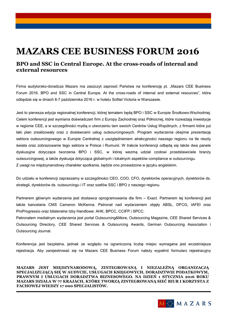 MAZARS CEE BUSINESS FORUM 2016 BPO and SSC in Central Europe. At the cross-roads of internal and external resources Firma audytorsko-doradcza Mazars ma zaszczyt zaprosić Państwa na konferencję pt. „Mazars CEE Business Forum 2016. BPO and SSC in Central Europe. At the cross-roads of internal and external resources”, która odbędzie się w dniach 6-7 października 2016 r. w hotelu Sofitel Victoria w Warszawie. Jest to pierwsza edycja regionalnej konferencji, której tematem będą BPO i SSC w Europie Środkowo-Wschodniej. Celem konferencji jest wymiana doświadczeń firm z Europy Zachodniej oraz Północnej, które rozważają inwestycje w regionie CEE, a w szczególności myślą o utworzeniu tam swoich Centrów Usług Wspólnych, z firmami które już taki plan zrealizowały oraz z dostawcami usług outsourcingowych. Program wydarzenia obejmie prezentację sektora outsourcingowego w Europie Centralnej z uwzględnieniem atrakcyjności naszego regionu na tle reszty świata oraz zobrazowanie tego sektora w Polsce i Rumunii. W trakcie konferencji odbędą się także dwa panele dyskusyjne dotyczące tworzenia BPO i SSC, w której wezmą udział czołowi przedstawiciele branży outsourcingowej, a także dyskusja dotycząca globalnych i lokalnych aspektów compliance w outsourcingu. Z uwagi na międzynarodowy charakter spotkania, będzie ono prowadzone w języku angielskim. Do udziału w konferencji zapraszamy w szczególności CEO, COO, CFO, dyrektorów operacyjnych, dyrektorów ds. strategii, dyrektorów ds. outsourcingu i IT oraz szefów SSC i BPO z naszego regionu. Partnerem głównym wydarzenia jest dostawca oprogramowania dla firm – Exact. Partnerem tej konferencji jest także kancelaria CMS Cameron McKenna. Patronat nad wydarzeniem objęły ABSL, DFCG, IAFEI oraz ProProgressio oraz bilateralne Izby Handlowe: AHK, BPCC, CCIFP i SPCC. Patronatem medialnym wydarzenia jest portal Outsourcing&More, Outsourcing Magazine, CEE Shared Services & Outsourcing Directory, CEE Shared Services & Outsourcing Awards, German Outsourcing Association i Outsourcing Journal. Konferencja jest bezpłatna, jednak ze względu na ograniczoną liczbę miejsc wymagana jest wcześniejsza rejestracja. Aby zarejestrować się na Mazars CEE Business Forum należy wypełnić formularz rejestracyjny MAZARS JEST MIĘDZYNARODOWĄ, ZINTEGROWANĄ I NIEZALEŻNĄ ORGANIZACJĄ SPECJALIZUJĄCĄ SIĘ W AUDYCIE, USŁUGACH KSIĘGOWYCH, DORADZTWIE PODATKOWYM, PRAWNYM I USŁUGACH DORADZTWA BIZNESOWEGO. NA DZIEŃ 1 STYCZNIA 2016 ROKU MAZARS DZIAŁA W 77 KRAJACH, KTÓRE TWORZĄ ZINTEGROWANĄ SIEĆ BIUR I KORZYSTA Z FACHOWEJ WIEDZY 17 000 SPECJALISTÓW. dostępny na stronie http://www.mazars.pl/Home/News/Events/Conferences/Mazars-CEE-Business-Forum-2016 i odesłać go na adres [email protected] lub faksem na nr +48 22 25 55 299. Zapraszamy także do obejrzenia video promującego konferencję pod adresem: https://www.youtube.com/watch?v=bJs63HdELVY Więcej informacji: Renata Stefanowska Manager Działu Komunikacji i Marketingu Mazars, ul. Piękna 18, 00-549 Warszawa tel. +48 22 25 55 200; +48 605 36 71 35 e-mail: [email protected] Dominika Przekopowska Dział Komunikacji i Marketingu Mazars, ul. Piękna 18, 00-549 Warszawa tel. +48 22 25 55 263 e-mail: [email protected] Szczegółowe informacje dostępne na: www.mazars.pl MAZARS JEST MIĘDZYNARODOWĄ, ZINTEGROWANĄ I NIEZALEŻNĄ ORGANIZACJĄ SPECJALIZUJĄCĄ SIĘ W AUDYCIE, USŁUGACH KSIĘGOWYCH, DORADZTWIE PODATKOWYM, PRAWNYM I USŁUGACH DORADZTWA BIZNESOWEGO. NA DZIEŃ 1 STYCZNIA 2016 ROKU MAZARS DZIAŁA W 77 KRAJACH, KTÓRE TWORZĄ ZINTEGROWANĄ SIEĆ BIUR I KORZYSTA Z FACHOWEJ WIEDZY 17 000 SPECJALISTÓW.