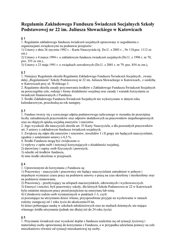 Regulamin Zakładowego Funduszu Świadczeń Socjalnych Szkoły Podstawowej nr 22 im. Juliusza Słowackiego w Katowicach §1 1. Regulamin zakładowego funduszu świadczeń socjalnych opracowany w uzgodnieniu z organizacjami związkowymi na podstawie przepisów: 1) Ustawy z dnia 26 stycznia 1982 r. - Karta Nauczyciela (tj. Dz.U. z 2003 r. , Nr 118,poz. 1112 ze zm.) 2) Ustawy z 4 marca 1994 r. o zakładowym funduszu świadczeń socjalnych (Dz.U. z 1996 r. nr 70, poz. 355 ze zm.), 3) Ustawy z 23 maja 1991 r. o związkach zawodowych (Dz.U. z 2001 r. nr 79. poz. 854 ze zm.), §2 1. Niniejszy Regulamin określa Regulamin Zakładowego Funduszu Świadczeń Socjalnych , zwany dalej „Regulaminem” Szkoły Podstawowej nr 22 im. Juliusza Słowackiego w Katowicach., z siedzibą w Katowicach przy ul. Wolskiego 3. 2. Regulamin określa zasady przyznawania środków z Zakładowego Funduszu Świadczeń Socjalnych na poszczególne cele, rodzaje i formy działalności socjalnej oraz zasady i warunki korzystania ze świadczeń finansowanych z Funduszu. 3. Środki Zakładowego Funduszu Świadczeń Socjalnych nie wykorzystane w danym roku kalendarzowym, przechodzą na rok następny. §3 1. Fundusz tworzy się z corocznego odpisu podstawowego naliczonego w stosunku do przeciętnej liczby zatrudnionych pracowników oraz odpisów dodatkowych na pracowników niepełnosprawnych oraz na objętych opieką socjalną emerytów i rencistów. 2. Jego wysokość dla nauczycieli określa art. 53 Karty Nauczyciela, a dla pozostałych pracowników art. 5 ustawy o zakładowym funduszu świadczeń socjalnych. 3. Zwiększa się odpis dla emerytów i rencistów, inwalidów I i II grupy nie będących nauczycielami, zgodnie z ustaleniami ustawy o 6,5 %. 4. Środki Funduszu mogą być zwiększone o: 1) wpływy z opłat osób i instytucji korzystających z działalności socjalnej, 2) darowizny i zapisy osób fizycznych i prawnych, 3) odsetki od środków funduszu, 4) inne środki określone w przepisach. §4 1. Uprawnionymi do korzystania z Funduszu są: 1) Pracownicy - nauczyciele i pracownicy nie będący nauczycielami zatrudnieni w pełnym i niepełnym wymiarze czasu pracy na podstawie umowy o pracę na czas określony i nieokreślony oraz na podstawie mianowania. 2) Pracownicy - przebywający na urlopach macierzyńskich, zdrowotnych i wychowawczych. 3) Emeryci i renciści, byli pracownicy szkoły, dla których Szkoła Podstawowa nr 22 w Katowicach była ostatnim miejscem pracy przed przejściem na emeryturę lub rentę. 4) Członkowie rodzin osób wymienionych w punktach 1-3, czyli: a) pozostające na utrzymaniu dzieci własne, przysposobione przyjęte na wychowanie w ramach rodziny zastępczej od 1 roku życia do ukończenia18 lat, b) dzieci pobierające naukę w szkołach młodzieżowych oraz na studiach dziennych, nie mające własnego źródła utrzymania (jednak nie dłużej niż do 24 roku życia). §5 1. Przyznanie świadczeń oraz wysokość dopłat z funduszu uzależnia się od sytuacji życiowej i materialnej osoby uprawnionej do korzystania z Funduszu, a w przypadku udzielania pomocy na cele mieszkaniowe również od sytuacji mieszkaniowej tej osoby. 2. Fundusz służy wykorzystaniu zbiorowemu. Niekorzystanie z niego przez uprawnioną osobę nie jest podstawą do żądania jakiegokolwiek ekwiwalentu lub odszkodowania. 3. Działalność socjalna prowadzona jest w oparciu o roczny plan dochodów i wydatków działalności socjalnej, sporządzony przez pracodawcę w uzgodnieniu z zakładowymi organizacjami związkowymi w terminie do dnia 31 marca każdego roku. 4. Środki Funduszu nie mogą być wykorzystane na inne, niż zawarte w regulaminie cele, a zobowiązania Funduszu nie mogą przekraczać zgromadzonych na rachunku bankowym środków. 5. W przypadku likwidacji Szkoły organ prowadzący szkołę wskaże inną szkołę, w której będzie naliczany odpis na ZFŚS na każdego nauczyciela będącego emerytem lub rencista zlikwidowanej szkoły. Osoby te korzystają z usług i świadczeń finansowanych z Funduszu na zasadach i warunkach ustalonych w regulaminie obowiązującym w szkole. 6. Środkami Funduszu administruje dyrektor Szkoły, podejmując decyzję o przyznaniu uprawnionym osobom usług, świadczeń i dopłat w uzgodnieniu ze związkami zawodowymi. Dyrektor Szkoły może zlecić komisji socjalnej lub upoważnionym pracownikom zadanie zbierania, rejestracji i kwalifikowania złożonych wniosków i podań zgodnie z postanowieniami niniejszego Regulaminu. 7. O wysokości pomocy świadczonej w wypadkach losowych lub dla osób znajdujących się w szczególnie trudnej sytuacji życiowej decyduje dyrektor Szkoły w porozumieniu z Komisją Socjalną. 8. Pracownik, któremu nie przyznano usług, świadczeń i dopłat z Funduszu , może wystąpić do Dyrektora Szkoły z wnioskiem o ponowne rozpatrzenie jego podania, zwracając uwagę na naruszenie Regulaminu. 9. Wniosek pracownika o ponowne rozpatrzenie prośby winien zawierać: 1) dane personalne wnioskodawcy, 2) wskazanie usług, świadczeń lub dopłat będących przedmiotem wniosku, 3) wskazanie punktu Regulaminu, który został naruszony. 10. Wniosek winien być złożony w terminie 7 dni od daty podjęcia przez dyrektora decyzji o nieprzyznaniu świadczenia. 11. Dyrektor Szkoły w terminie 14 dni rozpatruje wniosek i po zasięgnięciu opinii jak w ust. 4 podejmuje ostateczna decyzję, powiadamiając o niej wnioskodawcę. §6 1. Środki Funduszu są przeznaczone na: 1) wypłaty świadczenia urlopowego dla nauczycieli, 2) wypoczynku dzieci i młodzieży w wieku od 7 do ukończenia 18 lat, 3) wczasów zakupionych w biurach turystycznych, wczasów profilaktyczno - leczniczych oraz pobytu w sanatorium na leczeniu lub rekonwalescencji, 4) wczasów organizowanych przez pracowników we własnym zakresie - „wczasy pod gruszą”, 5) wypoczynku w dni wolne od pracy, organizowanego w formie turystyki grupowej (wycieczki, rajdy , itp.), 6) biletów wstępu i karnetów