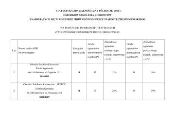 STATYSTYKA ZDAWALNOŚCI ZA I PÓŁROCZE 2016 r. OŚRODKÓW SZKOLENIA KIEROWCÓW ZNAJDUJĄCYCH SIĘ W REJESTRZE PROWADZONYM PRZEZ STAROSTE ZIELONOGÓRSKIEGO /NA PODSTAWIE INFORMACJI OTRZYMANYCH Z WOJEWÓDZKICH OŚRODKÓW RUCHU DROGOWEGO/ Liczba L.p. Nazwa i adres OSK Kategoria egzaminów Nr ewidencyjny prawa jazdy teoretycznych (ogółem)*) Zdawalność egzaminu teoretycznego (wyniki pozytywne - w %) Liczba egzaminów praktycznych (ogółem)*) Zdawalność egzaminu praktycznego (wyniki pozytywne - w %) Ośrodek Szkolenia Kierowców Witold Sypniewski 1 66-110 Babimost ul. Gagarina 12/1 B 35 37% 54 30% B 13 26% 24 29% 00160809 Ośrodek Szkolenia Kierowców „SPEED” 2 Elżbieta Kawecka 66-100 Sulechów os. Promień 3B/1 00200809 Ośrodek Szkolenia Kierowców Prywatna Szkoła Nauki Jazdy A. Kazimowicz, H. 3 Kruk B 9 22% 74 27% B - - - - A 7 14% 5 60% AM - - 3 0% A1 1 100% 5 75% B 83 37% 173 24% B+E - - 33 66% C 34 44% 30 53% 66-100 Sulechów al. Niepodległości 15 00060809 Ośrodek Szkolenia Kierowców 4 Nauka Jazdy Szofer Artur Wojtunik 66-016 Czerwieńsk ul. Jasna 9 00240809 Ośrodek Szkolenia Kierowców HOŁOŁUB Łukasz Hołołub 5 66-100 Sulechów ul. PCK 11/1B 00120809 C+E - - 34 64% D 1 100% 5 60% T 54 26% 11 64% B 74 28% 74 25% B 1 100% 1 100% B 7 12% 12 33% B 14 36% 30 20% A 6 50% 7 43% Ośrodek szkolenia Kierowców Szkoła Nauki Jazdy 6 Dobrychłop Łukasz Dobrychłop 66-016 Płoty ul. Lubuska 16 00190809 Ośrodek szkolenia Kierowców ŚLIWINSKI – 7 NAUKA JAZDY Piotr Śliwiński 66-016 Czerwieńsk ul. Zielonogórska 22 00290809 Ośrodek Nauki Jazdy DOCAR Franciszek 8 Kordziński 66-100 Sulechów ul. Brzozowa 61 00130809 Ośrodek Szkolenia Kierowców LUZIK 9 Jerzy Frączek 66-010 Nowogród Bobrzański ul. Gajowa 10 00220809 10 Ośrodek Szkolenia Kierowców Marcin Pelc 66-010 Nowogród Bobrzański ul. Rynek26 A2 1 100% 2 100% 00110809 B 14 36% 19 31% B+E - - 9 22% C 18 50% 26 54% D - - 3 100% C+E - - 12 50% B 13 69% 74 26% B 90 41% 102 30% A 2 100% 15 50% A1 - - 1 100% Ośrodek Szkolenia Kierowców Zakład Transportowo-Usługowo Handlowy Przemysław 11 Kania 66-010 Babimost Podmokle Wielkie 36a 00210809 Ośrodek Szkolenia Kierowców SPEED s.c. 12 Przemysław Pokład, Eugeniusz Pabisiak 66-100 Sulechów, pl. Ks. Michała Kaczmarka 4 00080809 Ośrodek Szkolenia Kierowców Czesław Hołołub 13 66-100 Sulechów, Brzezie ul. J. Czapskiego 26 00090809 A2 - - 4 50% B 162 50% 251 39% B+E - - 39 69% C 34 38% 102 61% C+E - - 54 70% D 8 43% 19 68% *) uwzględniono wszystkie podejścia Niniejsza analiza statystyczna w zakresie średniej zdawalności osób szkolonych w danym ośrodku sporządzona została na podstawie danych uzyskanych z wojewódzkich ośrodków ruchu drogowego przesłanych przez te ośrodki na podstawie § 37 ust. 1 pkt 1 rozporządzenia Ministra Infrastruktury i Budownictwa z dnia 24 lutego 2016 r. w sprawie egzaminowania osób ubiegających się o uprawnienia do kierowania pojazdami, szkolenia, egzaminowania i uzyskiwania uprawnień przez egzaminatorów oraz wzorów dokumentów stosowanych w tych sprawach. (Dz. U. poz. 232). Sporządzenie i podanie do publicznej wiadomości powyższej analizy wynika z przepisów art. 43 ust. 1 pkt 6 oraz art. 44 ust. 3 ustawy z dnia 5 stycznia 2011 r. o kierujących pojazdami (t.j. Dz. U. z 2016 r. poz. 627 z późn. zm.). Ponadto w roku 2016 nie odnotowano uzasadnionych skarg na działalność ośrodków szkolenia kierowców znajdujących się w ewidencji prowadzonej przez Starostę Zielonogórskiego.
