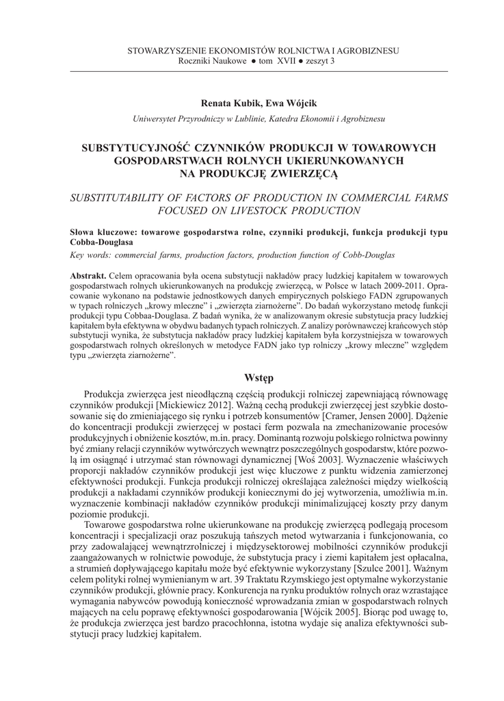 ROLNICTWA I AGROBIZNESU SubstytucyjnośćSTOWARZYSZENIE czynników produkcji wEKONOMISTÓW towarowych gospodarstwach rolnych ukierunkowanych... Roczniki Naukowe ● tom XVII ● zeszyt 3 225 Renata Kubik, Ewa Wójcik Uniwersytet Przyrodniczy w Lublinie, Katedra Ekonomii i Agrobiznesu SUBSTYTUCYJNOŚĆ CZYNNIKÓW PRODUKCJI W TOWAROWYCH GOSPODARSTWACH ROLNYCH UKIERUNKOWANYCH NA PRODUKCJĘ ZWIERZĘCĄ SUBSTITUTABILITY OF FACTORS OF PRODUCTION IN COMMERCIAL FARMS FOCUSED ON LIVESTOCK PRODUCTION Słowa kluczowe: towarowe gospodarstwa rolne, czynniki produkcji, funkcja produkcji typu Cobba-Douglasa Key words: commercial farms, production factors, production function of Cobb-Douglas Abstrakt. Celem opracowania była ocena substytucji nakładów pracy ludzkiej kapitałem w towarowych gospodarstwach rolnych ukierunkowanych na produkcję zwierzęcą, w Polsce w latach 2009-2011. Opracowanie wykonano na podstawie jednostkowych danych empirycznych polskiego FADN zgrupowanych w typach rolniczych „krowy mleczne” i „zwierzęta ziarnożerne”. Do badań wykorzystano metodę funkcji produkcji typu Cobbaa-Douglasa. Z badań wynika, że w analizowanym okresie substytucja pracy ludzkiej kapitałem była efektywna w obydwu badanych typach rolniczych. Z analizy porównawczej krańcowych stóp substytucji wynika, że substytucja nakładów pracy ludzkiej kapitałem była korzystniejsza w towarowych gospodarstwach rolnych określonych w metodyce FADN jako typ rolniczy „krowy mleczne” względem typu „zwierzęta ziarnożerne”. Wstęp Produkcja zwierzęca jest nieodłączną częścią produkcji rolniczej zapewniającą równowagę czynników produkcji [Mickiewicz 2012]. Ważną cechą produkcji zwierzęcej jest szybkie dostosowanie się do zmieniającego się rynku i potrzeb konsumentów [Cramer, Jensen 2000]. Dążenie do koncentracji produkcji zwierzęcej w postaci ferm pozwala na zmechanizowanie procesów produkcyjnych i obniżenie kosztów, m.in. pracy. Dominantą rozwoju polskiego rolnictwa powinny być zmiany relacji czynników wytwórczych wewnątrz poszczególnych gospodarstw, które pozwolą im osiągnąć i utrzymać stan równowagi dynamicznej [Woś 2003]. Wyznaczenie właściwych proporcji nakładów czynników produkcji jest więc kluczowe z punktu widzenia zamierzonej efektywności produkcji. Funkcja produkcji rolniczej określająca zależności między wielkością produkcji a nakładami czynników produkcji koniecznymi do jej wytworzenia, umożliwia m.in. wyznaczenie kombinacji nakładów czynników produkcji minimalizującej koszty przy danym poziomie produkcji. Towarowe gospodarstwa rolne ukierunkowane na produkcję zwierzęcą podlegają procesom koncentracji i specjalizacji oraz poszukują tańszych metod wytwarzania i funkcjonowania, co przy zadowalającej wewnątrzrolniczej i międzysektorowej mobilności czynników produkcji zaangażowanych w rolnictwie powoduje, że substytucja pracy i ziemi kapitałem jest opłacalna, a strumień dopływającego kapitału może być efektywnie wykorzystany [Szulce 2001]. Ważnym celem polityki rolnej wymienianym w art. 39 Traktatu Rzymskiego jest optymalne wykorzystanie czynników produkcji, głównie pracy. Konkurencja na rynku produktów rolnych oraz wzrastające wymagania nabywców powodują konieczność wprowadzania zmian w gospodarstwach rolnych mających na celu poprawę efektywności gospodarowania [Wójcik 2005]. Biorąc pod uwagę to, że produkcja zwierzęca jest bardzo pracochłonna, istotna wydaje się analiza efektywności substytucji pracy ludzkiej kapitałem. 226 Renata Kubik, Ewa Wójcik Celem opracowania była ocena substytucji nakładów pracy ludzkiej kapitałem w towarowych gospodarstwach rolnych ukierunkowanych na produkcję zwierzęcą, określonych według polskiego FADN jako typ rolniczy „krowy mleczne” i „zwierzęta ziarnożerne” w Polsce w latach 2009-2011. Materiał i metodyka badań Materiał empiryczny do badań stanowią dane liczbowe pochodzące z towarowych gospodarstw rolnych znajdujących się w polu obserwacji pPolskiego FADN. Jest to baza danych, w której dane zbierane są według jednolitych zasad, a gospodarstwa tworzą statystycznie reprezentatywną próbę towarowych gospodarstw rolnych funkcjonujących na obszarze Unii Europejskiej (UE), co zapewnia ich porównywalność. Liczba badanych towarowych gospodarstw rolnych dla typu rolniczego „krowy mleczne” wynosiła 2449 w 2009 roku, 2277 w 2010 roku i 2238 w 2011 roku, natomiast dla typu rolniczego „zwierzęta ziarnożerne” odpowiednio: 1625, 1526 i 1400. Liczebności te były wystarczające do zastosowania metody funkcji produkcji rolniczej typu Cobba-Douglasa [Jaworski 1972]. Wyniki badań Charakterystykę statystyczną danych liczbowych obejmującą nazwę, rodzaj cechy według polskiego FADN, średnie arytmetyczne i współczynnik zmienności zestawiono w tabeli 1. Takie same symbole cech przyjęto w całym opracowaniu. Z analizy danych w tabeli 1 wynika, że w badanych latach zmienność rozpatrywanych cech w towarowych gospodarstwach rolnych typu „zwierzęta ziarnożerne” była wyższa niż w typie „krowy mleczne”. Największą zmiennością charakteryzowała się produkcja ogółem i koszty ogółem, a najmniej zróżnicowaną cechą był czas pracy ogółem w obydwu typach badanych gospodarstw. Wynika to z rodzinnego charakteru polskich gospodarstw, w których nakłady pracy ludzkiej są zdeterminowane liczbą członków rodziny. Z porównania średnich wielkości zmiennych w obydwu typach gospodarstw wynika, że w gospodarstwach nastawionych na chów zwierząt ziarnożernych względem gospodarstw z krowami mlecznymi produkcja ogółem i koszty ogółem były wyższe, natomiast czas pracy był niższy. Istotne jest jednak to, że w gospodarstwach typu „krowy mleczne” w analizowanym okresie odnotowano wyższy wzrost produkcji ogółem (50,2%) w porównaniu z gospodarstwami typu „zwierzęta ziarnożerne” (22,4%)