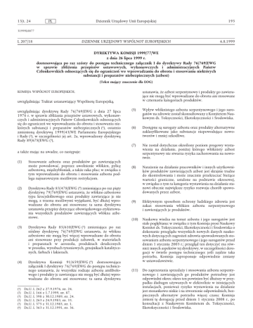 13/t. 24 PL Dziennik Urzędowy Unii Europejskiej 193 31999L0077 L 207/18 DZIENNIK URZĘDOWY WSPÓLNOT EUROPEJSKICH 6.8.1999 DYREKTYWA KOMISJI 1999/77/WE z dnia 26 lipca 1999 r. dostosowująca po raz szósty do postępu technicznego załącznik I do dyrektywy Rady 76/769/EWG w sprawie zbliżenia przepisów ustawowych, wykonawczych i administracyjnych Państw Członkowskich odnoszących się do ograniczeń we wprowadzaniu do obrotu i stosowaniu niektórych substancji i preparatów niebezpiecznych (azbest) (Tekst mający znaczenie dla EOG) ustanawia, że azbest serpentynowy i produkty go zawierające nie mogą być wprowadzane do obrotu ani stosowane w czternastu kategoriach produktów. KOMISJA WSPÓLNOT EUROPEJSKICH, uwzględniając Traktat ustanawiający Wspólnotę Europejską, uwzględniając dyrektywę Rady 76/769/EWG z dnia 27 lipca 1976 r. w sprawie zbliżania przepisów ustawowych, wykonawczych i administracyjnych Państw Członkowskich odnoszących się do ograniczeń we wprowadzaniu do obrotu i stosowaniu niektórych substancji i preparatów niebezpiecznych (1), ostatnio zmienioną dyrektywą 1999/43/WE Parlamentu Europejskiego i Rady (2), w szczególności jej art. 2a, wprowadzony dyrektywą Rady 89/678/EWG (3), (5) Wpływ włóknistego azbestu serpentynowego i jego surogatów na zdrowie został skonsultowany z Komitetem Naukowym ds. Toksyczności, Ekotoksyczności i Środowiska. (6) Dostępne są surogaty azbestu oraz produkty alternatywne zaklasyfikowane jako substancje niepowodujące nowotworów i mniej szkodliwe. (7) Nie został dotychczas określony poziom progowy wystawienia na działanie, poniżej którego włóknisty azbest serpentynowy nie stwarza ryzyka zachorowania na nowotwór. (8) Narażenie na działanie pracowników i innych użytkowników produktów zawierających azbest jest skrajnie trudne do skontrolowania i może znacznie przekraczać bieżące wartości graniczne, ustalone na podstawie okresowej, w związku z tym ta kategoria wystawienia na działanie stanowi obecnie największe ryzyko rozwoju chorób spowodowanych przez azbest. (9) Efektywnym sposobem ochrony ludzkiego zdrowia jest zakaz stosowania włókien azbestu serpentynowego i zawierających je produktów. (10) Naukowa wiedza na temat azbestu i jego surogatów jest stale pogłębiana; w związku z tym Komisja prosi Naukowy Komitet ds. Toksyczności, Ekotoksyczności i Środowiska o dokonanie przeglądu wszystkich nowych danych naukowych dotyczących zagrożeń zdrowia spowodowanych stosowaniem azbestu serpentynowego i jego surogatów przed dniem 1 stycznia 2003 r.; przegląd ten dotyczyć ma również innych aspektów tej dyrektywy, w szczególności derogacji w świetle postępu technicznego; jeśli zajdzie taka potrzeba, Komisja zaproponuje odpowiednie zmiany w ustawodawstwie. (11) Do zaprzestania sprzedaży i stosowania azbestu serpentynowego i zawierających go produktów potrzebny jest odpowiedni okres; okres ten powinien być dłuższy w przypadku diafragm używanych w elektrolizie w istniejących instalacjach, ponieważ ryzyko wystawienia na działanie jest stosunkowo niskie i na stworzenie odpowiednich, bezpiecznych alternatyw potrzeba więcej czasu; Komisja zmieni tę derogację przed dniem 1 stycznia 2008 r., po konsultacji z Naukowym Komitetem ds. Toksyczności, Ekotoksyczności i Środowiska. a także mając na uwadze, co następuje: (1) (2) Stosowanie azbestu oraz produktów go zawierających może powodować, poprzez uwolnienie włókien, pylicę azbestową, międzybłoniak, a także raka płuc; w związku z tym wprowadzanie do obrotu i stosowanie azbestu podlega najsurowszym możliwym restrykcjom. Dyrektywa Rady 83/478/EWG (4) zmieniająca po raz piąty dyrektywę 79/769/EWG ustanawia, że włókno azbestowe typu krocydolitowego oraz produkty zawierające je nie mogą, z trzema możliwymi wyjątkami, być dłużej wprowadzane do obrotu ani stosowane; ta sama dyrektywa ustanawia przepisy dotyczące obowiązkowego etykietowania wszystkich produktów zawierających włókna azbestowe. (3) Dyrektywa Rady 85/610/EWG (5) zmieniająca po raz siódmy dyrektywę 76/769/EWG ustanawia, że włókna azbestowe nie mogą być więcej wprowadzane do obrotu ani stosowane przy produkcji zabawek, w materiałach i preparatach w aerozolu, produktach detalicznych w proszku, wyrobach tytoniowych, grzejnikach katalitycznych, farbach i lakierach. (4) Dyrektywa Komisji 91/659/EWG (6) dostosowująca załącznik I dyrektywy 76/769/EWG do postępu technicznego ustanawia, że wszystkie rodzaje azbestu amfibolowego i produkty je zawierające nie mogą być dłużej wprowadzane do obrotu ani stosowane; ta sama dyrektywa (1) (2) (3) (4) (5) (6) Dz.U. L 262 z 27.9.1976, str. 24. Dz.U. L 166 z 1.7.1999, str. 87. Dz.U. L 398 z 30.12.1989, str. 24. Dz.U. L 263 z 24.9.1983, str. 33. Dz.U. L 375 z 31.12.1985, str. 1. Dz.U. L 363 z 31.12.1991, str. 36. 194 (12) (13) (14) (15) Dziennik Urzędowy Unii Europejskiej PL Niniejsza dyrektywa jest zgodna z dyrektywą Rady 89/391/EWG w sprawie wprowadzenia środków w celu poprawy bezpieczeństwa i zdrowia pracowników w miejscu pracy (1) oraz z odrębnymi dyrektywami Rady, w rozumieniu art. 16 ust. 1 tej dyrektywy, w szczególności z dyrektywą Rady 90/394/EWG z dnia 28 czerwca 1990 r. w sprawie ochrony pracowników przed zagrożeniem dotyczącym narażenia na działanie czynników rakotwórczych podczas pracy (2) zmienioną dyrektywą 97/42/WE (3). Dyrektywa Rady 91/382/EWG (4) zmieniająca dyrektywę 83/477/EWG w sprawie ochrony pracowników przed ryzykiem związanym z narażeniem na działanie azbestu w miejscu pracy, w którym pracownicy stykają się z pyłem azbestowym. 13/t. 24 Artykuł 2 1. Państwa Członkowskie wprowadzą w życie przepisy ustawowe, wykonawcze i administracyjne niezbędne do wykonania niniejszej dyrektywy najpóźniej do dnia 1 stycznia 2005 r. i niezwłocznie powiadomią o tym Komisję. Przyjęte przez Państwa Członkowskie przepisy powinny zawierać odn