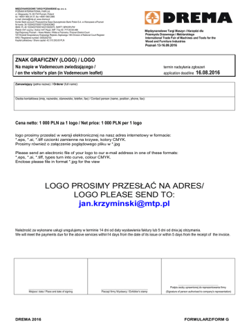 MIĘDZYNARODOWE TARGI POZNAŃSKIE sp. z o. o. POZNAŃ INTERNATIONAL FAIR Ltd. ul. Głogowska 14, 60-734 Poznań, Poland tel. +48/61 869 24 37; fax +48/61 869 2960 e-mail: [email protected]; www.drema.pl Konto/ Bank account: Powszechna Kasa Oszczędności Bank Polski S.A. w Warszawie o/Poznań Nr konta: 38 102040270000110204242962 IBAN: PL 46 102040270000140210929075, SWIFT: BPKOPLPW Płatnik VAT czynny / Active VAT Payer, NIP / Tax ID: 777-00-00-488 Sąd Rejonowy Poznań – Nowe Miasto i Wilda w Poznaniu / Poznan District Court VIII Wydział Gospodarczy Krajowego Rejestru Sądowego / 8th Division of National Court Register KRS / Registered number: 0000202703 Kapitał zakładowy / Share capital: 42 310 200,00 PLN Międzynarodowe Targi Maszyn i Narzędzi dla Przemysłu Drzewnego i Meblarskiego International Trade Fair of Machines and Tools for the Wood and Furniture Industries Poznań 13-16.09.2016 ZNAK GRAFICZNY (LOGO) / LOGO Na mapie w Vademecum zwiedzającego / / on the visitor’s plan (in Vademecum leaflet) termin nadsyłania zgłoszeń application deadline 16.08.2016 Zamawiający (pełna nazwa): / Orderer (full name): Osoba kontaktowa (imię, nazwisko, stanowisko, telefon, fax) / Contact person (name, position, phone, fax): Cena netto: 1 000 PLN za 1 logo / Net price: 1 000 PLN per 1 logo logo prosimy przesłać w wersji elektronicznej na nasz adres internetowy w formacie: *.eps, *.ai, *.tiff czcionki zamienne na krzywe, kolory CMYK. Prosimy również o załączenie poglądowego pliku w *.jpg Please send an electronic file of your logo to our e-mail address in one of these formats: *.eps, *.ai, *.tiff, types turn into curve, colour CMYK. Enclose please file in format *.jpg for the view LOGO PROSIMY PRZESŁAĆ NA ADRES/ LOGO PLEASE SEND TO: [email protected] Należność za wykonane usługi uregulujemy w terminie 14 dni od daty wystawienia faktury lub 5 dni od dnia jej otrzymania. We will meet the payments due for the above services within14 days from the date of its issue or within 5 days from the receipt of the invoice. _________________________________ Miejsce i data / Place and date of signing DREMA 2016 ___________________________________ Pieczęć firmy Wystawcy / Exhibitor’s stamp ______________________________ Podpis osoby uprawnionej do reprezentowania firmy (Signature of person authorised to company's representation) FORMULARZ/FORM G
