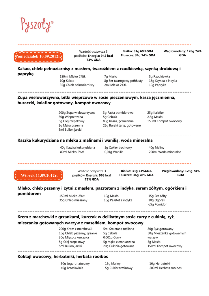 -----------------------------------------------------------------------------------------------------PO Białko: 31g 69%GDA Węglowodany: 128g 74% Wartość odżywcza 3 Tłuszcze: 34g 74% GDA GDA posiłków: Energia: 942 kcal Poniedziałek 10.09.2012r. 73% GDA Kakao, chleb pełnoziarnisy z masłem, twarożkiem z rzodkiewką, szynką drobiową i papryką 150ml Mleko 2%tł. 10g Kakao 35g Chleb pełnoziarnisty 7g Masło 8g Ser twarogowy półtłusty 2ml Mleko 2%tł. 5g Rzodkiewka 15g Szynka z indyka 10g Papryka ------------------------------------------------------------------------------------------------------Zupa wielowarzywna, bitki wieprzowe w sosie pieczeniowym, kasza jęczmienna, buraczki, kalafior gotowany, kompot owocowy 200g Zupa wielowarzywna 30g Wieprzowina 5g Olej rzepakowy 3g Mąka pszenna 5ml Bulion jarski 3g Pasta pomidorowa 5g Cebula 80g Kasza jęczmienna 25g Buraki tarte, gotowane 25g Kalafior 2,5g Masło 150ml Kompot owocowy ------------------------------------------------------------------------------------------------------Kaszka kukurydziana na mleku z malinami i wanilią, woda mineralna a na miodem,bawarka 40g Kaszka kukurydziana 80ml Mleko 2%tł. 5g Cukier trzcinowy 0,01g Wanilia 40g Maliny 200ml Woda mineralna -----------------------------------------------------------------------------------------------------Wtorek 11.09.2012r. Wartość odżywcza 3 posiłków: Energia: 968 kcal 75% GDA Białko: 33g 73%GDA Tłuszcze: 36g 78% GDA Węglowodany: 128g 74% GDA Mleko, chleb pszenny i żytni z masłem, pasztetem z indyka, serem żółtym, ogórkiem i pomidorem 150ml Mleko 2%tł. 10g Masło 15g Ser żółty 35g Chleb mieszany 15g Pasztet z indyka 10g Ogórek q5g Pomidor ------------------------------------------------------------------------------------------------------Krem z marchewki z grzankami, kurczak w delikatnym sosie curry z cukinią, ryż, mieszanka gotowanych warzyw z masełkiem, kompot owocowy 200g Krem z marchewki 15g Chleb pszenny, grzanki 30g Mięso z kurczaka 5g Olej rzepakowy 5ml Bulion jarski 5ml Śmietana roślinna 5g Cebula 0,001g Curry 5g Mąka ziemniaczana 20g Cukinia gotowana 80g Ryż gotowany 30g Mieszanka gotowanych warzyw 3g Masło 150ml Kompot owocowy ------------------------------------------------------------------------------------------------------Koktajl owocowy, herbatniki, herbata rooibos 90g Jogurt naturalny 40g Brzoskwinia 15g Maliny 5g Cukier trzcinowy 16g Herbatniki 200ml Herbata rooibos -------------------------------------------------------------------------------------------------------------Wartość odżywcza 3 posiłków: Energia: 975 kcal 75% GDA Środa 12.09.2012r. Białko: 31g 69%GDA Tłuszcze: 35g 76% GDA Węglowodany: 134g 77% GDA Kakao, chleb pszenny i żytni z masłem, jajkiem, rzodkiewką, sałatka jarzynowa z szynką ` 150ml Mleko 2%tł. 10g Kakao 35g Chleb mieszany 10g Masło 25g Jajko gotowane 10g Rzodkiewka 35g Sałatka jarzynowa z szynką wieprzową, jogurtem i majonezem ------------------------------------------------------------------------------------------------------Zupa selerowa z zieloną pietruszką, kotleciki drobiowe, sos koperkowy, ziemniaki puree, marchewka gotowana, kompot owocowy 200ml Zupa selerowa 1g Pietruszka, natka 35g Mięso z indyka 10g Jaja kurze 5g Mąka ziemniaczana / kukurydziana 3g Olej rzepakowy 2g Koperek 5ml Bulion jarski 5ml Śmietana roślinna 130g Ziemniaki 20ml Mleko 2%tł. 3g Masło 50g Marchew gotowana 2,5g Masło 150ml Kompot owocowy ------------------------------------------------------------------------------------------------------Kisiel owocowy z kawałkami owoców, wafle ryżowe, woda mineralna 130g Kisiel owocowy z kawałkami owoców 10g Wafle ryżowe 200ml Woda mineralna -----------------------------------------------------------------------------------------------------Czwartek 13.09.2012r. Wartość odżywcza 3 posiłków: Energia:956 kcal 74% GDA Białko: 32g 71%GDA Tłuszcze: 32g 70% GDA Węglowodany: 135g 78% GDA Mleko, chleb pszenny i żytni z masłem, twarożkiem ze szczypiorkiem, polędwicą sopocką, papryką i sałatą 150ml Mleko 2%tł. 35g Chleb mieszany 10g Masło 15g Polędwica sopocka 8g Ser twarogowy półtłusty 2ml Mleko 2%tł. 0,5g Szczypiorek 5g Sałata 10g Papryka ------------------------------------------------------------------------------------------------------Zupa pomidorowa ze świeżych pomidorów z ryżem, leczo z indykiem, makaron świderki, brokuły gotowane, kompot owocowy 200g Zupa pomidorowa 20g Ryż gotowany 30g Mięso z indyka 7g Olej rzepakowy 10g Pasta pomidorowa 10g Cebula 10ml Bulion jarski 25g Mieszanka warzyw 80g Makaron świderki 30g Brokuł gotowany 2,5g Masło 150ml Kompot owocowy ------------------------------------------------------------------------------------------------------Pieczone racuszki z jabłkiem, polane jogurtem naturalnym, herbata rooibos 100g Placki ziemniaczane 50g Jabłko 5g Olej rzepakowy 5g Cukier puder 30g Jogurt naturalny 250ml Herbata rooibos -----------------------------------------------------------------------------------------------------PO Białko: 31g 69%GDA Węglowodany: 132g 76% Wartość odżywcza 3 Piątek 14.09.2012r. Tłuszcze: 33g 72% GDA GDA posiłków: Energia: 949 kcal 74% GDA Płatki kukurydziane z rodzynkami na mleku, chleb pszenny z masłem, serem żółtym, ogórkiem, kalarepa do chrupania , herbata rooibos 200ml Herbata rooibos 150ml Mleko 2%tł. 20g Płatki kukurydziane 5g Rodzynki 20g Chleb pszenny 10g Masło 15g Ser żółty 15g Ogórek 20g Kalarepa ------------------------------------------------------------------------------------------------------Zupa warzywna z fasolką szparagową, roagut rybny z warzywami, ziemniaki, kompot owocowy 200g Zupa z fasolką szparagową 35g Morszczuk, filet 50g Mieszanka warzyw gotowanych 10g Cebula 7g Olej rzepakowy 5ml Bulion jarski 5ml Śmietana roślinna 5g Mąka ziemniaczana 130g Ziemniaki 150ml Kompot owocowy -----------------------------------