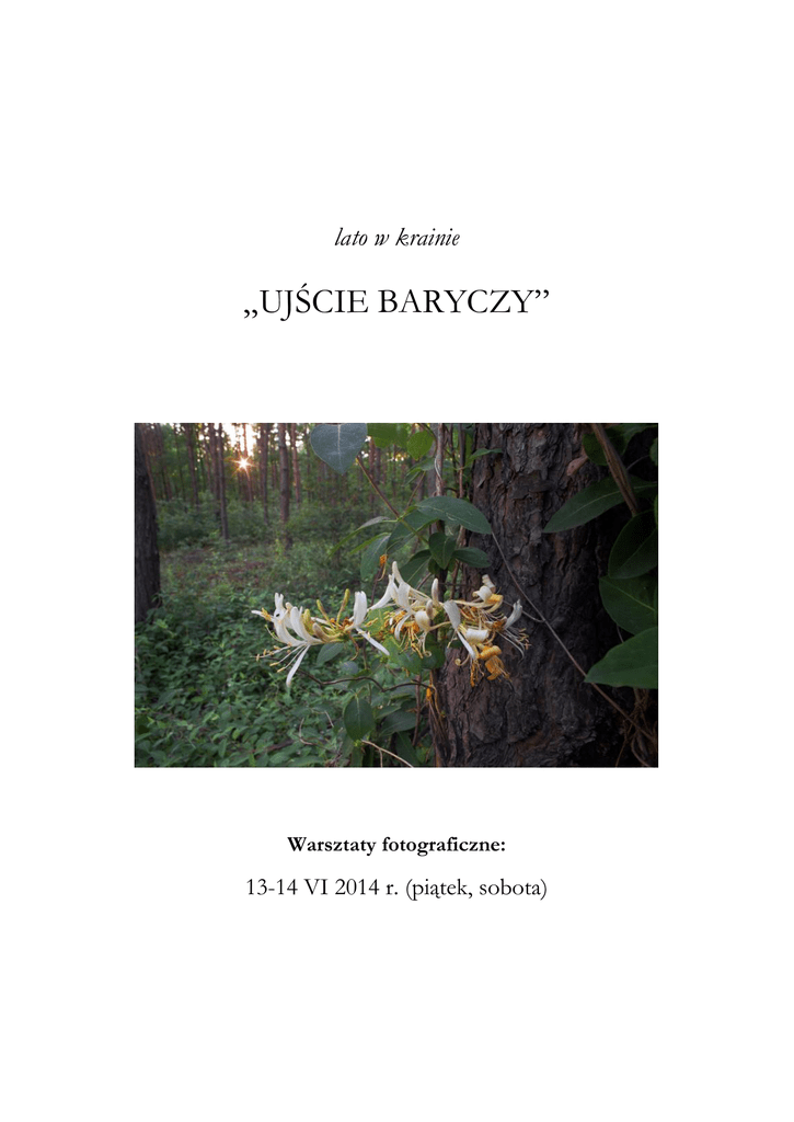 lato w krainie „UJŚCIE BARYCZY” Warsztaty fotograficzne: 13-14 VI 2014 r. (piątek, sobota) Program warsztatów czerwcowych: PIĄTEK 17.00 – 21.00 WYCIECZKA busem po gminie Góra – kościół Bożego Ciała w Górze; wiciokrzew pomorski w Goli Górowskiej; kościół w Starej Górze; zachód słońca na Zbiorniku Ryczeń. * SOBOTA 9.00 –14.00 WYCIECZKA busem po gminie Niechlów – Bełcz Wielki – rzeka Odra oraz wycieczka piesza do Głobic(3 km) pośród starorzeczy (szansa na łabędzia krzykliwego); kościół św. Michała w Żabinie, kościół w Wągrodzie; dolina Odry pod Wyszanowem. 14.00 –16.00 OBIAD w Niechlowie oraz OMÓWIENIE zdjęć z warsztatów majowych przy kawie/herbacie. 16.00 –20.00 WYCIECZKA busem po gminie Wąsosz – platan klonolistny w Lechitowie; wydmy śródlądowe pod Wodnikami; użytek ekologiczny „Wiewierz” (na tropach kwiatu paproci – nasięźrzała); kościół św. Piotra i Pawła w Sułowie Wielkim. Zdjęcia: © Grzegorz Bobrowicz