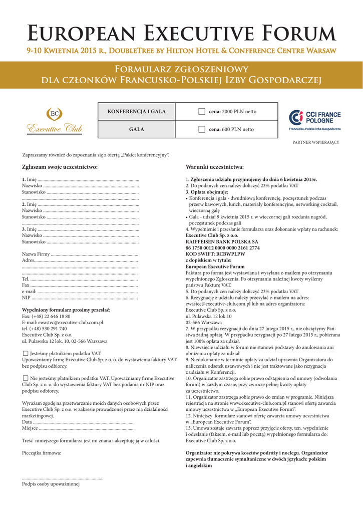 European Executive Forum 9-10 Kwietnia 2015 r., DoubleTree by Hilton Hotel & Conference Centre Warsaw Formularz zgłoszeniowy dla członków Francusko-Polskiej Izby Gospodarczej KONFERENCJA I GALA cena: 2000 PLN netto GALA cena: 600 PLN netto PARTNER WSPIERAJĄCY Zapraszamy również do zapoznania się z ofertą „Pakiet konferencyjny”. Zgłaszam swoje uczestnictwo: Warunki uczestnictwa: 1. Imię ...................................................................................... Nazwisko ................................................................................. Stanowisko .............................................................................. ................................................................................................... 2. Imię ...................................................................................... Nazwisko ................................................................................. Stanowisko .............................................................................. ................................................................................................... 3. Imię ...................................................................................... Nazwisko ................................................................................. Stanowisko .............................................................................. 1. Zgłoszenia udziału przyjmujemy do dnia 6 kwietnia 2015r. 2. Do podanych cen należy doliczyć 23% podatku VAT 3. Opłata obejmuje: •Konferencja i gala - dwudniową konferencję, poczęstunek podczas przerw kawowych, lunch, materiały konferencyjne, networking cocktail, wieczorną galę •Gala - udział 9 kwietnia 2015 r. w wieczornej gali rozdania nagród, poczęstunek podczas gali 4. Wypełnienie i przesłanie formularza oraz dokonanie wpłaty na rachunek: Executive Club Sp. z o.o. RAIFFEISEN BANK POLSKA SA 86 1750 0012 0000 0000 2161 2774 KOD SWIFT: RCBWPLPW z dopiskiem w tytule: European Executive Forum Faktura pro forma jest wystawiana i wysyłana e-mailem po otrzymaniu wypełnionego Zgłoszenia. Po otrzymaniu należnej kwoty wyślemy państwu Fakturę VAT. 5. Do podanych cen należy doliczyć 23% podatku VAT 6. Rezygnację z udziału należy przesyłać e-mailem na adres: [email protected] lub na adres organizatora: Executive Club Sp. z o.o. ul. Puławska 12 lok 10 02-566 Warszawa 7. W przypadku rezygnacji do dnia 27 lutego 2015 r., nie obciążymy Państwa żadną opłatą. W przypadku rezygnacji po 27 lutego 2015 r., pobierana jest 100% opłata za udział. 8. Niewzięcie udziału w forum nie stanowi podstawy do anulowania ani obniżenia opłaty za udział 9. Niedokonanie w terminie opłaty za udział uprawnia Organizatora do naliczenia odsetek ustawowych i nie jest traktowane jako rezygnacja z udziału w Konferencji. 10. Organizator zastrzega sobie prawo odstąpienia od umowy (odwołania forum) w każdym czasie, przy zwrocie pełnej kwoty opłaty za uczestnictwo. 11. Organizator zastrzega sobie prawo do zmian w programie. Niniejsza rejestracja na stronie www.executive-club.com.pl stanowi ofertę zawarcia umowy uczestnictwa w „European Executive Forum”. 12. Niniejszy formularz stanowi ofertę zawarcia umowy uczestnictwa w „European Executive Forum”. 13. Umowa zostaje zawarta poprzez przyjęcie oferty, tzn. wypełnienie i odesłanie (faksem, e-mail lub pocztą) wypełnionego formularza do: Executive Club Sp. z o.o. Nazwa Firmy .......................................................................... Adres........................................................................................ .................................................................................................. .................................................................................................. Tel. ........................................................................................... Fax ........................................................................................... e-mail: ..................................................................................... NIP .......................................................................................... Wypełniony formularz prosimy przesłać: Fax: (+48) 22 646 18 80 E-mail: [email protected] tel. (+48) 530 291 740 Executive Club Sp. z o.o. ul. Puławska 12 lok. 10, 02-566 Warszawa Jesteśmy płatnikiem podatku VAT. Upoważniamy firmę Executive Club Sp. z o. o. do wystawienia faktury VAT bez podpisu odbiorcy. Nie jesteśmy płatnikiem podatku VAT. Upoważniamy firmę Executive Club Sp. z o. o. do wystawienia faktury VAT bez podania nr NIP oraz podpisu odbiorcy. Wyrażam zgodę na przetwarzanie moich danych osobowych przez Executive Club Sp. z o.o. w zakresie prowadzonej przez nią działalności marketingowej. Data ...................................................................................... Miejsce ................................................................................. Treść niniejszego formularza jest mi znana i akceptuję ją w całości. Pieczątka firmowa: ..................................................................... Podpis osoby upoważnionej Organizator nie pokrywa kosztów podróży i noclegu. Organizator zapewnia tłumaczenie symultaniczne w dwóch językach: polskim i angielskim