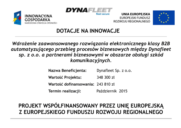 ! DOTACJE NA INNOWACJE Wdrożenie zaawansowanego rozwiązania elektronicznego klasy B2B automatyzującego przebieg procesów biznesowych między Dynafleet sp. z o.o. a partnerami biznesowymi w obszarze obsługi szkód komunikacyjnych. Nazwa Beneficjenta: Dynafleet Sp. z o.o. Wartość Projektu: 348 300 zł Wartość dofinansowania: 243 810 zł Termin realizacji: Październik 2015 PROJEKT WSPÓŁFINANSOWANY PRZEZ UNIĘ EUROPEJSKĄ Z EUROPEJSKIEGO FUNDUSZU ROZWOJU REGIONALNEGO