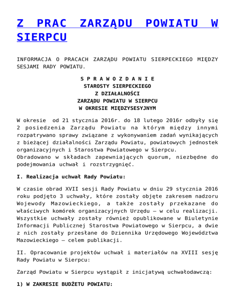 Z PRAC SIERPCU ZARZĄDU POWIATU W INFORMACJA O PRACACH ZARZĄDU POWIATU SIERPECKIEGO MIĘDZY SESJAMI RADY POWIATU. S P R A W O Z D A N I E STAROSTY SIERPECKIEGO Z DZIAŁALNOŚCI ZARZĄDU POWIATU W SIERPCU W OKRESIE MIĘDZYSESYJNYM W okresie od 21 stycznia 2016r. do 18 lutego 2016r odbyły się 2 posiedzenia Zarządu Powiatu na którym między innymi rozpatrywano sprawy związane z wykonywaniem zadań wynikających z bieżącej działalności Zarządu Powiatu, powiatowych jednostek organizacyjnych i Starostwa Powiatowego w Sierpcu. Obradowano w składach zapewniających quorum, niezbędne do podejmowania uchwał i rozstrzygnięć. I. Realizacja uchwał Rady Powiatu: W czasie obrad XVII sesji Rady Powiatu w dniu 29 stycznia 2016 roku podjęto 3 uchwały, które zostały objęte zakresem nadzoru Wojewody Mazowieckiego, a także zostały przekazane do właściwych komórek organizacyjnych Urzędu – w celu realizacji. Wszystkie uchwały zostały również opublikowane w Biuletynie Informacji Publicznej Starostwa Powiatowego w Sierpcu, a dwie z nich zostały przesłane do Dziennika Urzędowego Województwa Mazowieckiego – celem publikacji. II. Opracowanie projektów uchwał i materiałów na XVIII sesję Rady Powiatu w Sierpcu: Zarząd Powiatu w Sierpcu wystąpił z inicjatywą uchwałodawczą: 1) W ZAKRESIE BUDŻETU POWIATU: a) w sprawie zmian w uchwale w sprawie uchwalenia Budżetu Powiatu Sierpeckiego na 2016 rok: Kierując się dobrem Powiatu Sierpeckiego oraz potrzebą wykonywania ustawowych zadań przez organy powiatu zachodzi konieczność podjęcia przedmiotowej uchwały. 2) W ZAKRESIE POWIATOWEGO URZĘDU PRACY: a) w sprawie przyjęcia sprawozdania Powiatowego Urzędu Pracy w Sierpcu z wykonania Rocznego Programu Działania za II półrocze 2014 roku: Zgodnie z § 9a Uchwały Nr 274/LI/10 Rady Powiatu w Sierpcu z dnia 27 lipca 2010 roku w sprawie wprowadzenia zmian do Uchwały Nr 56/VII/07 Rady Powiatu w Sierpcu z dnia 28 czerwca 2007 roku w sprawie nadania Statutu Powiatowego Urzędu Pracy w Sierpcu – Powiatowy Urząd Pracy w Sierpcu składa Radzie Powiatu w Sierpcu sprawozdanie z wykonania rocznego programu działania za II półrocze w terminie do dnia 31 stycznia roku następnego. 3) W ZAKRESIE OŚWIATY I ZDROWIA: a) w sprawie uchwalenia ,,Programu opieki nad zabytkami Powiatu Sierpeckiego na lata 2016-2019”: Obowiązek sporządzenia powiatowego programu opieki nad zabytkami nakłada na powiat art. 87 Ustawy z dnia 23 lipca 2003 r. o ochronie zabytków i opiece nad zabytkami. Program ten uwzględnia charakterystykę i specyfikę powiatu jako jednostki samorządu terytorialnego oraz jako regionu stanowiącego spójność terytorialną i kulturalną. Ujęte w nim cele i zadania poprzez ich różnorodność i wielopłaszczyznowość pozwolą w sposób właściwy przeprowadzić działania służące poprawie stanu ochrony zabytków na terenie naszego powiatu. Realizacja tych zadań, przebiegać będzie we współpracy z wydziałami Starostwa Powiatowego w Sierpcu oraz z samorządami gminnymi z terenu Powiatu Sierpeckiego i nie przewiduje nakładów finansowych w budżecie powiatu na lata związane z jego realizacją. Powiatowy program opieki nad zabytkami przyjmuje Rada Powiatu, po uzyskaniu opinii Mazowieckiego Wojewódzkiego Konserwatora Zabytków i jest ogłaszany w Dzienniku Urzędowym Województwa Mazowieckiego. Projekt programu w dniu 9 października 2016 roku został przesłany do Mazowieckiego Wojewódzkiego Konserwatora Zabytków w celu zaopiniowania (wymagania ustawowe). Pozytywną opinię w przedmiotowej sprawie otrzymaliśmy w dniu 7 stycznia 2016 roku. Z realizacji programu Zarząd Powiatu sporządza co 2 lata sprawozdanie, które przedstawia Radzie Powiatu. Zgodnie z treścią Nr 224.48.2016 Zarządu Powiatu w Sierpcu z dnia 18 stycznia 2016 roku w sprawie przedłożenia do konsultacji projektu „Programu opieki nad zabytkami Powiatu Sierpeckiego na lata 2016-2019”, przeprowadzono proces konsultacji, z którego protokół przedkładamy Radzie Powiatu jako załącznik do niniejszego wniosku. Jak wynika z jego treści, w określonym terminie nie zgłoszono żadnych uwag do projektu „Programu opieki nad zabytkami Powiatu Sierpeckiego na lata 2016-2019”. b) w sprawie wprowadzenia wspólnej obsługi administracyjnej, finansowej i organizacyjnej jednostek organizacyjnych Powiatu sierpeckiego zaliczanych do sektora finansów publicznych: Z dniem 1 stycznia 2016 roku wchodzi weszła w życie zmiana ustawy z dnia 5 czerwca 1998 r. o samorządzie powiatowym, na mocy której powiat może zapewnić wspólną obsługę, w szczególności administracyjną, finansową i organizacyjną: jednostkom organizacyjnym powiatu zaliczanym do sektora finansów publicznych, powiatowym instytucjom kultury, innym zaliczanym do sektora finansów publicznych powiatowym osobom prawnym utworzonym na podstawie odrębnych ustaw w celu wykonywania zadań publicznych, z wyłączeniem przedsiębiorstw, instytutów badawczych, banków i spółek prawa handlowego. Wspólną obsługę mogą prowadzić starostwo powiatowe, inna jednostka organizacyjna powiatu, jednostka organizacyjna związku powiatów albo jednostka organizacyjna związku powiatowo-gminnego. Rada powiatu w odniesieniu do jednostek obsługiwanych, określa, w drodze uchwały, w szczególności: jednostki obsługujące, jednostki obsługiwane i zakres obowiązków powierzonych jednostkom obsługującym w ramach wspólnej obsługi. Organizacja wspólnej obsługi finansowej placówek oświatowych w Powiecie Sierpeckim powierzona była dotychczas Powiatowemu Zespołowi Jednostek Budżetowych w Sierpcu, jednostce powołanej do tego celu w 1999 roku. Niespójność przepisów prawa (ustawy o samorządzie powiatowym, ustawy o finansach publicznych i ustawy o rachunkowości) powodowała niejednoznaczność w prowadzeniu tych zadań oraz ponoszeniu za nie odpowiedzialności. Przedmiotowa uchwała dostosowuje funkcjonujące w Powiecie rozwi