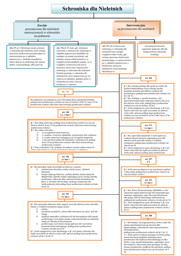 Schroniska dla Nieletnich Interwencyjne są przeznaczone dla nieletnich Zwykle przeznaczone dla nieletnich umieszczonych w schronisku na podstawie Art. 27. § 1. Nieletniego można umieścić w schronisku dla nieletnich, jeżeli zostaną ujawnione okoliczności przemawiające za umieszczeniem go w zakładzie poprawczym, a zachodzi uzasadniona obawa ukrycia się nieletniego lub zatarcia śladów czynu karalnego, albo jeżeli nie można ustalić tożsamości nieletniego Art. 74 § 2. W razie, gdy wykonanie orzeczenia o umieszczeniu nieletniego w zakładzie poprawczym natrafiłoby na niedające się usunąć przeszkody, sąd rodzinny stosuje nadzór kuratora, a w wyjątkowych przypadkach uznając, że ze względów wychowawczych jest to konieczne, może orzec umieszczenie nieletniego w schronisku dla nieletnich. Nieletni pozostaje w schronisku dla nieletnich do czasu umieszczenia go we właściwym zakładzie, jednakże pobyt w schronisku nie może wówczas przekroczyć 3 miesięcy art. 134 Kto dopuszcza się zamachu na życie Prezydenta Rzeczypospolitej Polskiej, podlega karze pozbawienia wolności na czas nie krótszy od lat 12, karze 25 lat pozbawienia wolności albo karze dożywotniego pozbawienia wolności art. 148 § 1, 2 lub 3 § 1. Kto zabija człowieka, podlega karze pozbawienia wolności na czas nie krótszy od lat 8, karze 25 lat pozbawienia wolności albo karze dożywotniego pozbawienia wolności. § 2. Kto zabija człowieka: 1) ze szczególnym okrucieństwem, 2) w związku z wzięciem zakładnika, zgwałceniem albo rozbojem, 3) w wyniku motywacji zasługującej na szczególne potępienie, 4) z użyciem broni palnej lub materiałów wybuchowych, podlega karze 25 lat pozbawienia wolności albo karze dożywotniego pozbawienia wolności. § 3. Karze określonej w § 2 podlega, kto jednym czynem zabija więcej niż jedną osobę lub był wcześniej prawomocnie skazany za zabójstwo. art. 156 § 1 lub 3 § 1. Kto powoduje ciężki uszczerbek na zdrowiu w postaci: 2) pozbawienia człowieka wzroku, słuchu mowy, zdolności płodzenia, 3) innego ciężkiego kalectwa, ciężkiej choroby nieuleczalnej lub długotrwałej, choroby realnie zagrażającej życiu, trwałej choroby psychicznej, całkowitej albo znacznej trwałej niezdolności do pracy w zawodzie lub trwałego, istotnego zeszpecenia lub zniekształcenia ciała podlega karze pozbawienia wolności od roku do lat 10. § 3. Jeżeli następstwem czynu określonego w § 1 jest śmierć człowieka, sprawca podlega karze pozbawienia wolności od lat 2 do lat 12. art. 163 § 1 lub 3 § 1. Kto sprowadza zdarzenie, które zagraża życiu lub zdrowiu wielu osób albo mieniu w wielkich rozmiarach mające postać: 1) pożaru, 2) zawalenia się budowli, zalewu albo obsunięciu się ziemi, skał lub śniegu 3) eksplozji materiałów wybuchowych lub łatwopalnych albo innego gwałtownego wyzwolenia energii, rozprzestrzeniania się substancji trujących, duszących lub parzących, 1) gwałtownego wyzwolenia energii jądrowej lub wyzwolenia promieniowania jonizującego, podlega karze pozbawienia wolności od roku do lat 10. § 3. Jeżeli następstwem czynu określonego w § 1 jest śmierć człowieka lub ciężki uszczerbek na zdrowiu wielu osób, sprawca podlega karze pozbawienia wolności od lat 2 do lat 12. Art. 27. § 2. Umieszczenie nieletniego w schronisku dla nieletnich może nastąpić wyjątkowo także wtedy, gdy zostaną ujawnione okoliczności przemawiające za umieszczeniem go w zakładzie poprawczym, a nieletniemu zarzucono popełnienie czynu karalnego określonego w: stwarzających poważne zagrożenie społeczne albo dla bezpieczeństwa schroniska zwykłego art. 166 § 1. Kto, stosując podstęp albo gwałt na osobie lub groźbę bezpośredniego użycia takiego gwałtu, przejmuje kontrolę nad statkiem wodnym lub powietrznym, podlega karze pozbawienia wolności od lat 2 do 12. § 2. Kto, działając w sposób określony w § 1, sprowadza bezpośrednie niebezpieczeństwo dla życia lub zdrowia wielu osób, podlega karze pozbawienia wolności na czas nie krótszy od lat 3. § 3. Jeżeli następstwem czynu określonego w § 2 jest śmierć człowieka lub ciężki uszczerbek na zdrowiu wielu osób, sprawca podlega karze pozbawienia wolności na czas nie krótszy od lat 5 albo karze 25 lat pozbawienia wolności. art. 173 § 1 lub 3 § 1. Kto, sprowadza katastrofę w ruchu lądowym, wodnym lub powietrznym zagrażającą życiu lub zdrowiu wielu osób albo mieniu w wielkich rozmiarach, podlega karze pozbawienia wolności od roku do lat 10. § 3. Jeżeli następstwem czynu określonego w § 1 jest śmierć człowieka lub ciężki uszczerbek na zdrowiu wielu osób, sprawca podlega karze pozbawienia wolności od lat 2 do 12. art. 197 §3 § 3. Jeżeli sprawca dopuszcza się zgwałcenia wspólnie z inną osobą, podlega karze pozbawienia wolności na czas nie krótszy od lat 3. art. 252 § 1 lub 2 § 1. Kto, bierze lub przetrzymuje zakładnika w celu zmuszenia organu państwowego lub samorządowego, instytucji, organizacji, osoby fizycznej lub prawnej albo grupy osób do określonego zachowania się, podlega karze pozbawienia wolności od roku do lat 10. § 2. Jeżeli następstwem czynu określonego w § 1 jest śmierć człowieka lub ciężki uszczerbek na zdrowiu, sprawca podlega karze pozbawienia wolności od lat 2 do 12. art. 280 § 1. Kto kradnie, używając przemocy wobec osoby lub grożąc natychmiastowym jej użyciem albo doprowadzając człowieka do stanu nieprzytomności lub bezbronności, podlega karze pozbawienia wolności od lat 2 do 12. § 2. Jeżeli sprawca rozboju posługuje się bronią palną, nożem lub innym podobnie niebezpiecznym przedmiotem lub środkiem obezwładniającym albo działa w inny sposób bezpośrednio zagrażający życiu lub wspólnie z inną osobą, która posługuje się taką bronią, przedmiotem, środkiem lub sposobem, podlega karze pozbawienia wolności na czas nie krótszy od 3. lat.