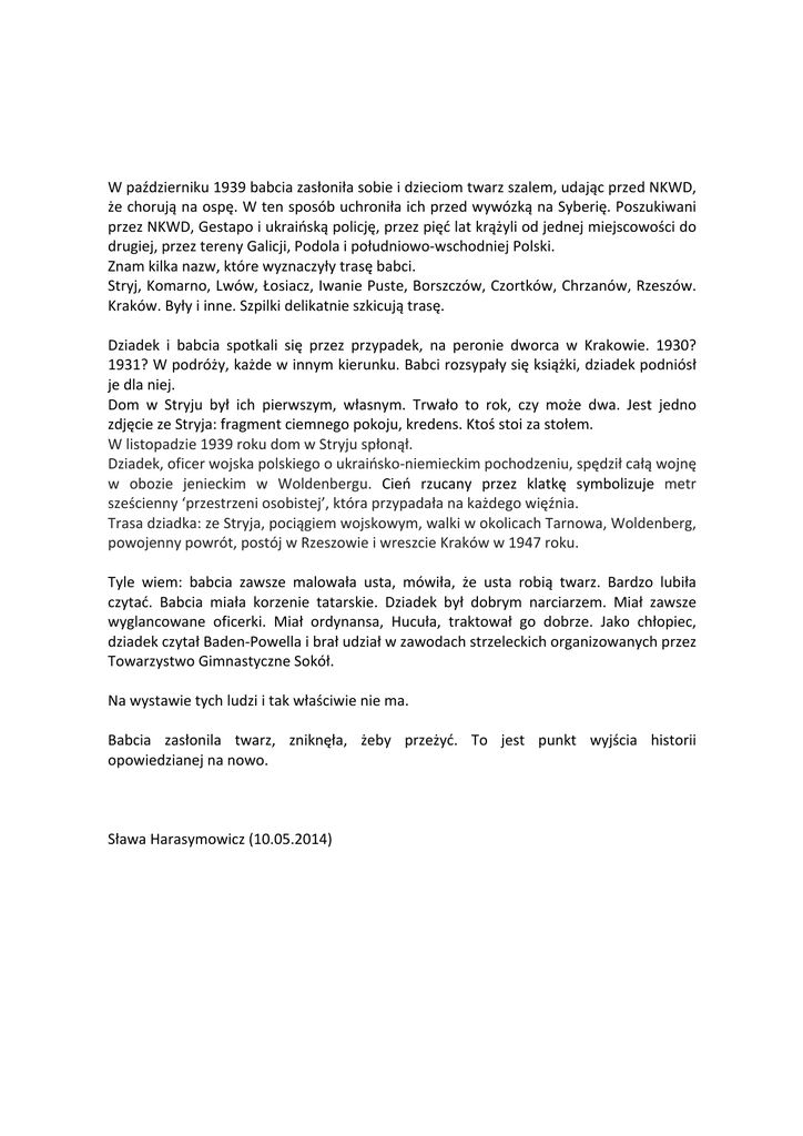 W październiku 1939 babcia zasłoniła sobie i dzieciom twarz szalem, udając przed NKWD, że chorują na ospę. W ten sposób uchroniła ich przed wywózką na Syberię. Poszukiwani przez NKWD, Gestapo i ukraińską policję, przez pięć lat krążyli od jednej miejscowości do drugiej, przez tereny Galicji, Podola i południowo-‐wschodniej Polski. Znam kilka nazw, które wyznaczyły trasę babci. Stryj, Komarno, Lwów, Łosiacz, Iwanie Puste, Borszczów, Czortków, Chrzanów, Rzeszów. Kraków. Były i inne. Szpilki delikatnie szkicują trasę. Dziadek i babcia spotkali się przez przypadek, na peronie dworca w Krakowie. 1930? 1931? W podróży, każde w innym kierunku. Babci rozsypały się książki, dziadek podniósł je dla niej. Dom w Stryju był ich pierwszym, własnym. Trwało to rok, czy może dwa. Jest jedno zdjęcie ze Stryja: fragment ciemnego pokoju, kredens. Ktoś stoi za stołem. W listopadzie 1939 roku dom w Stryju spłonął. Dziadek, oficer wojska polskiego o ukraińsko-‐niemieckim pochodzeniu, spędził całą wojnę w obozie jenieckim w Woldenbergu. Cień rzucany przez klatkę symbolizuje metr sześcienny ‘przestrzeni osobistej’, która przypadała na każdego więźnia. Trasa dziadka: ze Stryja, pociągiem wojskowym, walki w okolicach Tarnowa, Woldenberg, powojenny powrót, postój w Rzeszowie i wreszcie Kraków w 1947 roku. Tyle wiem: babcia zawsze malowała usta, mówiła, że usta robią twarz. Bardzo lubiła czytać. Babcia miała korzenie tatarskie. Dziadek był dobrym narciarzem. Miał zawsze wyglancowane oficerki. Miał ordynansa, Hucuła, traktował go dobrze. Jako chłopiec, dziadek czytał Baden-‐Powella i brał udział w zawodach strzeleckich organizowanych przez Towarzystwo Gimnastyczne Sokół. Na wystawie tych ludzi i tak właściwie nie ma. Babcia zasłonila twarz, zniknęła, żeby przeżyć. To jest punkt wyjścia historii opowiedzianej na nowo. Sława Harasymowicz (10.05.2014)