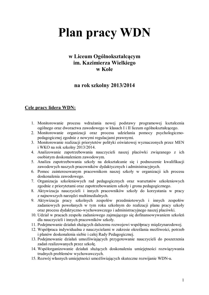 Plan pracy WDN - Liceum Ogólnokształcące w Kole
