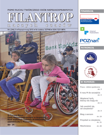 PISMO RUCHU TWÓRCZEGO OSÓB NIEPEŁNOSPRAWNYCH FINANSUJĄ Nr (246) 5 Poznań maj 2015 Nr indeksu 327948 ISSN 1231-8876 PATRONUJĄ W NUMERZE: Praca – dobro społeczne str. 3 6 razy M do szczęścia FOT. KAROLINA KASPRZAK str. 5 II Turniej Bocci Osób Niepełnosprawnych w Rogoźnie. Rzut wykonuje Gabriela Brzostowska, zawodniczka z Poznania. Str. 25 Wspierać tych, którzy nie mają nic str. 6 Jak uwolnić się od cierpienia? str. 8 Bieg z sercem str. 19 Przystań w cierpieniu str. 31 Niechciana str. 40 STRONA Seniorzy w Bramie Poznania T o miejsce jest coraz liczniej odwiedzane przez seniorów. Z myślą o nich przygotowano tu w maju wiele atrakcji, by w Bramie Poznania ICHOT miło i pożytecznie mogli spędzić czas. Podczas pierwszego majowego weekendu była tu „Wielka Majówka”: warsztaty, wycieczki, spotkania. Uczestnicy wzięli udział we wspólnym świętowaniu pierwszych urodzin Bramy Poznania. Jednym ze stałych punktów programu jest zwiedzanie przez seniorów ekspozycji ilustrującej dziedzictwo i historię Ostrowa Tumskiego. Zwiedzającym towarzyszy przewodnik. Pierwsze zwiedzanie odbyło się 6 maja, drugie będzie 20 maja. Dziadkowie z wnukami mogą przyjść 23 maja na spotkanie, na którym starsi opowiedzą młodym historie ze swojego życia. W majowe weekendy organizatorzy zapraszają na bezpłatne wycieczki pod hasłem „Dzieło pod lupą”, czyli poznawanie zabytków, zakątków i szczegółów Ostrowa Tumskiego. awa „Cafe” dla każdego „C afe Misja” – kawiarnia obok poznańskiej Fary, to miejsce spotkań osób w każdym wieku. Przy czym na ulotkach i folderach personel zaznacza, że jest to kawiarenka przyjazna seniorom. „Cafe Misję” stworzyła grupa młodych osób pełnych zapału i energii, którzy chcieliby nieść ludziom radość, serdeczność, dobro. Czerpali wzorce i tradycyjne wartości z dawnego kolegium jezuickiego. Seniorzy zawsze znajdą tu dla siebie coś ciekawego: prelekcje, promocje książek, kameralne koncerty, dyskusje na różne tematy, pokazy slajdów. Nic więc dziwnego, że ludzie starsi polubili to miejsce. „Cafe Misja” to również ulubiona kawiarnia władz miejskich, których przedstawiciele często spotykają się tu z mieszkańcami, aby omówić ważne koncepcje i programy oraz przeprowadzić konsultacje. awa MAJ 2015 JUBILEUSZ CARITAS ARCHIDIECEZJI POZNAŃSKIEJ 25 lat w służbie potrzebującym Karolina K Kasprzak K PPOZNAŃ J adłodajnie, paczki żywnościowe, parafialne i szkolne koła samopomocowe, ośrodek dla dzieci i młodzieży z problemem uzależnienia – to zaledwie zalążek inicjatyw Caritas Archidiecezji Poznańskiej, która w tym roku obchodzi ćwierćwiecze działalności. Gdy działalność się zaczynała, organizacji brakowało siedziby. Okazją do przybliżenia historii Caritas była jubileuszowa gala 11 kwietnia w poznańskiej Auli „Nova”. Spotkali się na niej założyciele, wolontariusze oraz reprezentanci władz samorządowych, a wśród nich m.in.: posłowie na Sejm RP – Bożena Szydłowska i Stanisław Kalemba, Stanisław Gądecki, arcybiskup Metropolita Poznański, Piotr Florek, wojewoda wielkopolski, Agnieszka Pachciarz, wiceprezydent Miasta Poznania, Zygmunt Jeżewski, członek Zarządu Powiatu Poznańskiego, Łukasz Borowiak, prezydent Leszna. – Caritas Archidiecezji Poznańskiej przez 25 lat, czyli od 12 marca 1990 roku, dokonała pewnego rodzaju specjalizacji. Prowadzi działalność interwencyjną oraz szeroko pojętą działalność dobroczynną na rzecz ubogich, bezdomnych i niepełnosprawnych – świetlice, domy samotnej matki, bar Caritas, z którego dochód przeznaczany jest na pomoc ubogim. W naszej diecezji mamy ponad 300 parafialnych zespołów Caritas – informował ksiądz dyrektor Waldemar Hanas. – W wymienione działania wpisuje się pomoc socjalna, żywnościowa, materialna. Stoi za tym wiele akcji, m.in. akcja „Przekaż ciepło” mająca na celu zaopatrzenie w opał na zimę, program stypendialny „Skrzydła” czy wieczerza wigilijna na Międzynarodowych Targach Poznańskich, na której co roku gromadzi się 1800 osób. Wobec Ksiądz dyrektor Waldemar Hanas odbiera Srebrną Pieczęć Miasta Poznania. Dyplom wyróżniający odbierają przedstawiciele Duszpasterstwa Akademickiego oo. Dominikanów – Łukasz Kryszak, Sylwia Modlisz i Marta Kunke. ludzkich dramatów często jesteśmy bezradni. Możemy tylko przyjąć człowieka pod dach, wysłuchać, zwyczajnie być z nim. Przybliżono specyfikę działalności wybranych placówek Caritas, w tym Ośrodka w Wierzenicy w powiecie poznańskim, gdzie leczone są dzieci i młodzież uzależniona od narkotyków i innych szkodliwych substancji. Zygmunt Jeżewski swoje wystąpienie zaczął od słów Janusza Leona Wiśniewskiego, który napisał, że „nawet jeśli pociechę daje niebo, to pomoc zależy od ludzi”. Zwrócił uwagę na różnorodność inicjatyw Caritas, które uświadamiają społeczeństwo, jak wielu ludzi ich potrzebuje. Agnieszka Pachciarz na ręce księdza dyrektora Waldemara Hanasa przekazała Srebrną Pieczęć Miasta Poznania. Medale „Optime Merito Archidioecesis Posnaniensis” otrzymały: Dorota Niedrich, Ewa Pacesz, s. Małgorzata Laskowska, s. Faustyna Hipnarowicz i Anna Górska. 8 osób wyróżniono dyplomami, wśród nich prof. dr hab. Macieja Kubickiego, wieloletniego wolontariusza świetlicy socjoterapeutycznej Caritas. W drugiej części gali zaśpiewała Antonina Krzysztoń. Uroczystość przyniosła istotną refleksję: żadne państwo nie poradzi sobie dostatecznie z ubóstwem, zatem pomoc instytucji takich jak Caritas jest nieoceniona. W dobie projektów i programów skupiających się na poszerzaniu wiedzy warto pamiętać, że nie będzie miała ona żadnej wartości, jeśli nie wykorzystamy jej w praktyce, w konkretnym działaniu, które odmieni los drugiego człowieka. Z wyrazami uznania i różami. FOT. (3X) KAROLINA KASPRZAK 2 STRONA MAJ 2015 – A wymóg zwrotu dof