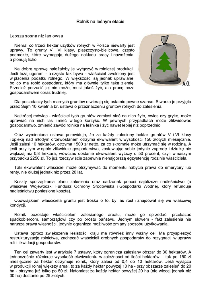 Rolnik na leśnym etacie Lepsza sosna niż łan owsa Niemal co trzeci hektar użytków rolnych w Polsce niewarty jest uprawy. To grunty V i VI klasy, piaszczystobielicowe, często podmokłe, które wymagają dużego nakładu pracy i nawożenia, a plonują licho. Na dobrą sprawę należałoby je wyłączyć w rolniczej produkcji. Jeśli leżą ugorem a często tak bywa właściciel zwolniony jest w płacenia podatku rolnego. W większości są jednak uprawiane, bo co ma robić gospodarz, który ma głównie tylko taką ziemię. Przecież porzucić jej nie może, musi jakoś żyć, a o pracę poza gospodarstwem coraz trudniej. Dla posiadaczy tych marnych gruntów otwierają się ostatnio pewne szanse. Stwarza je przyjęta przez Sejm 10 kwietnia br. ustawa o przeznaczeniu gruntów rolnych do zalesienia. Najkrócej mówiąc właściciel tych gruntów zamiast siać na nich żyto, owies czy grykę, może uprawiać na nich las i mieć w tego korzyść. W pewnych przypadkach może zlikwidować gospodarstwo, zmienić zawód rolnika na leśnika i żyć nawet lepiej niż poprzednio. Otóż wymieniona ustawa przewiduje, że za każdy zalesiony hektar gruntów V i VI klasy i opiekę nad młodym drzewostanem otrzyma ekwiwalent w wysokości 150 złotych miesięcznie. Jeśli zalesi 10 hektarów, otrzyma 1500 zł netto, za co skromnie może utrzymać się w rodziną. A jeśli przy tym w ogóle zlikwiduje gospodarstwo, zostawiając sobie jedynie zagrodę i działkę nie większą niż 0,8 hektara, wówczas dostanie ekwiwalent wyższy o 50 procent, czyli w naszym przypadku 2250 zł. To już rzeczywiście zapewnia nienajgorszą egzystencję rodzinie właściciela. Taki ekwiwalent właściciel może otrzymywać do momentu nabycia prawa do emerytury lub renty, nie dłużej jednak niż przez 20 lat. Koszty sporządzenia planu zalesienia oraz sadzonek ponosi najbliższe nadleśnictwo (a właściwie Wojewódzki Fundusz Ochrony Środowiska i Gospodarki Wodnej, który refunduje nadleśnictwu poniesione koszta). Obowiązkiem właściciela gruntu jest troska o to, by las rósł i znajdował się we właściwej kondycji. Rolnik pozostaje właścicielem zalesionego areału, może go sprzedać, przekazać spadkobiercom, samorządowi czy po prostu państwu. Jednym słowem fakt zalesienia nie narusza prawa własności, jedynie ogranicza możliwość zmiany sposobu użytkowania. Ustawa oprócz zwiększenia lesistości kraju ma również inny ważny cel. Ma przyspieszyć restrukturyzację rolnictwa, zachęcać właścicieli drobnych gospodarstw do rezygnacji w uprawy roli i likwidacji gospodarstw. Ten cel zawarty jest w artykule 7 ustawy, który ogranicza zalesiany obszar do 30 hektarów. A jednocześnie różnicuje wysokość ekwiwalentu w zależności od ilości hektarów. I tak po 150 zł miesięcznie za hektar otrzymuje rolnik, który zalesi od 0,4 do 10 hektarów. Jeśli wyłącza w produkcji rolnej większy areał, to za każdy hektar powyżej 10 ha przy obszarze zalesień do 20 ha otrzyma już tylko po 50 zł. Natomiast za każdy hektar powyżej 20 ha (nie więcej jednak niż 30 ha) dostanie po 25 złotych. Widać w tych rozwiązań wyraźnie, że zachęta dotyczy drobnych rolników, tylko posiadaczom areału nie większego niż 10 hektarów gruntów V i VI klasy cała operacja może się opłacić. Ekwiwalent w wysokości 150 zł miesięcznie za hektar lichej ziemi, to w skali rocznej 1800 złotych. I to na czysto. Tyle nie wyciągnie rolnik nawet przy starannej uprawie. Hektar bielicówki zasiany żytem czy owsem nie wyda więcej jak 2025 kwintali ziarna. Ze sprzedaży takiego plonu można uzyskać co najwyżej 1200 zł. A ile kosztuje ziarno, nawóz, orka, zbiór? Tak więc dla rolnika dobrze pielęgnowana sosna jest bardziej opłacalna niż żyto czy owies. Istnieją nawet obawy, że jest to ekwiwalent zbyt wysoki i zbyt wielu rolników przerzuci się na uprawę lasu. Wydaje się jednak, że w praktyce nie grozi nam za ileś lat pokrycie kraju przepastnymi borami. Po pierwsze dlatego, że te preferencje dotyczą małych gospodarstw. Po drugie rzadko się zdarza, aby rolnik miał wyłącznie piaski, grunty podmokłe i górzyste. Przeważnie ma różne kawałki w różnych miejscach. Pod leśne uprawy będzie więc mógł przeznaczyć tylko grunty najgorsze, a otrzymany za to ekwiwalent nie uszczupli, a nawet poprawi jego dotychczasowe przychody. Zyskają nie tylko rolnicy Podczas dwóch lat debat w Sejmie nad tą ustawą zgłaszano wątpliwości, czy stać nas na tę ustawę i czy Lasy Państwowe będą w stanie wyprodukować tak wielką ilość sadzonek drzew. Obawy zasadne. Zwłaszcza, że pierwotny projekt zgłoszony przez posłów PSL nie przewidywał żadnych ograniczeń ani nie był poparty dokładnymi wyliczeniami skutków finansowych dla budżetu państwa. Projekt ludowców przewidywał m.in., że rolnik, który zalesi co najmniej 4 hektary, staje się automatycznie etatowym pracownikiem Lasów Państwowych. Zakładano, że rocznie zalesiano by ok. 50 tys. ha, a cały proces trwałby 10 lat. Finansowanie całej operacji opierano na funduszach restrukturyzacyjnych w Unii Europejskiej. Po prawie dwuletnich pracach w Sejmie i aktywnym włączeniu się w te prace rządu uchwalona ustawa jest może skromniejsza, ale bardziej realna i bezpieczna dla budżetu państwa. Główny bezpiecznik polega na tym, że skala zalesień w danym roku zależy zarówno od możliwości budżetu, jak i Lasów Państwowych. Zgodę wydaje starosta w ramach przyznanego limitu. Jeśli ten limit zostanie wyczerpany w danym roku, wnioski przesuwane są na rok następny. Uzależniono również wypłatę ekwiwalentu od stanu i kondycji założonych upraw leśnych. Kontroli i oceny dokonywać będą nadleśniczowie po raz pierwszy po dwóch latach od zalesienia, następnych co trzy lata. Wypłaty ekwiwalentu realizowane będą przez Agencję Restrukturyzacji i Modernizacji Rolnictwa. Oczywiście, tempo zalesień będzie większe, jeśli 