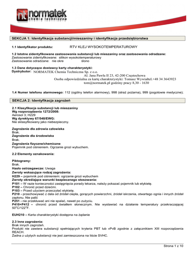 SEKCJA 1: Identyfikacja substancji/mieszaniny i identyfikacja przedsiębiorstwa RTV KLEJ WYSOKOTEMPERATUROWY 1.1 Identyfikator produktu: 1.2 Istotne zidentyfikowane zastosowania substancji lub mieszaniny oraz zastosowania odradzane: Zastosowanie zidentyfikowane: silikon wysokotemperaturowy Zastosowanie odradzane: nie okre ślono 1.3 Dane dotyczące dostawcy karty charakterystyki: Dystrybutor: NORMATEK Chemia Techniczna Sp. z o.o. Al. Jana Pawła II 23, 42-200 Częstochowa Osoba odpowiedzialna za kartę charakterystyki: Tomasz Wywiałtel.+48 34 3643923 [email protected] godziny pracy 8,30 - 1630 1.4 Numer telefonu alarmowego: 112 (ogólny telefon alarmowy), 998 (straż pożarna), 999 (pogotowie medyczne); SEKCJA 2: Identyfikacja zagrożeń 2.1 Klasyfikacja substancji lub mieszaniny Wg rozporządzenia 1272/2008: Aerosol 3; H229 Wg dyrektywy 67/548/EWG: Nie sklasyfikowany jako niebezpieczny. Zagrożenie dla zdrowia człowieka Brak. Zagrożenie dla środowiska Brak. Zagrożenia fizyczne/chemiczne Pojemnik pod ciśnieniem. Ogrzanie grozi wybuchem. 2.2 Elementy oznakowania: Piktogramy: Brak. Hasło ostrzegawcze: Uwaga Zwroty wskazujące rodzaj zagrożenia: H229 – pojemnik pod ciśnieniem: ogrzanie grozi wybuchem Zwroty określające warunki bezpiecznego stosowania: P101 – W razie konieczności zasięgnięcia porady lekarza, należy pokazać pojemnik lub etykietę. P102 – Chronić przed dziećmi. P103 – Przed użyciem przeczytać etykietę. P210 - przechowywać z dala od źródeł ciepła, gorących powierzchni, źródeł iskrzenia, otwartego ognia i innych źródeł zapłonu. Nie palić P251 - nie przekłuwać ani nie spalać, nawet po zużyciu. P410+P412 – chronić przed światłem słonecznym. Nie wystawiać na działanie temperatury przekraczającej o o 50 C/122 F. EUH210 – Karta charakterystyki dostępna na żądanie 2.3 Inne zagrożenia: Brak innych zagrożeń. Produkt nie zawiera substancji spełniających kryteria PBT lub vPvB zgodnie z załącznikiem XIII rozporządzenia REACH. Żadna z użytych substancji nie jest zamieszczona na liście SVHC. Strona 1 z 10 KARTA CHARAKTERYSTYKI Data wydania 16.08.2012 Data aktualizacji: 29.01.2015 Wersja PL: 2.0 Karta Charakterystyki jest zgodna z Rozporządzeniem WE 1907/2006 z 18.12.2006 – REACH oraz 453/2010 z 20.05.2010r. SEKCJA 3: Skład/informacja o składnikach 3.1 Substancja: Nie dotyczy. 3.2 Mieszanina: Niebezpieczne składniki: Identyfikator produktu Propylotriacetoksysilan CAS: 17865-07-5 WE: 214-816-9 Nr indeksowy : Nr REACH: 01-2119966899-07XXXX Zawartość % Klasyfikacja wg 67/548/EWG 1 - <5 Metylotriacetoksysilan CAS: 4253-34-3 WE: 224-221-9 Nr indeksowy : Nr REACH: 01-2119962266-32XXXX 1 – <2,5 1,1,1,2-tetrafluoroetan CAS 811-97-2 WE: 212-377-0 Nr indeksowy: Nr REACH: 01-2119459374-33XXXX 1 - <2,5 C: R34 Klasyfikacja CLP Kody zwrotów Klasa zagrożenia i wskazujących kody kategorii rodzaj zagrożenia Skin Corr. 1B H314 R14 Xn: R22 C: R34 - Acute Tox. 4 H302 H314 Skin Corr. 1B Press. Gas. H280 Pełna treść zwrotów R i H w sekcji 16 SEKCJA 4: Środki pierwszej pomocy 4.1 Opis środków pierwszej pomocy Uwagi ogólne Zdjąć zanieczyszczona odzież. W przypadku kontaktu ze skórą: Umyć zabrudzoną skórę wodą z mydłem, spłukać dokładnie wodą, w przypadku pojawienia się podrażnienia, rumieni skontaktować się z lekarzem. W przypadku kontaktu z oczami: Przepłukać oczy przez kilkanaście minut (ok. 15) dużą ilością wody, trzymając powieki szeroko rozwarte. Unikać silnego strumienia, ze względu na niebezpieczeństwo uszkodzenia rogówki, skontaktować się z lekarzem. Narażenie inhalacyjne: W razie zawrotów głowy lub nudności wyprowadzić poszkodowanego na świeże powietrze, w razie braku szybkiej poprawy zasięgnąć porady lekarza. W przypadku połknięcia: Nie wywoływać wymiotów, wyplukać usta woda i podać do wypicia dużą ilość wody, natychmiast skontaktować się z lekarzem. 4.2 Najważniejsze ostre i opóźnione objawy oraz skutki narażenia: Brak informacji. Strona 2 z 10 KARTA CHARAKTERYSTYKI Data wydania 16.08.2012 Data aktualizacji: 29.01.2015 Wersja PL: 2.0 Karta Charakterystyki jest zgodna z Rozporządzeniem WE 1907/2006 z 18.12.2006 – REACH oraz 453/2010 z 20.05.2010r. 4.3 Wskazania dotyczące wszelkiej natychmiastowej pomocy lekarskiej i szczególnego postępowania z poszkodowanym: Decyzję o sposobie postępowania podejmuje lekarz po ocenie stanu poszkodowanego. SEKCJA 5: Postępowanie w przypadku pożaru 5.1 Środki gaśnicze: Odpowiednie środki gaśnicze: piana alkoholoodporna lub suche proszki gaśnicze (A, B, C), dwutlenek węgla (gaśnica śniegowa), piasek lub ziemia, mgła wodna. Stosować metody gaśnicze odpowiednie do warunków otoczenia. Niewłaściwe środki gaśnicze: Silny strumień wody. 5.2 Szczególne zagrożenia związane z substancją lub mieszaniną: W trakcie pożaru, pod wpływem działania wysokich temperatur uwalniają się toksyczne produkty rozkładu zawierające min. tlenki węgla, tlenki azotu. 5.3 Informacje dla straży pożarnej: Pojemniki znajdujące się w strefie pożaru chłodzić rozproszonym strumieniem wody, o ile jest to możliwe usunąć ze strefy zagrożenia. W przypadku pożaru w zamkniętym pomieszczeniu należy stosować odzież ochronną i aparat oddechowy na sprężone powietrze. Nie dopuszczać do przedostania się wody gaśniczej do wód powierzchniowych, gruntowych i kanalizacji. SEKCJA 6: Postępowanie w przypadku niezamierzonego uwolnienia do środowiska 6.1 Indywidualne środki ostrożności, wyposażenie ochronne i procedury w sytuacjach awaryjnych Dla osób nienależących do personelu udzielającego pomocy: zawiadomić o awarii odpowiednie służby. Usunąć z obszaru zagrożenia osoby niebiorące udziału w likwidacji awarii. Dla osób udzielających pomocy: Zadbać o odpowiednią wentylację. 6.2 Środki ostrożności w zakresie ochrony środowiska: Zapobiegać rozprzestrzenianiu się oraz przedostaniu do kanalizacj