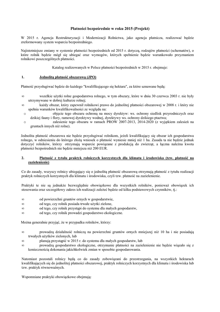 Płatności bezpośrednie w roku 2015 (Projekt) W 2015 r. Agencja Restrukturyzacji i Modernizacji Rolnictwa, jako agencja płatnicza, realizować będzie zreformowany system wsparcia bezpośredniego. Najistotniejsze zmiany w systemie płatności bezpośrednich od 2015 r. dotyczą, rodzajów płatności (schematów), o które rolnik będzie mógł się ubiegać oraz wymogów, których spełnienie będzie warunkowało przyznaniem rolnikowi poszczególnych płatności. Katalog realizowanych w Polsce płatności bezpośrednich w 2015 r. obejmuje: 1. Jednolitą płatność obszarową (JPO) Płatność przysługiwać będzie do każdego "kwalifikującego się hektara", za które uznawane będą: • wszelkie użytki rolne gospodarstwa rolnego, w tym obszary, które w dniu 30 czerwca 2003 r. nie były utrzymywane w dobrej kulturze rolnej; • każdy obszar, który zapewnił rolnikowi prawo do jednolitej płatności obszarowej w 2008 r. i który nie spełnia warunków kwalifikowalności ze względu na: o objęcie tego obszaru ochroną na mocy dyrektyw: ws. ochrony siedlisk przyrodniczych oraz dzikiej fauny i flory, ramowej dyrektywy wodnej, dyrektywy ws. ochrony dzikiego ptactwa; o zalesienie tego obszaru w ramach PROW 2007-2013, 2014-2020 (z wyjątkiem zalesień na gruntach innych niż rolne). Jednolita płatność obszarowa nie będzie przysługiwać rolnikom, jeżeli kwalifikujący się obszar ich gospodarstwa rolnego, w odniesieniu do którego złożą wniosek o płatność wyniesie mniej niż 1 ha. Zasada ta nie będzie jednak dotyczyć rolników, którzy otrzymają wsparcie powiązane z produkcją do zwierząt, a łączna należna kwota płatności bezpośrednich nie będzie mniejsza niż 200 EUR. 2. Płatność z tytułu praktyk rolniczych korzystnych dla klimatu i środowiska (tzw. płatność na zazielenienie) Co do zasady, wszyscy rolnicy ubiegający się o jednolitą płatność obszarową otrzymają płatność z tytułu realizacji praktyk rolniczych korzystnych dla klimatu i środowiska, czyli tzw. płatność na zazielenienie. Praktyki te nie są jednakże bezwzględnie obowiązkowe dla wszystkich rolników, ponieważ obowiązek ich stosowania oraz szczegółowy zakres ich realizacji zależeć będzie od kilku podstawowych czynników, tj.: • • • • od powierzchni gruntów ornych w gospodarstwie, od tego, czy rolnik posiada trwałe użytki zielone, od tego, czy rolnik przystąpi do systemu dla małych gospodarstw, od tego, czy rolnik prowadzi gospodarstwo ekologiczne. Można generalnie przyjąć, że w przypadku rolników, którzy: • • • prowadzą działalność rolniczą na powierzchni gruntów ornych mniejszej niż 10 ha i nie posiadają trwałych użytków zielonych, lub planują przystąpić w 2015 r. do systemu dla małych gospodarstw, lub prowadzą gospodarstwo ekologiczne, otrzymanie płatności na zazielenienie nie będzie wiązało się z koniecznością dokonania jakichkolwiek zmian w sposobie gospodarowania. Natomiast pozostali rolnicy będą co do zasady zobowiązani do przestrzegania, na wszystkich hektarach kwalifikujących się do jednolitej płatności obszarowej, praktyk rolniczych korzystnych dla klimatu i środowiska lub tzw. praktyk równoważnych. Wspomniane praktyki obowiązkowe obejmują: • • • dywersyfikację upraw utrzymanie trwałych użytków zielonych (TUZ) utrzymanie obszarów proekologicznych (EFA). 3. Płatność dla młodych rolników Płatność przysługiwać będzie rolnikowi aktywnemu zawodowo, uprawnionemu do jednolitej płatności obszarowej, który: • Jest osobą fizyczną, która po raz pierwszy zakłada gospodarstwo rolne jako kierująca gospodarstwem rolnym, lub która założyła już takie gospodarstwo rolne w ciągu 5 lat przed pierwszym złożeniem wniosku w ramach systemu jednolitej płatności obszarowej oraz której wiek w roku składania wniosku nie przekracza 40 lat (tj. nie ukończyła 41 roku życia w roku składania wniosku); • Jest osobą prawną, pod warunkiem, że przynajmniej jedna osoba fizyczna spełniająca kryteria młodego rolnika (co do wieku i rozpoczęcia działalności) sprawuje efektywną i długoterminową kontrolę (ponosi ryzyko finansowe, pobiera korzyści, zarządza) nad osobą prawną (samodzielnie lub z innymi osobami). Płatność przyznawana będzie na okres maksymalnie pięciu lat, przy czym okres ten skracany będzie o liczbę lat, które upłynęły między rozpoczęciem działalności przez młodego rolnika, a pierwszym złożeniem wniosku o płatność dla młodych rolników. Płatność przysługuje do maksymalnie 50 ha gruntów kwalifikujących się do jednolitej płatności obszarowej. 4. 5. Płatność dodatkową • Płatność dodatkowa stanowić będzie płatność o charakterze dodatkowego uzupełnienia poziomu wsparcia finansowego dla określonej grupy rolników aktywnych zawodowo uprawnionych jednocześnie do otrzymania jednolitej płatności obszarowej. • Płatność ta przysługiwać będzie tylko tym rolnikom, którzy nie podzielili (w sposób sztuczny) gospodarstwa po 18.10.2011 r. w celu uzyskania tej płatności. • Płatność dodatkowa przysługiwać będzie do maksymalnej liczby hektarów w przedziale od 3,01 ha do 30 ha. Płatności związane z produkcją Wsparcie związane z produkcją obejmie szereg rocznych płatności i będzie przyznawane w granicach określonych limitów ilościowych oraz oparte na ustalonych obszarach i plonach lub na ustalonej liczbie zwierząt. Płatności związane z produkcją przysługiwać będą rolnikom, którzy spełnią minimalne wymagania oraz kryteria rolnika aktywnego zawodowo. W roku 2015 wsparciem związanym z produkcją zostaną objęte następujące sektory, w ramach których przewiduje się następujące kryteria udzielania wsparcia: Płatność do bydła. Płatność do krów. Płatność do owiec. Płatność do kóz. Płatność do buraków cukrowych. Płatność do skrobi. Płatność do owoców miękkich (trusk