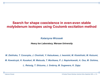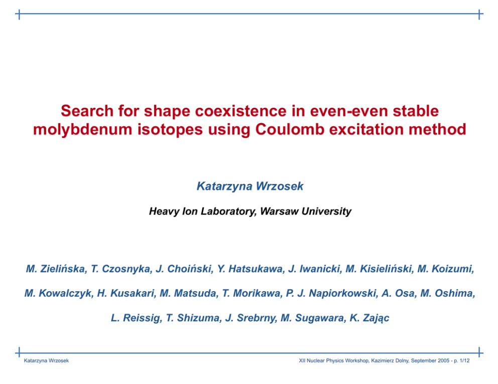 Search for shape coexistence in even-even stable molybdenum isotopes using Coulomb excitation method Katarzyna Wrzosek Heavy Ion Laboratory, Warsaw University M. Zielińska, T. Czosnyka, J. Choiński, Y. Hatsukawa, J. Iwanicki, M. Kisieli ński, M. Koizumi, M. Kowalczyk, H. Kusakari, M. Matsuda, T. Morikawa, P. J. Napiorkowski, A. Osa, M. Oshima, L. Reissig, T. Shizuma, J. Srebrny, M. Sugawara, K. Zajac ˛ Katarzyna Wrzosek XII Nuclear Physics Workshop, Kazimierz Dolny, September 2005 - p. 1/12 Motivation • • • • • Shape coexistence in medium mass nuclei was extensively studied during recent years. One of the interesting phenomena associated with shape coexistence is the occurence of low-lying 0+ states in even-even nuclei. In extreme cases the second 0+ state appears to be the first excited state. Among stable nuclei with Z > 20 only four of them have the 0+ first excited state, namely 72 Ge, 90 Zr, 96 Zr and 98 Mo. Coulomb excitation method allows to determine deformation parameters of an excited nucleus independently for each level. Shape parameters of the two lowest 0+ states in 96 Mo, 98 Mo, 100 Mo nuclei were inferred from Coulomb excitation data. Katarzyna Wrzosek XII Nuclear Physics Workshop, Kazimierz Dolny, September 2005 - p. 2/12 Coulomb excitation - basic facts • Colliding nuclei do not interact via nuclear forces - if the distance between nuclear surfaces is at least 5 fm, the strong interaction can be neglected (Cline’s empirical criterion). 238 U 40 • • • • Ar Trajectories of scattered nuclei are described classically. Energy transfer is small compared to the energy of the projectile. The excitation strength strongly depends on charges and masses of the collision partners, on beam energy and scattering angle. γ-radiation emitted by the Coulomb-excited nuclei carries the information on their internal structure. Katarzyna Wrzosek XII Nuclear Physics Workshop, Kazimierz Dolny, September 2005 - p. 3/12 Coulomb excitation set-ups The data were collected using two detection set-ups: • CUDAC (Coulex Universal Detector Array Chamber) at HIL (Poland). Ge detector Ge detector target PIN-diodes array Ge detector • 30 particle detectors placed at backward angles. • 3 γ-ray detectors. • The deexcitation γ rays measured in coincidence with backscattered particles. • GEMINI + LUNA detector array at JAERI (Tokai, Japan). Katarzyna Wrzosek XII Nuclear Physics Workshop, Kazimierz Dolny, September 2005 - p. 4/12 Experiments 2096 4 2 1870 2345 2 4 1625 1628 1498 1148 2 98 Mo 0 2 6 1432 1510 1759 2 735 0 4 2 96 Mo 778 787 2 0 0 40 Ar + 96 Mo (HIL, Warsaw, Poland) 20 Ne + 96 Mo (HIL, Warsaw, Poland) 96 Mo + nat Pb (JAERI, Tokai, Japan) 20 Ne + 98 Mo (HIL, Warsaw, Poland) 84 Kr + 98 Mo (JAERI, Tokai, Japan) 136 Xe + 98 Mo (JAERI, Tokai, Japan) Published: M.Zielińska et al., Acta Phys. Pol. B33, 515 (2002) M.Zielińska et al., Nucl. Phys A712, 79 (2002) M.Zielińska et al., Acta Phys. Pol. B36, 1289 (2005) K. Zajac, ˛ Acta Phys. Pol. B34 2241 (2003) K. Zajac, ˛ Int. J. Mod. Phys. E13 103 (2004) Katarzyna Wrzosek XII Nuclear Physics Workshop, Kazimierz Dolny, September 2005 - p. 5/12 Experiments 3 1908 1847 4 1136 1771 4 1463 2 0 6 1064 2 695 100 Mo 2 536 0 40 Ar + 100 Mo (HIL, Warsaw, Poland) 20 Ne + 100 Mo (HIL, Warsaw, Poland) Published: K.Wrzosek et al., Int. J. Mod. Phys. E14 359 (2005) Katarzyna Wrzosek XII Nuclear Physics Workshop, Kazimierz Dolny, September 2005 - p. 6/12 Matrix elements determination measured γ yields particle and γ detectors geometry level scheme available spectroscopic data minimization procedure GOSIA errors estimation set of matrix elements information for the sum rules code shape parameters for individual levels Katarzyna Wrzosek XII Nuclear Physics Workshop, Kazimierz Dolny, September 2005 - p. 7/12 Quadrupole Sum Rules method ... is based on a fact, that zero–coupled products of E2 operators are rotational invariants. Operator products may be expressed using the intermediate state expansion formula: 6+1 2+3 4++1 2+2 21 0+2 0+1 Katarzyna Wrzosek hQ2 i √ = hi |[E2 × E2]0 | ii = 5 ( X 2 1 p hikE2ktihtkE2kf i = Ii (2Ii + 1) t 2 If 0 It ) 6+1 2+3 4++1 2+2 21 0+2 0+1 XII Nuclear Physics Workshop, Kazimierz Dolny, September 2005 - p. 8/12 Quadrupole Sum Rules method To get information on triaxiality the higher order invariant is needed: r 2 3 Q hcos 3δi = hi |[E2 × E2]2 × E2]0 | ii = 35 ( ) X 2 2 2 1 hikE2kuihukE2ktihtkE2kii = (2Ii + 1) t,u Ii It Iu 6+1 2+3 4++1 2+2 21 0+2 0+1 Katarzyna Wrzosek 6+1 2++3 4+1 2+2 21 0+2 0+1 XII Nuclear Physics Workshop, Kazimierz Dolny, September 2005 - p. 9/12 Shape coexistence + ground state 0+ 1 is deformed while the excited state 0 2 is almost spherical. This behaviour is similar to the one observed in Ge isotopes and 96 Zr. • 96 Mo: • 98 Mo: the expectation value of Q2 is almost the same for the ground state and for the first excited state. • 100 Mo: the preliminary results show similar trend as observed in case of the isotope: the expectation value of Q2 is almost the same for both 0+ states. Deformation of 100 Mo seems to be larger compared to other Mo isotopes. 98 Mo 0.6 〈Q 2〉 [e2b2] 0+1 (ground state) + 0 2 (excited state) preliminary 0.4 0.2 0 72Ge Katarzyna Wrzosek 74Ge 76Ge 96Mo 98Mo 100Mo XII Nuclear Physics Workshop, Kazimierz Dolny, September 2005 - p. 10/12 Shape coexistence • The triaxiality seems to be the same for each of Ge isotopes. On the contrary, the 98 Mo is triaxial while the first excited state (0+ ground state (0+ 1 ) of 2 ) has a prolate shape. 〈cos(3δ )〉 1 prolate 0 0+1 state 0+2 state −1 Katarzyna Wrzosek 72Ge 74Ge 98Mo oblate XII Nuclear Physics Workshop, Kazimierz Dolny, September 2005 - p. 11/12 Conclusions and future plans • • • • In case of 96 Mo and 98 Mo the resulting sets of matrix elements were rich and precise enough to determine shape parameters of the two 0+ states. Data collected during two experiments performed at HIL wer