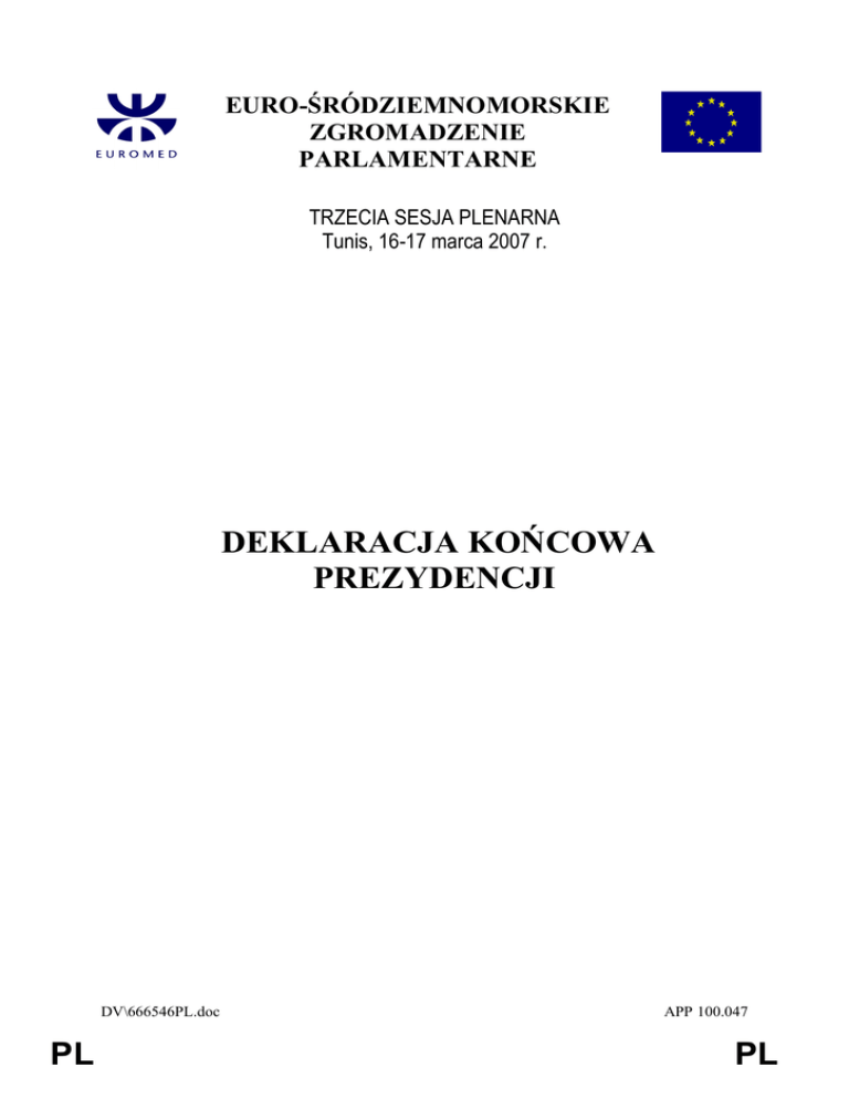 EURO-ŚRÓDZIEMNOMORSKIE ZGROMADZENIE PARLAMENTARNE TRZECIA SESJA PLENARNA Tunis, 16-17 marca 2007 r. DEKLARACJA KOŃCOWA PREZYDENCJI DV\666546PL.doc PL APP 100.047 PL ﻣﺘﻮﺳﻄﻲ-اﻟﻤﺠﻠﺲ اﻟﺒﺮﻟﻤﺎﻧﻲ اﻷورو Euro-śródziemnomorskie Zgromadzenie Parlamentarne Euro-Mediterranean Parliamentary Assembly Trzecia sesja Tunis, 16-17 marca 2007 r. Deklaracja końcowa prezydencji Trzecia sesja Euro-śródziemnomorskiego Zgromadzenia Parlamentarnego (EMPA) odbyła się w Tunisie w dniach 16-17 marca 2007 r., na zaproszenie Izby Deputowanych Republiki Tunezyjskiej oraz pod przewodnictwem Fouada MEBAZAY, przewodniczącego Izby Deputowanych Republiki Tunezyjskiej i przewodniczącego EMPA, z udziałem honorowych gości: - ministra spraw zagranicznych Republiki Tunezyjskiej; sekretarza generalnego Ligi Państw Arabskich; zastępcy ministra spraw zagranicznych Republiki Federalnej Niemiec do spraw europejskich; sekretarza generalnego Unii Państw Arabskich Maghrebu; dyrektora wykonawczego fundacji euro-śródziemnomorskiej „Anna Lindh na rzecz dialogu międzykulturowego”; głównego doradcy Komisji Europejskiej ds. współpracy regionalnej oraz członków EMPA (lista uczestników znajduje się w załączniku). Euro-śródziemnomorskie Zgromadzenie Parlamentarne (EMPA) jest zdania, że wyniki procesu barcelońskiego przyjęły już formę zdefiniowanych celów i ponownie wzywa posłów z państw euro-śródziemnomorskich do realizacji założeń owego procesu. W tym celu na forum komisji, grupy roboczej EMPA oraz komisji ad hoc ds. praw kobiet w państwach strefy euro-śródziemnomorskiej, jak również podczas sesji plenarnej, odbyto szereg debat na temat terroryzmu, sytuacji na Bliskim Wschodzie, dialogu cywilizacji i religii, migracji oraz rozwoju gospodarczego i społecznego. Na podstawie wniosków z debat oraz przyjętych zaleceń Euro-śródziemnomorskie Zgromadzenie Parlamentarne: - podtrzymuje opinię, że konflikt arabsko-izraelski może zostać rozwiązany jedynie poprzez osiągnięcie sprawiedliwego, globalnego i trwałego rozwiązania konfliktu izraelskopalestyńskiego, również na płaszczyźnie stosunków izraelsko-libańskich i izraelsko-syryjskich, przy poszanowaniu wszystkich wytycznych określonych na konferencji w Madrycie, w tym APP 100.047 PL 2/5 DV\666546PL.doc zasady oddania terytoriów w zamian za pokój opartej na rezolucji Rady Bezpieczeństwa Narodów Zjednoczonych oraz określonym harmonogramie (tzw. mapie drogowej); - jest zdania, że sytuacja ludności palestyńskiej wymaga dalszego udzielania jej podstawowej pomocy humanitarnej we współpracy ze społecznością międzynarodową oraz wzmocnienia instytucji palestyńskich; - pochwala przedłużenie tymczasowego mechanizmu międzynarodowego oraz zwraca się o zwiększenie jego środków oraz o przedłużenie czasu jego stosowania o niezbędny okres; - wyraża potępienie oraz głębokie oburzenie wobec aresztowania przewodniczącego Rady Legislacyjnej Palestyny AZIZA DWEIKA, członków rządu palestyńskiego oraz członków palestyńskiej Rady Legislacyjnej i zwraca się o ich natychmiastowe uwolnienie; - potępia porwanie żołnierzy izraelskich i zwraca się o ich natychmiastowe uwolnienie, jak również o uwolnienie wszystkich palestyńskich więźniów politycznych, poczynając od kobiet i nieletnich; - pochwala utworzenie palestyńskiego rządu jedności narodowej oraz jest zdania, że bez wątpienia stworzy on program odzwierciedlający założenia Kwartetu, wyraża nadzieję, że porozumienie to umożliwi ostateczne położenie kresu starciom zbrojnym, oraz zwraca się do obu stron o dołożenie wszelkich starań, by powstrzymać akty przemocy oraz utrzymać i rozszerzyć warunki zawieszenia broni; zwraca się do Izraela, zgodnie z decyzją Międzynarodowego Trybunału Sprawiedliwości, o zaprzestanie budowy muru oddzielającego Izrael od terytoriów palestyńskich; - wyraża zadowolenie z rezultatów konferencji międzynarodowej w sprawie Libanu w dniu 25 stycznia 2007 r. oraz wspiera wszelkie wysiłki dążące do odbudowy Libanu, a także kładzie nacisk na pozytywną rolę, jaką może odegrać demokratyczny i niepodległy Liban w rozwiązaniu kryzysu na Bliskim Wschodzie oraz w rozwoju partnerstwa eurośródziemnomorskiego; - wyraża opinię, że ataki terrorystyczne są niedopuszczalne w jakichkolwiek okolicznościach, a ich uzasadnieniem nie może być realizacja politycznych lub religijnych celów, oraz że walka z terroryzmem nie może w żaden sposób usprawiedliwiać napiętnowania jakiejkolwiek kultury, cywilizacji lub w szczególności religii; - zapoznało się z szesnastoma międzynarodowymi konwencjami i protokołami w sprawie walki z terroryzmem i wzywa wszystkie państwa, które ich jeszcze nie ratyfikowały, do niezwłocznej ratyfikacji; - wzywa do zorganizowania międzynarodowej konferencji pod patronatem ONZ w celu opracowania światowego kodeksu dobrych praktyk w walce z terroryzmem, co ułatwiłoby prowadzenie świadomego dialogu służącego określeniu wspólnego mianownika dla walki z tym zjawiskiem w wyważony sposób; - uważa za niezbędne wspieranie współpracy społeczności międzynarodowej w walce z terroryzmem oraz trwałe usuwanie jego przyczyn w oparciu o globalne podejście oparte na dialogu, solidarności i rozwoju; - wzywa kraje partnerskie oraz instytucje uczestniczące w procesie barcelońskim do ściślejszej współpracy – zarówno na płaszczyźnie humanitarnej, jak i gospodarczej oraz środowiskowej – w celu opracowania konkretnych rozwiązań problemu min lądowych i przeciwpiechotnych, rozmieszczonych na obszarze wielu państw w regionie, takich jak Egipt, Jordania, Liban, Tunezja i Algieria; - jest zdania, że powinien zostać rozpatrzony realistyczny plan finansowania programu współpracy, oraz wzywa do zwiększenia wysiłków w ramach negocjacji międzyrządowych w celu niesienia większej pomocy krajom dotkniętym proble