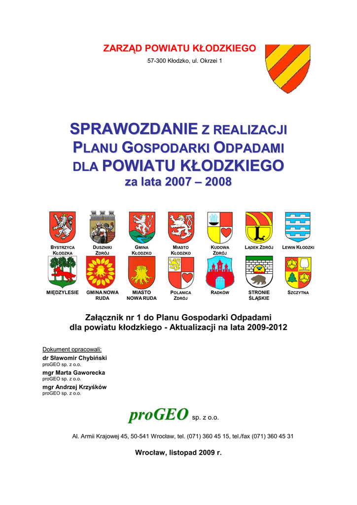 proGEO Sp. z o.o. Sprawozdanie z realizacji PLANU GOSPODARKI ODPADAMI DLA POWIATU KŁODZKIEGO ZARZĄD POWIATU KŁODZKIEGO 57-300 Kłodzko, ul. Okrzei 1 SPRAWOZDANIE Z REALIZACJI PLANU GOSPODARKI ODPADAMI DLA POWIATU KŁODZKIEGO za lata 2007 – 2008 BYSTRZYCA KŁODZKA DUSZNIKI ZDRÓJ GMINA KŁODZKO MIASTO KŁODZKO KUDOWA ZDRÓJ LĄDEK ZDRÓJ LEWIN KŁODZKI MIĘDZYLESIE GMINA NOWA RUDA MIASTO NOWA RUDA POLANICA ZDRÓJ RADKÓW STRONIE ŚLĄSKIE SZCZYTNA Załącznik nr 1 do Planu Gospodarki Odpadami dla powiatu kłodzkiego - Aktualizacji na lata 2009-2012 Dokument opracowali: dr Sławomir Chybiński proGEO sp. z o.o. mgr Marta Gaworecka proGEO sp. z o.o. mgr Andrzej Krzyśków proGEO sp. z o.o. proGEO sp. z o.o. Al. Armii Krajowej 45, 50-541 Wrocław, tel. (071) 360 45 15, tel./fax (071) 360 45 31 Wrocław, listopad 2009 r. proGEO Sp. z o.o. Sprawozdanie z realizacji PLANU GOSPODARKI ODPADAMI DLA POWIATU KŁODZKIEGO za lata 2007 - 2008 2 SPIS TREŚCI 1. W STĘP ............................................................................................................................3 1.1 Podstawa formalno-prawna .................................................................................3 1.2 Cel i zakres opracowania .....................................................................................4 2. CHARAKTERYSTYKA DEMOGRAFICZNA POWIATU KŁODZKIEGO .............................................4 3. ANALIZA STANU AKTUALNEGO GOSPODARKI ODPADAMI .......................................................6 3.1 Odbiór odpadów komunalnych............................................................................6 3.2 Selektywna zbiórka odpadów ..............................................................................8 3.2.1 3.3 Wytwarzanie odpadów komunalnych................................................................19 3.4 Gospodarowanie specyficznymi rodzajami odpadów komunalnych..............22 3.4.1 Odpady wielkogabarytowe i AGD .....................................................................................22 3.4.2 Odpady budowlane ...........................................................................................................22 3.4.3 Odpady zielone .................................................................................................................22 3.5 Gospodarowanie odpadami z sektora przemysłowego ...................................22 3.6 Bilans gospodarowania odpadami ....................................................................24 3.6.1 Wytwarzanie odpadów......................................................................................................24 3.6.2 Odzysk odpadów ..............................................................................................................25 3.6.3 Unieszkodliwianie odpadów ..............................................................................................26 3.7 4. Podsumowanie efektów selektywnej zbiórki .....................................................................16 Składowiska odpadów komunalnych................................................................28 3.7.1 Gospodarowanie odpadami na składowiskach komunalnych ..........................................28 3.7.2 Charakterystyka składowisk .............................................................................................34 3.7.3 Mogilniki przeterminowanych środków ochrony roślin ......................................................44 3.8 Pozostałe instalacje odzysku i unieszkodliwiania odpadów ...........................46 3.9 Inwentaryzacja azbestu ......................................................................................47 3.10 Współpraca międzygminna................................................................................49 SPRAWOZDANIE Z REALIZACJI ZADAŃ W LATACH 2007 - 2008............................................51 4.1 Zestawienia tabelaryczne zadań wg PGO .........................................................51 5. PODSUMOWANIE - REKOMENDACJE .................................................................................54 6. LITERATURA ...................................................................................................................58 proGEO Sp. z o.o. Sprawozdanie z realizacji PLANU GOSPODARKI ODPADAMI DLA POWIATU KŁODZKIEGO za lata 2007 - 2008 3 1. WSTĘP 1.1 Podstawa formalno-prawna Przedmiotem opracowania jest „Sprawozdanie z realizacji Planu Gospodarki Odpadami dla powiatu kłodzkiego za lata 2007 - 2008”. Niniejszy dokument opracowany został przez firmę proGEO sp. z o.o. z Wrocławia, na zlecenie Zarządu Powiatu Kłodzkiego, zgodnie z umową z dnia 6 kwietnia 2009 r. Zamówienie zostało zrealizowane w postaci dwóch dokumentów: 1) zasadniczego „Planu Gospodarki Odpadami dla powiatu kłodzkiego – Aktualizacja na lata 2009-2012 z uwzględnieniem lat 2013-2016”; 2) oraz załącznika do niego w postaci niniejszego „Sprawozdania z realizacji Planu Gospodarki Odpadami dla powiatu kłodzkiego za lata 2007 – 2008” Oba dokumenty łącznie stanowią kompletny Plan Gospodarki Odpadami dla powiatu kłodzkiego spełniający wymagania powiatowego planu gospodarki odpadami określone w ustawie o odpadach oraz rozporządzeniach wykonawczych do ustawy. Przy opracowywaniu niniejszego Sprawozdania brano pod uwagę następujące zagadnienia: 1) Ustawa Prawo ochrony środowiska (Dz.U. 25/2008 poz. 150) postawiła przed powiatem wymóg opracowania Programu ochrony środowiska - POŚ (art. 17). Częścią składową POŚ jest Plan gospodarki odpadami – PGO, opracowany zgodnie z ustawą o odpadach (Dz.U. 39/2007 poz. 251). 2) Zgodnie z ustawą o odpadach zarząd powiatu składa co 2 lata radzie powiatu i zarządowi województwa sprawozdanie z realizacji PGO (art. 14.13). Sprawozdanie powinno w szczególności oceniać i podsumowywać krótkoterminowy (4-letni) plan działania z oceną stopnia wykonania szczegółowych