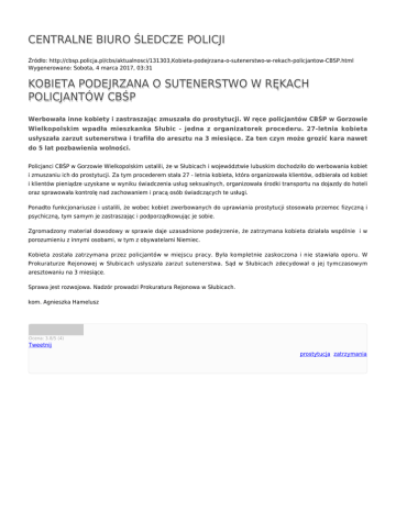 CENTRALNE BIURO ŚLEDCZE POLICJI Źródło: http://cbsp.policja.pl/cbs/aktualnosci/131303,Kobieta-podejrzana-o-sutenerstwo-w-rekach-policjantow-CBSP.html Wygenerowano: Sobota, 4 marca 2017, 03:31 KOBIETA PODEJRZANA O SUTENERSTWO W RĘKACH POLICJANTÓW CBŚP Werbowała inne kobiety i zastraszając zmuszała do prostytucji. W ręce policjantów CBŚP w Gorzowie Wielkopolskim wpadła mieszkanka Słubic - jedna z organizatorek procederu. 27-letnia kobieta usłyszała zarzut sutenerstwa i trafiła do aresztu na 3 miesiące. Za ten czyn może grozić kara nawet do 5 lat pozbawienia wolności. Policjanci CBŚP w Gorzowie Wielkopolskim ustalili, że w Słubicach i województwie lubuskim dochodziło do werbowania kobiet i zmuszaniu ich do prostytucji. Za tym procederem stała 27 - letnia kobieta, która organizowała klientów, odbierała od kobiet i klientów pieniądze uzyskane w wyniku świadczenia usług seksualnych, organizowała środki transportu na dojazdy do hoteli oraz sprawowała kontrolę nad zachowaniem i pracą osób świadczących te usługi. Ponadto funkcjonariusze i ustalili, że wobec kobiet zwerbowanych do uprawiania prostytucji stosowała przemoc fizyczną i psychiczną, tym samym je zastraszając i podporządkowując je sobie. Zgromadzony materiał dowodowy w sprawie daje uzasadnione podejrzenie, że zatrzymana kobieta działała wspólnie i w porozumieniu z innymi osobami, w tym z obywatelami Niemiec. Kobieta została zatrzymana przez policjantów w miejscu pracy. Była kompletnie zaskoczona i nie stawiała oporu. W Prokuraturze Rejonowej w Słubicach usłyszała zarzut sutenerstwa. Sąd w Słubicach zdecydował o jej tymczasowym aresztowaniu na 3 miesiące. Sprawa jest rozwojowa. Nadzór prowadzi Prokuratura Rejonowa w Słubicach. kom. Agnieszka Hamelusz Ocena: 3.8/5 (4) Tweetnij prostytucja, zatrzymania