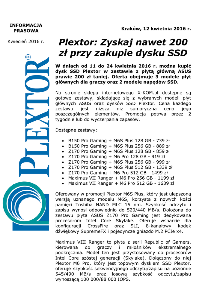INFORMACJA PRASOWA Kwiecień 2016 r. Kraków, 12 kwietnia 2016 r. Plextor: Zyskaj nawet 200 zł przy zakupie dysku SSD W dniach od 11 do 24 kwietnia 2016 r. można kupić dysk SSD Plextor w zestawie z płytą główną ASUS prawie 200 zł taniej. Oferta obejmuje 3 modele płyt głównych dla graczy oraz 2 modele napędów SSD. Na stronie sklepu internetowego X-KOM.pl dostępne są gotowe zestawy, składające się z wybranych modeli płyt głównych ASUS oraz dysków SSD Plextor. Cena każdego zestawu jest niższa niż sumaryczna cena jego poszczególnych elementów. Promocja potrwa przez 2 tygodnie lub do wyczerpania zapasów. Dostępne zestawy: B150 Pro Gaming + M6S Plus 128 GB - 739 zł B150 Pro Gaming + M6S Plus 256 GB - 889 zł Z170 Pro Gaming + M6S Plus 128 GB - 859 zł Z170 Pro Gaming + M6 Pro 128 GB - 919 zł Z170 Pro Gaming + M6S Plus 256 GB - 999 zł Z170 Pro Gaming + M6S Plus 512 GB - 1339 zł Z170 Pro Gaming + M6 Pro 512 GB - 1499 zł Maximus VII Ranger + M6 Pro 256 GB - 1199 zł Maximus VII Ranger + M6 Pro 512 GB - 1639 zł Oferowany w promocji Plextor M6S Plus, który jest ulepszoną wersją uznanego modelu M6S, korzysta z nowych kości pamięci Toshiba NAND MLC 15 nm. Szybkość odczytu i zapisu wynosi odpowiednio do 520/440 MB/s. Dołożona do zestawu płyta ASUS Z170 Pro Gaming jest dedykowana procesorom Intel Core Skylake. Oferuje wsparcie dla konfiguracji CrossFire oraz SLI, 8-kanałowy kodek dźwiękowy SupremeFX i pojedyncze gniazdo M.2 PCIe x4. Maximus VIII Ranger to płyta z serii Republic of Gamers, kierowana do graczy i miłośników ekstremalnego podkręcania. Model ten jest przystosowany do procesorów Intel Core szóstej generacji (Skylake). Dołączony do niej Plextor M6 Pro, który jest topowym dyskiem SSD Plextor, oferuje szybkość sekwencyjnego odczytu/zapisu na poziomie 545/490 MB/s oraz losową szybkość odczytu/zapisu wynoszącą 100 000/88 000 IOPS. INFORMACJA PRASOWA Kwiecień 2016 r. Firmy ASUS oraz Plextor są znane i cenione na polskim rynku. Ich produkty były wielokrotnie nagradzane za najwyższą wydajność w swojej klasie, najlepszy stosunek ceny do możliwości oraz design. Bezpośredni link do promocji: http://bit.ly/25UIQWl Tagi: dysk, SSD, Plextor, M6Pro, M6S+, wydajność, bezpieczeństwo, True Speed, Marvell, oferta specjalna, promocja, Asus, Z170, B150, Pro Gaming, Maximus, Ranger, X-KOM.pl O marce Plextor Plextor to wiodący producent, wielokrotnie nagradzanych, napędów optycznych i urządzeń pamięci masowej. Właścicielem marki jest japońska firma Shinano Kenshi. Od wprowadzenia na rynek pierwszego napędu CD-ROM, w roku 1989, Plextor wytrwale dąży do utrzymania wysokiej jakości i maksymalnej wydajności oferowanych produktów. Więcej informacji: www.plextor.com