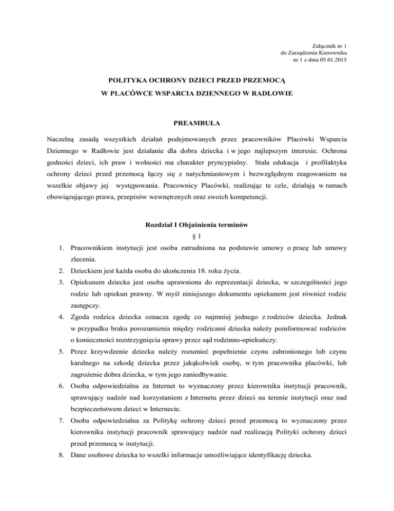 Załącznik nr 1 do Zarządzenia Kierownika nr 1 z dnia 05.01.2015 POLITYKA OCHRONY DZIECI PRZED PRZEMOCĄ W PLACÓWCE WSPARCIA DZIENNEGO W RADŁOWIE PREAMBUŁA Naczelną zasadą wszystkich działań podejmowanych przez pracowników Placówki Wsparcia Dziennego w Radłowie jest działanie dla dobra dziecka i w jego najlepszym interesie. Ochrona godności dzieci, ich praw i wolności ma charakter pryncypialny. Stała edukacja i profilaktyka ochrony dzieci przed przemocą łączy się z natychmiastowym i bezwzględnym reagowaniem na wszelkie objawy jej występowania. Pracownicy Placówki, realizując te cele, działają w ramach obowiązującego prawa, przepisów wewnętrznych oraz swoich kompetencji. Rozdział I Objaśnienia terminów §1 1. Pracownikiem instytucji jest osoba zatrudniona na podstawie umowy o pracę lub umowy zlecenia. 2. Dzieckiem jest każda osoba do ukończenia 18. roku życia. 3. Opiekunem dziecka jest osoba uprawniona do reprezentacji dziecka, w szczególności jego rodzic lub opiekun prawny. W myśl niniejszego dokumentu opiekunem jest również rodzic zastępczy. 4. Zgoda rodzica dziecka oznacza zgodę co najmniej jednego z rodziców dziecka. Jednak w przypadku braku porozumienia między rodzicami dziecka należy poinformować rodziców o konieczności rozstrzygnięcia sprawy przez sąd rodzinno-opiekuńczy. 5. Przez krzywdzenie dziecka należy rozumieć popełnienie czynu zabronionego lub czynu karalnego na szkodę dziecka przez jakąkolwiek osobę, w tym pracownika placówki, lub zagrożenie dobra dziecka, w tym jego zaniedbywanie. 6. Osoba odpowiedzialna za Internet to wyznaczony przez kierownika instytucji pracownik, sprawujący nadzór nad korzystaniem z Internetu przez dzieci na terenie instytucji oraz nad bezpieczeństwem dzieci w Internecie. 7. Osoba odpowiedzialna za Politykę ochrony dzieci przed przemocą to wyznaczony przez kierownika instytucji pracownik sprawujący nadzór nad realizacją Polityki ochrony dzieci przed przemocą w instytucji. 8. Dane osobowe dziecka to wszelki informacje umożliwiające identyfikację dziecka. Rozdział II Rozpoznawanie i reagowanie na czynniki ryzyka stosowania przemocy wobec dzieci §2 1. Pracownicy placówki posiadają wiedzę i w ramach wykonywanych obowiązków zwracają uwagę na czynniki ryzyka krzywdzenia dzieci. 2. W przypadku zidentyfikowania czynników ryzyka pracownicy placówki podejmują rozmowę z rodzicami, przekazując informacje na temat dostępnej oferty wsparcia i motywując ich do szukania dla siebie pomocy. 3. Pracownicy monitorują sytuację i dobrostan dziecka. Rozdział III Procedury interwencji w przypadku wystąpienia przemocy wobec dziecka §3 1. W przypadku podjęcia przez pracownika instytucji podejrzenia, że dziecko jest ofiarą przemocy pracownik ma obowiązek sporządzenia notatki służbowej i przekazania uzyskanej informacji do kierownika placówki. §4 1. Kierownik Placówki wzywa opiekunów dziecka, którego krzywdzenie podejrzewa oraz informuje ich o podejrzeniu. 2. Kierownik ze współpracy z wychowawcami powinien sporządzić opis sytuacji szkolnej i rodzinnej dziecka na podstawie rozmów z dzieckiem oraz osobami mającymi wiedzę na temat dziecka- pracownikami współpracujących z Placówką instytucji , oraz plan pomocy dziecku. 3. Plan pomocy dziecku powinien zawierać wskazania dotyczące: a. podjęcia przez instytucję działań w celu zapewnienia dziecku bezpieczeństwa, w tym zgłoszenie podejrzenia przemocy wobec dziecka do odpowiedniej instytucji; b. wsparcia, jakie placówka zaoferuje dziecku; c. skierowania dziecka do specjalistycznej placówki pomocy dziecku, jeżeli istnieje taka potrzeba. §5 1. W przypadkach bardziej skomplikowanych (dotyczących wykorzystywania seksualnego oraz znęcania się fizycznego i psychicznego o dużym nasileniu) Kierownik powołuje zespół interwencyjny, w skład którego mogą wejść: wychowawcy lub pracownicy innych instytucji działających na rzecz dziecka i rodziny, w tym pracownicy szkoły do której uczęszcza dziecko- mający wiedzę o krzywdzeniu dziecka lub o dziecku (dalej określani jako: zespół interwencyjny). 2. Zespół interwencyjny sporządza plan pomocy dziecku, spełniający wymogi określone w § 4 pkt. 3 Polityki, na podstawie opisu sporządzonego przez kierownika placówki oraz innych, uzyskanych przez członków zespołu informacji. 3. W przypadku gdy podejrzenie krzywdzenia zgłosili opiekunowie dziecka, powołanie zespołu jest obligatoryjne. Zespół interwencyjny wzywa opiekunów dziecka na spotkanie wyjaśniające, podczas którego może zaproponować opiekunom zdiagnozowanie zgłaszanego podejrzenia w zewnętrznej, bezstronnej instytucji. Ze spotkania sporządza się protokół. §6 1. Plan pomocy dziecku jest przedstawiany przez kierownika opiekunom dziecka z zaleceniem współpracy przy jego realizacji. 2. Kierownik informuje opiekunów o obowiązku zgłoszenia podejrzenia krzywdzenia dziecka do odpowiedniej instytucji (prokuratura/policja lub sąd rodzinno-opiekuńczy, lub przewodniczący zespołu interdyscyplinarnego – procedura „Niebieskie Karty”).\ 3. Po poinformowaniu opiekunów przez kierownika – zgodnie z punktem poprzedzającym – kierownik instytucji składa zawiadomienie o podejrzeniu przestępstwa do prokuratury/policji lub wniosek o wgląd w sytuację rodziny do sądu rejonowego, wydziału rodzinnego i nieletnich, lub przesyła formularz „Niebieska Karta – A” do przewodniczącego zespołu interdyscyplinarnego. 4. Dalszy tok postępowania leży w kompetencjach instytucji wskazanych w punkcie poprzedzającym. 5. W przypadku gdy podejrzenie krzywdzenia zgłosili opiekunowie dziecka a podejrzenie to nie zostało potwierdzone, należy o tym fakcie poinformować opiekunów dziecka na piśmie. §7 1. Z przebiegu interwencji sporządza się kartę interwencji, której wzór stanowi załącznik nr 1 do niniejszej Polityki. Kartę załącza się do akt osobowych dziecka. 2. Wszyscy prac