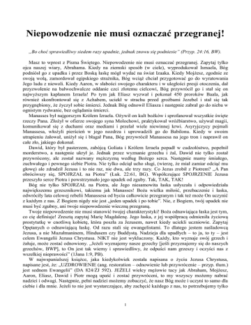 Niepowodzenie nie musi oznaczać przegranej! „Bo choć sprawiedliwy siedem razy upadnie, jednak znowu się podniesie” (Przyp. 24:16, BW). Masz to wprost z Pisma Świętego. Niepowodzenie nie musi oznaczać przegranej. Zapytaj tylko ojca naszej wiary, Abrahama. Kiedy na ziemski sposób (w ciele), wyprodukował Ismaela, Bóg podniósł go z upadku i przez Boską łaskę mógł wydać na świat Izaaka. Kiedy Mojżesz, zgodnie ze swoją wolą, zamordował egipskiego strażnika, Bóg wciąż chciał przygotować go do wyratowania Jego ludu z niewoli. Kiedy Aaron, w słabości swojego charakteru i w uległości presji otoczenia, dał przyzwolenie na bałwochwalcze oddanie czci złotemu cielcowi, Bóg przywrócił go i stał się on najwyższym kapłanem Izraela! Po tym jak Eliasz wyzwał i pokonał 450 proroków Baala, jak również skonfrontował się z Achabem, uciekł w strachu przed groźbami Jezebel i stał się tak przygnębiony, że życzył sobie śmierci. Jednak Bóg odnowił Eliasza i następnie zabrał go do nieba w ognistym rydwanie, bez oglądania śmierci. Manasses był najgorszym Królem Izraela. Ożywił on kult bożków i sprofanował wszystkie święte rzeczy Pana. Złożył w ofierze swojego syna Molochowi, praktykował wróżbiarstwo, używał magii, komunikował się z duchami oraz mediami i przelał wiele niewinnej krwi. Asyryjczycy pojmali Manassesa, włożyli pierścień w jego nozdrza i uprowadzili go do Babilonu. Kiedy w swoim utrapieniu żałował, uniżył się i błagał Pana, Bóg przywrócił Manassesa na jego tron i naprawił on całe zło, jakiego dokonał. Dawid, który był pasterzem, zabójcą Goliata i Królem Izraela popadł w cudzołóstwo, popełnił morderstwo, a następnie ukrył je. Jednak przez wyznanie grzechu i żal, Dawid nie tylko został przywrócony, ale został nazwany mężczyzną według Bożego serca. Następnie mamy śmiałego, zuchwałego i pewnego siebie Piotra. Nie tylko odciął ucho sługi, (wierzę, że miał zamiar odciąć mu głowę) ale zdradził Jezusa i to nie raz, nie dwa, ale trzy razy. Co Jezus zrobił z Piotrem? „A Pan obróciwszy się, SPOJRZAŁ na Piotra” (Łuk. 22:61, BG). Współczujące SPOJRZENIE Jezusa przeszyło serce Piotra i powstrzymało jego upadek od zguby. Tak, TAK, TAK! Bóg nie tylko SPOJRZAŁ na Piotra, ale Jego niesamowita łaska usłyszała i odpowiedziała największemu grzesznikowi, takiemu jak Manasses! Boża wielka miłość, przebaczenie i łaska, odwróciły lata celowej rebelii Manassesa od bycia całkowicie przegranym i tak też może On uczynić z każdym z nas. Z Bogiem nigdy nie jest „jeden upadek i po tobie”. Nie, z Bogiem, twój upadek nie musi być zgubny, ani twoje niepowodzenie wieczną przegraną. Twoje niepowodzenie nie musi stanowić twojej charakterystyki! Boża odnawiająca łaska jest tym, co cię definiuje! Zresztą zapytaj Marię Magdalenę. Jego łaska, z jej współpracą odmieniła życiową prostytutkę w cnotliwą kobietę, która poszła za Jezusem, nawet kiedy uciekli uczniowie. Zapytaj Opętanych o odnawiającą łaskę. Od razu stali się ewangelistami. To dlatego jestem naśladowcą Jezusa, a nie Muzułmaninem, Hindusem czy Buddystą. Nadzieja dla upadłych – to ja, to ty – jest celem Ewangelii Jezusa Chrystusa. NIKT nie jest wykluczony. Każdy, kto wyznaje swój grzech i żałuje, może zostać odnowiony. „Jeżeli wyznajemy nasze grzechy [jeśli przyznajemy się do naszych grzechów, BWP], to On jest tak wierny i sprawiedliwy, że odpuści nam grzeszy i oczyści nas z wszelkiej nieprawości” (1Jana 1:9, PB). W najwspanialszej książce, jaka kiedykolwiek została napisana o życiu Jezusa Chrystusa, napisane jest, że: „UZDROWIENIE (ang. restoration – odnowienie lub przywrócenie – przyp. tłum.) jest sednem Ewangelii” (DA 824/ŻJ 592). JEŻELI wielcy mężowie tacy jak Abraham, Mojżesz, Aaron, Eliasz, Dawid i Piotr mogą upaść i zostać przywróceni, to my wszyscy możemy nabrać nadziei i odwagi. Następnie, pełni nadziei możemy zobaczyć, że nasz Bóg może i uczyni to samo dla ciebie i dla mnie. Jeżeli to nie jest wystarczające, aby zachęcić każdego z nas, to potrzebujemy tylko 1 spojrzeć na najgorszego z ich Króli – Manassesa. Pomimo głębokości jego całkowitej deprawacji i podłości, Bóg przywrócił go na tron i użył go, aby cofnąć wszystko, co uczynił. Bóg chce użyć naszych porażek, aby nas uczyć, a nie pozostawiać w nich! Bóg przez Swoją przywracającą łaskę chce nas zachęcić do Powstania, Wyznania naszego grzechu, Żałowania i abyśmy teraz zostali Jego narzędziem sprawiedliwości. To właśnie mówi mi Bóg, przez porażki tych siedmiu mężczyzn. – Nie pozostawaj zakładnikiem twoich niepowodzeń. Mam plan dla twojego życia! Możesz mieć przyszłość ze Mną! U Mnie nigdy nie obowiązuje zasada: „Raz zawiedziesz i po tobie”. To właśnie szatan powiedział Judaszowi. To nie jest ewangelią – zbawczą ewangelią Jezusa Chrystusa. Nie, to nie oznacza, że jak zgrzeszyłeś, to zawsze już będziesz grzeszył. Czy my wszyscy możemy czerpać odwagę z tych Biblijnych przykładów charakterów? Mogliśmy zostać przewróceni, ale nie jesteśmy znokautowani! Bóg tych siedmiu mężczyzn jest również naszym Bogiem, w szczególności w czasie naszych upadków. Rozważ, co Jezus powiedział Piotrowi w pokoju na górze, w noc przed tym jak został On ukrzyżowany: „Szymonie, Szymonie, oto szatan wyprosił sobie, aby was przesiać jak pszenicę. Ja zaś prosiłem za tobą, aby nie ustała wiara twoja, a ty, gdy się kiedyś nawrócisz, utwierdzaj braci swoich” (Łuk. 22:31-32, BW). Tak, kogokolwiek Bóg odnawia, przywraca go do Siebie i używa. Prorok Micheasz potwierdza to kiedy mówi: „Nie wesel się ze mnie, nieprzyjaciółko moja! Jeślim upadł, powstanę; jeśli siedzę w ciemnościach, Pan jest światłością moją. (…) Wywiedzie mnie na światło, ujrzę sprawiedliwość Je