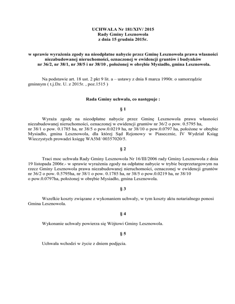 UCHWAŁA Nr 181/XIV/ 2015 Rady Gminy Lesznowola z dnia 15 grudnia 2015r. w sprawie wyrażenia zgody na nieodpłatne nabycie przez Gminę Lesznowola prawa własności niezabudowanej nieruchomości, oznaczonej w ewidencji gruntów i budynków nr 36/2, nr 38/1, nr 38/5 i nr 38/10 , położonej w obrębie Mysiadło, gmina Lesznowola. Na podstawie art. 18 ust. 2 pkt 9 lit. a – ustawy z dnia 8 marca 1990r. o samorządzie gminnym ( t.j.Dz. U. z 2015r. , poz.1515 ) Rada Gminy uchwala, co następuje : §1 Wyraża zgodę na nieodpłatne nabycie przez Gminę Lesznowola prawa własności niezabudowanej nieruchomości, oznaczonej w ewidencji gruntów nr 36/2 o pow. 0.5795 ha, nr 38/1 o pow. 0.1785 ha, nr 38/5 o pow.0.0219 ha, nr 38/10 o pow.0.0797 ha, położone w obrębie Mysiadło, gmina Lesznowola, dla której Sąd Rejonowy w Piasecznie, IV Wydział Ksiąg Wieczystych prowadzi księgę WA5M/ 00357020/5. §2 Traci moc uchwała Rady Gminy Lesznowola Nr 16/III/2006 rady Gminy Lesznowola z dnia 19 listopada 2006r.- w sprawie wyrażenia zgody na odpłatne nabycie w trybie bezprzetargowym na rzecz Gminy Lesznowola prawa niezabudowanej nieruchomości, oznaczonej w ewidencji gruntów nr 36/2 o pow. 0.5795ha, nr 38/1 o pow. 0.1785 ha, nr 38/5 o pow.0.0219 ha, nr 38/10 o pow.0.0797ha, położonej w obrębie Mysiadło, gmina Lesznowola. §3 Wszelkie koszty związane z wykonaniem uchwały, w tym koszty aktu notarialnego ponosi Gmina Lesznowola. §4 Wykonanie uchwały powierza się Wójtowi Gminy Lesznowola. §5 Uchwała wchodzi w życie z dniem podjęcia. UZASADNIENIE Nieodpłatne nabycie niezabudowanej nieruchomości opisanej w § 1 , stanowiącej własność Skarbu Państwa podyktowane jest społeczną potrzebą realizacji zadań własnych Gminy Lesznowola w tym rejonie.
