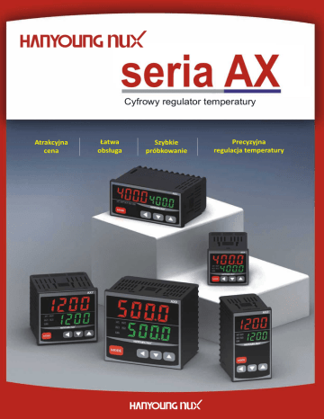Cyfrowy regulator temperatury Atrakcyjna cena Łatwa obsługa Szybkie próbkowanie Precyzyjna regulacja temperatury Bardzo dokładna regulacja temperatury Wysoka dokładność wyświetlania wartości temperatury Powiększona do ±0.3 % zakresu 0.3 % zakresu Szybkie odświeżanie Uzyskano lepszą regulację temperatury dzięki skróceniu cyklu próbkowania (0.1 s) Sygnał z czujnika 0.1s Krótki czas cyklu sec Wyjście sterujące Grzejnik SSR Rozdzielczość wskazań 0.1 °C/0.1 °F Możliwość wskazań w stopniach Celsjusza lub Fahrenheita (zmiana parametru w menu nastaw) 0.1 / 0.1 Cyfrowy regulator temperatury Nowa rodzina, łącząca niską cenę, łatwość obsługi, dużą szybkość próbkowania i wysoką dokładność regulacji. Dla wygody użytkownika, seria AX została standardowo wyposażona w najczęściej wykorzystywane, niezbędne funkcje. Dodatkowo, wysoka dokładność regulacji została połączona z dużą szybkością próbkowania. Łatwa konfiguracja Wyjście Przekaźnikowe, 3 styki* (sposób ustawienia: wyjście/alarm1/alaram2/LBA) SSR, 1 styk (wbudowane standardowo) Wejście uniwersalne *Wyjście przekaźnikowe może posiadać maksymalnie 3 styki, które można skonfigurować jako wyjście sterujące, wyjście alarmowe 1, wyjście alarmowe 2, wyjście alarmowe przerwania pętli (LBA) Termopara Rodzaj sterowania Autotuning PID lub ON-OFF (włączony-wyłączony) Czujnik rezystancyjny Kierunek regulacji Do wyboru: sterowanie rewersyjne (grzanie) lub sterowanie bezpośrednie (chłodzenie) Dokładność wyświetlacza zakresu Próbkowanie Funkcje wyświetlacza Jednoczesne wyświetlanie wartości procesu (PV) i wartości zadanej (SV) na 4-cyfrowych wyświetlaczach Wyświetlanie temperatury w stopniach Celsjusza lub Fahrenheita Ustawiane położenie przecinka dziesiętnego (rozdzielczość 0.1° lub 1°) Nowa głębokość instalacyjna 63 mm. umożliwia użytkownikom minimalizację przestrzeni instalacyjnej dzięki zaprojektowaniu regulatorów o głębokości 63 mm. Dlatego, zarówno płyta czołowa jak i całe urządzenie sterujące mogą mieć odpowiednio mniejsze wymiary. Cyfrowy regulator temperatury Typy i kody regulatorów Multi wejście Czujnik typu K, J lub Pt100 Typ Kod AX Multi wyjście Przekaźnikowe lub SSR Duża szybkość próbkowania (0,1 s) Głębokość instalacyjna: 63 mm Wybór kierunku regulacji: grzanie/chłodzenie Automatyczne strojenie w trybie P.I.D Alarm przerwania pętli (LBA) Rodzaj wejścia Rodzaj wyjścia 2 3 4 7 9 1 2 3 4 Zasilanie A Opis Cyfrowy regulator temperatury (Multi wejście: K, J, Pt100 Ω AX2: 48 x 96 mm AX3: 96 x 48 mm AX4: 48 x 48 mm AX7: 72 x 72 mm AX9: 96 x 96 mm Przekaźnik 1 + przekaźnik 2 + SSR 1 stykowy Przekaźnik 1 + przekaźnik 2 + przekaźnik 3 + SSR 1 stykowy 4-20 mA + przekaźnik 2 4-20 mA + przekaźnik 2 + przekaźnik 3 + styk SSR 100 ~ 240 V AC, 50/60 Hz *W zależności od ustawionej wartości parametru w menu nastaw regulatora, wyjście przekaźnikowe może być wyjściem sterującym, alarmowym lub alarmowym przerwania pętli (LBA). Opis płyty czołowej Wskaźnik stanu pracy Wartość procesu (PV) Wartość zadana (PV) Przycisk trybu pracy regulatora Lp. 1 2 3 Przycisk “do góry” Przycisk “w dół” Przycisk przesuwania kursora 4 5 6 7 Nazwa Opis Wartość aktualnej temperatury na ekranie operacyjnym Wartość zadanej temperatury na ekranie Wartość zadana (SV) operacyjnym Zwiększa ustawioną wartość na ekranie i Przycisk do góry przełącza parametr w trybie zmiany nastaw Zwiększa ustawioną wartość i przełącza parametr w Przycisk w dół trybie zmiany nastaw Przycisk przesuwania Zmienia ustawianą cyfrę w ramach wartości zadanej. Przełącza pomiędzy ekranem operacyjnym, ekranem kursora nastaw użytkownika i ekranem nastaw inżyniera Przełącza pomiędzy ekranem operacyjnym, ekranem Przycisk trybu pracy nastaw użytkownika i ekranem nastaw inżyniera regulatora Świeci w trakcie strojenia automatycznego trybu PID Świeci, gdy wyjście jest aktywne Wskaźnik Świeci, gdy pierwsze wyjście alarmowe jest aktywne stanu pracy Świeci, gdy drugie wyjście alarmowe jest aktywne Świeci, gdy alarm przerwania pętli (LBA) jest aktywny Wartość procesu (PV) Dane techniczne Wymiary W x H x D (mm) Typ wejścia Cykl próbkowania Impedancja wejściowa Dopuszczalna rezystancja Maks. napięcie wejściowe Dokładność wyświetlania Wyświetlacz Multi (Termopara: K, J, IEC584-1; Czujnik rezystancyjny PT100 Ω, IEC751) 100 ms maks. 1 MΩ 10 Ω / pojedynczy przewód (czujnik rezystancyjny). Rezystancja wszystkich przewodów musi być identyczna. 10 V DC ±0.3 % zakresu 7-segmentowy LED (wartość procesu PV: czerwony, wartość zadana SV: zielony) Wymiary wyświetlacza Rozdzielczość · Termopara: 0.1 °C (TC-K2, TC-J), 0.5 °C (TC-K1) Czujnik rezystancyjny: 0.03 °C (0.1 °F) min 20MΩ, 500V d.c. przez 1 min (pomiędzy zaciskami wejścia/wyjścia) Rezystancja izolacji Wytrzymałość napięciowa izolacji 2300 V AC, 50/60 Hz, przez 1 min (pomiędzy zaciskami wejścia/wyjścia) Rodzaj sterowania Ustawianie ręczne Kierunek regulacji PID z auto-tuning strojeniem lub ON-OFF (włączony-wyłączony) W zakresie 0 % ~ 100 % Sterowanie rewersyjne (grzanie) lub sterowanie bezpośrednie (chłodzenie) ustawiane za pomocą parametru w menu nastaw Przekaźnikowe 1a (normalnie otwarte), 3 A 240 V AC, 3 A 30 V DC, obciążenie rezystancyjne SSR [dla sterowania czasowo-proporcjonalnego (CYC)] SSR [dla sterowania fazowego (PHR)] 0/12 V DC, impuls napięciowy, rezystancja obciążenia > 600 Ω Wyjście Zasilanie Odporność na wibracje mechaniczne 100 ~ 240 V AC, 50/60 Hz ± 10 % wartości znamionowej maks. 5.5 VA - 5 °C ~ + 50 °C wilg. względna. 35 ~ 85 % (bez kondensacji) 0.75 mm w zakresie częstotliwości 10 ~ 55 Hz, w kierunku każdej z osi (X, Y, Z), przez 2 godziny Odporność na udary mechaniczne 3 krotnie, 300 m/s2 w każdym z kierunków Dop. fluktuacja napięcia zasilającego Pobór mocy Zakres temp. otoczenia Za