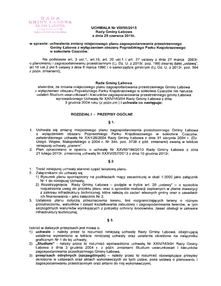 HADA ·., G MINY LA ~jOW A :n .:i:Hi L'> r:owA } ' ' \I. Id ! 11 ' 11_1, , >·· J,;~ k1 WOj.;\ • ..Jd.:r;.1.,·o ni..J,_;1;~bk 1a UCHWAŁA Nr Vlll/55/2015 Rady Gminy Łabowa z dnia 25 czerwca 2015r. w sprawie: uchwalenia zmiany miejscowego planu zagospodarowania przestrzennego Gminy Łabowa z wyłączeniem obszaru Popradzkiego Parku Krajobrazowego w sołectwie Czaczów. Na podstawie art. 3 ust.1, art.15, art. 20 ust.1 i art. 27 ustawy z dnia 27 marca 2003r. o planowaniu i zagospodarowaniu przestrzennym (t.j . Dz. U. z 2015r. poz. 199) zwanej dalej „ ustawą'', art.18 ust.2 pkt 5 ustawy z dnia 8 marca 1990 ro samorządzie gminnym (t.j. Dz. U. z 2013r. poz. 594 z późn. zmianami), Rada Gminy Łabowa stwierdza, że zmiana miejscowego planu zagospodarowania przestrzennego Gminy Łabowa z wyłączeniem obszaru Popradzkiego Parku Krajobrazowego w sołectwie Czaczów nie narusza ustaleń Studium uwarunkowań i kierunków zagospodarowania przestrzennego gminy Łabowa wprowadzonego Uchwałą Nr XXIV/163/04 Rady Gminy Łabowa z dnia 3 grudnia 2004 roku (z późn .zm. ) i uchwala co następuje: ROZDZIAŁ I - PRZEPISY OGÓLNE § 1. 1. Uchwala się zmianę m1e1scowego planu zagospodarowania przestrzennego Gminy Łabowa z wyłączeniem obszaru Popradzkiego Parku Krajobrazowego w sołectwie Czaczów, zatwierdzonego uchwałą Nr XX/128/2004 Rady Gminy Łabowa z dnia 31 sierpnia 2004 r. (Dz. Urzęd . Wojew. Małopolskiego z 2004 r. Nr 344, poz. 3738 z póź. zmianami) zwaną w tekście niniejszej uchwały „planem". 2. Plan opracowano w oparciu o uchwałę Nr XXVlll/199/2013 Rady Gminy Łabowa z dnia 21lutego2013r. zmienioną uchwałą Nr XXXV/257/2013 z dnia 10 grudnia 2013r. §2. 1. 2. Treść niniejszej uchwały stanowi część tekstową Załącznikami do uchwały są: planu. 1) Rysunek planu sporządzony na podkładach mapy zasadniczej w skali 1:2000 jako załącznik Nr 1 do niniejszej Uchwały, 2) Rozstrzygnięcia Rady Gminy Łabowa - podjęte w trybie art. 20 „ustawy" - o sposobie rozpatrzenia uwag do projektu planu oraz o sposobie realizacji zapisanych w planie inwestycji z zakresu infrastruktury technicznej , które należą do zadań własnych gminy oraz o zasadach ich finansowania - jako załącznik Nr 2. 3. Ustalenia planu dotyczą przeznaczenia terenu , linii rozgraniczających tereny o różnym przeznaczeniu, warunków i zasad kształtowania zabudowy i zagospodarowania terenów, w tym szczególnych warunków wynikających z potrzeby ochrony środowiska , zasad obsługi w zakresie infrastruktury technicznej. § 3. Ilekroć w dalszych przepisach jest mowa o: 1) uchwale - należy przez to rozumieć nm1e1szą uchwałę Rady Gminy Łabowa, obejmującą ustalenia wymienione w tekście niniejszej uchwały oraz ustalenia określone na załączn iku graficznym Nr 1 do tej uchwały, 2) „Studium" - należy przez to rozumieć wprowadzone uchwałą Nr XXIV/163/04 Rady Gminy Łabowa z dnia 3 grudnia 2004 r. z późn . zmianami Studium uwarunkowań i kierunków zagospodarowania przestrzennego Gminy Łabowa , 3) przepisach odrębnych (szczególnych) - należy przez to rozumieć obowiązujące przepisy określone w ustawach oraz aktach wykonawczych do tych ustaw, poza ustawą o planowaniu i zagospodarowaniu przestrzennym oraz aktam i do niej wykonawczym i, 4) 5) 6) 7) 8) 9) 10) 11) przeznaczeniu podstawowym - rozumie się przez to takie przeznaczenie, które przeważa na danym terenie, wyznaczonym liniami rozgraniczającymi, przeznaczeniu dopuszczalnym - rozumie się przez to przeznaczenie inne niż podstawowe, które nie powoduje kolizji z przeznaczeniem podstawowym, linii rozgraniczającej - należy przez to rozumieć linię ciągłą na rysunku planu, rozdzielającą obszar na tereny o różnych funkcjach lub różnych zasadach i warunkach zagospodarowania, powierzchni zabudowy - należy przez to rozumieć powierzchn ię budynków, liczoną nad terenem po zewnętrznym obrysie przegród zewnętrznych . Do powierzchni zabudowy nie wlicza się części budynków nadwieszonych nad terenem takich jak balkon i wykusz, średnim poziomie terenu - rozumie się przez to średnią arytmetyczną poziomów terenu od strony przystokowej i odstokowej liczoną w obrysie rzutu budynku, wysokości zabudowy (obiektu) - rozumie się przez to wymiar pionowy mierzony od średniego poziomu terenu do najwyższej głównej kalenicy dachu, dachu namiotowym - rozumie się przez to dach wielospadowy o trójkątnych połaciach, zbiegających się w jednym wierzchołku, dachu płaskim - rozumie się przez to dach o kącie nachylenia połac i dachowych w przedziale od O do 5 stopni. ROZDZIAŁ li - USTALENIA OGÓLNE §4. Ustalenia w zakresie ochrony środowiska i krajobrazu. utrzymanie wysokich standardów środowiska przyrodniczego, w szczegól ności wód , powietrza atmosferycznego, gleb. 2. Obowiązuje zakaz przekraczania dopuszczalnych stężeń zanieczyszczeń atmosferycznych, określonych w przepisach odrębnych. 3. W zakresie ochrony przed hałasem obowiązuje, zgodnie z przepisami odrębnymi , przestrzeganie dopuszczalnych poziomów hałasu w środowisku dla terenu objętego planem i oznaczonego symbolem UP/MN - jak dla terenów przeznaczonych na cele mieszkaniowo-usługowe. 4. W związku z położeniem terenu objętego planem w Południowomałopolsk im Obszarze Chronionego Krajobrazu, obowiązują ustalenia oraz zakazy - zgodnie z uchwałą Nr XVlll/299/12 Małopolskiego z dnia 27 lutego 2012r. w sprawie Sejmiku Województwa Południowomałopolskiego Obszaru Chronionego Krajobrazu (Dz. Urzędowy Wojew. Małopolskiego z 20 marca 2012r. poz. 1194). 5. Teren objęty planem położony jest w obszarze ochrony siedlisk Natura 2000 pn. „Łabowa" o kodzie PLH120036. Obowiązuje ochrona cennych gatunków zwierząt oraz ich siedlisk o znaczeniu dla obszaru Natura 2000 zgodnie z przepisami odrębnymi w zakresie problematyki odnoszącej się do obszaru objętego niniejszym planem. Dla w/w terenu - w zakresie oddziaływania i